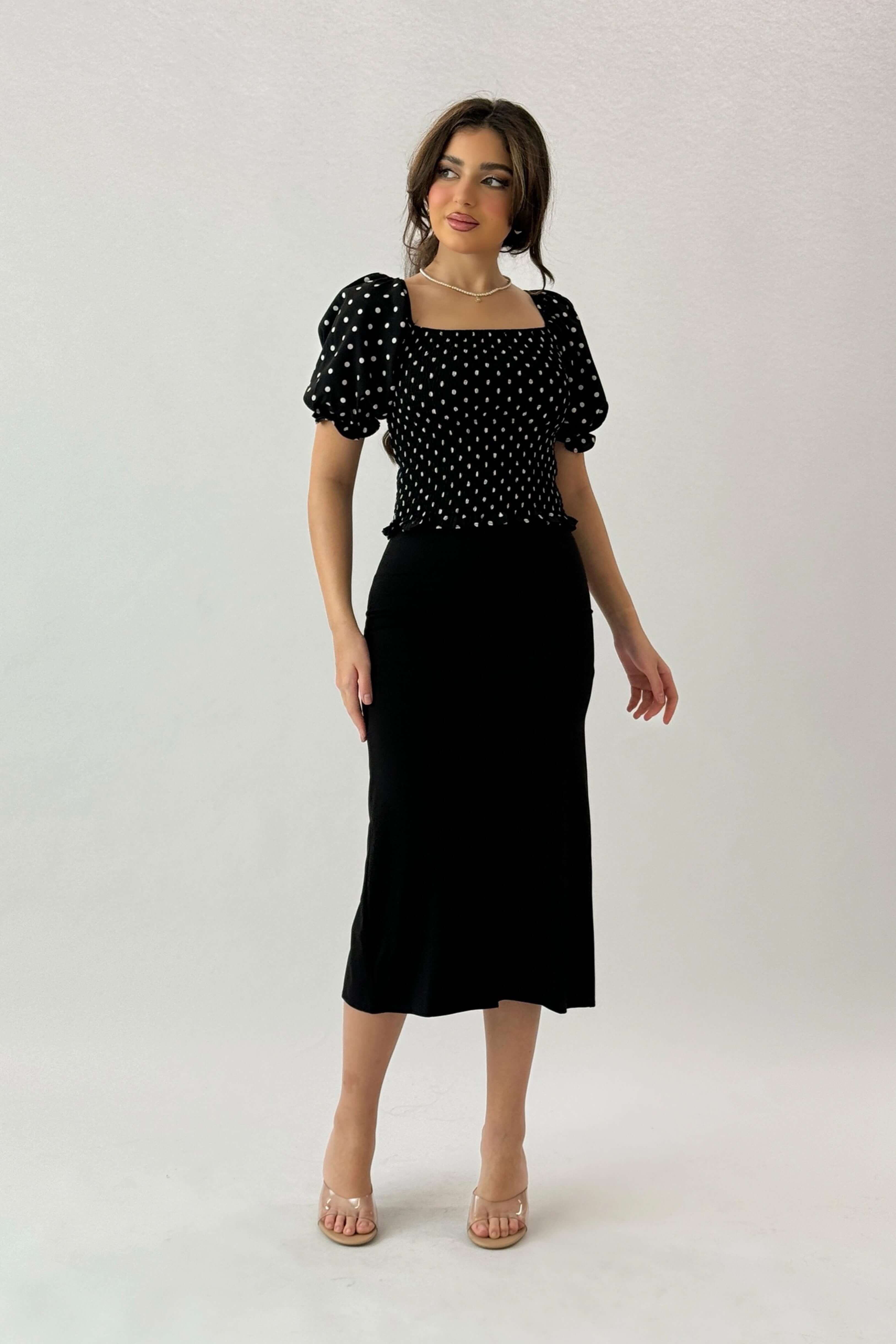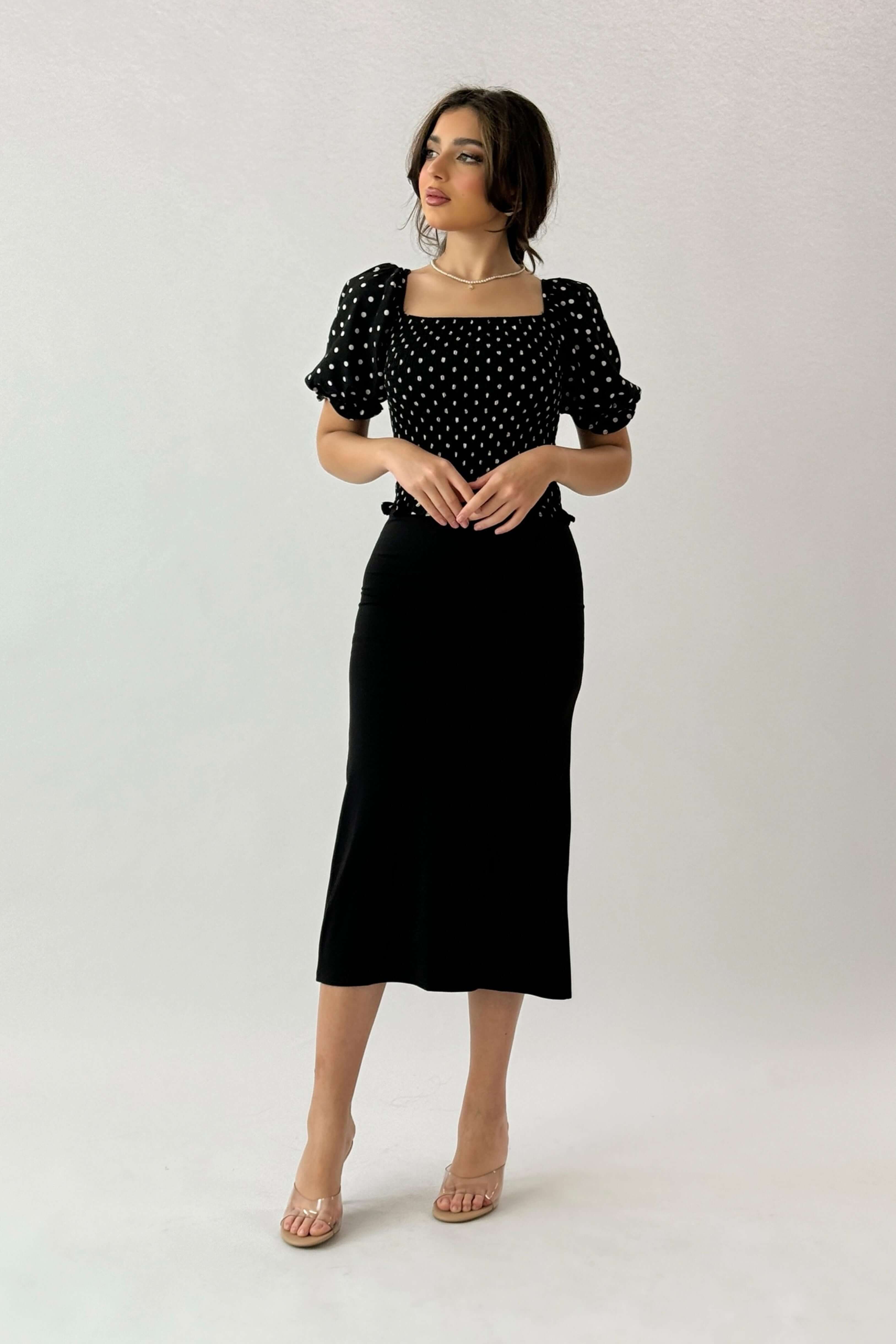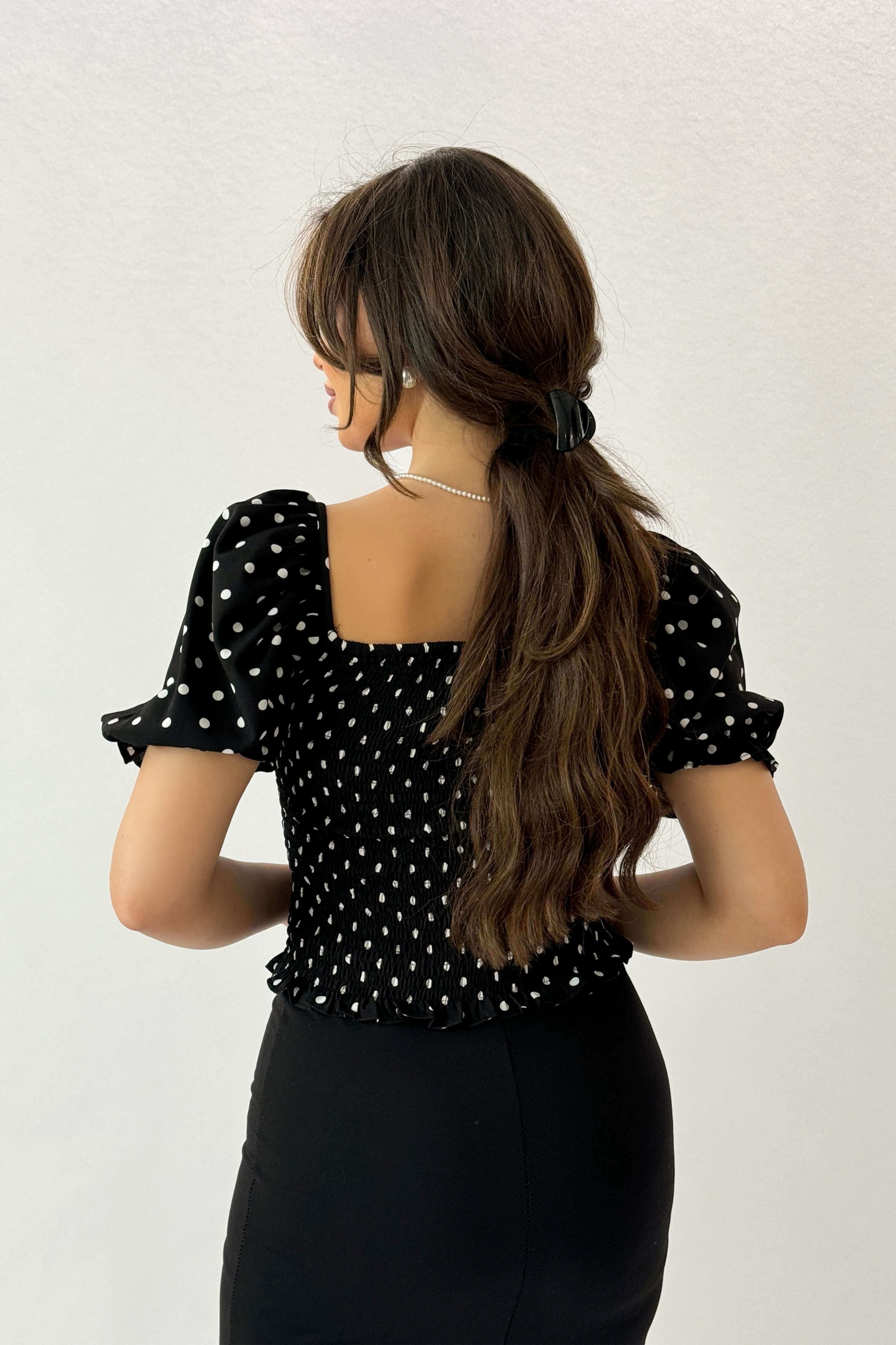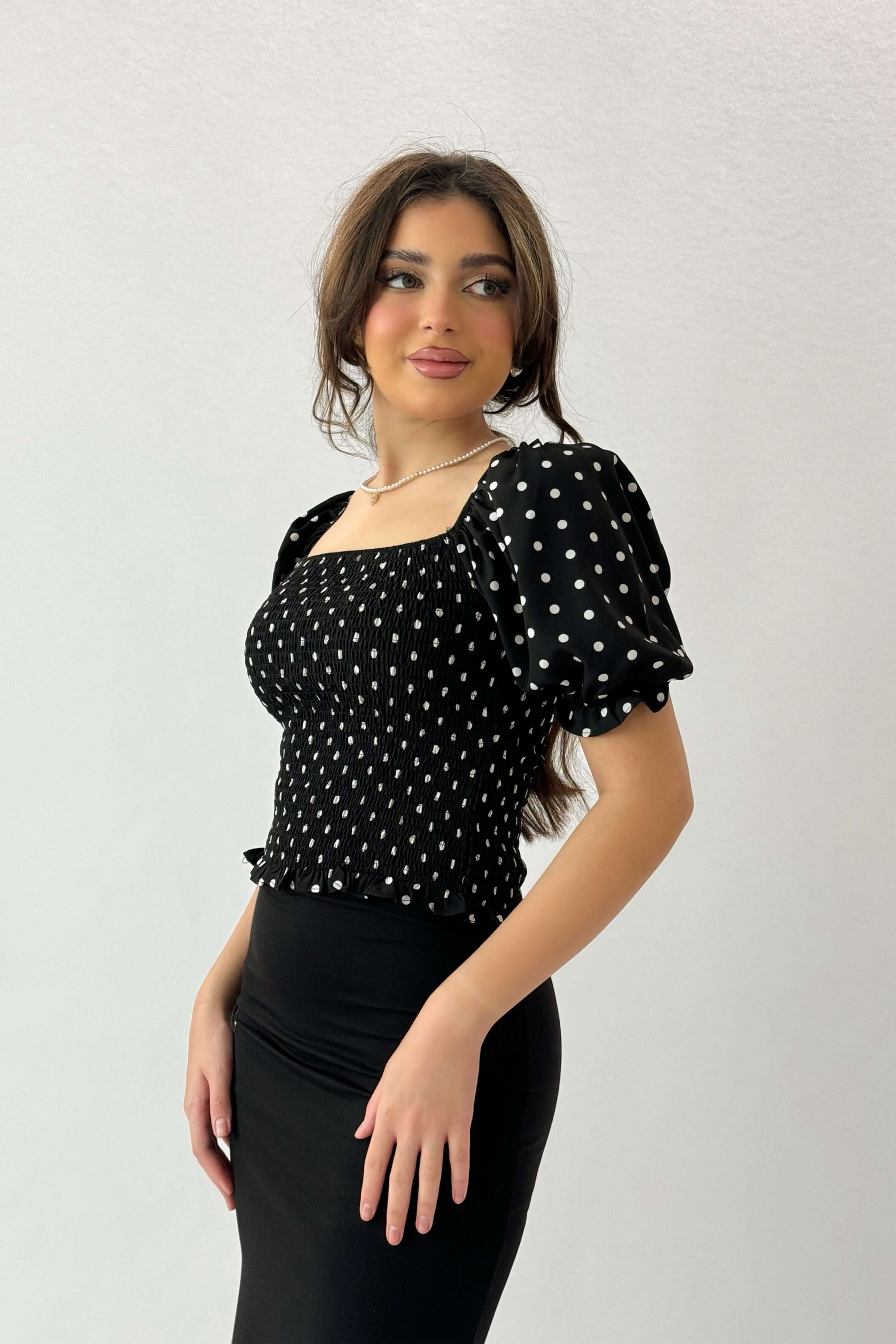 بلوزة بتأثير كشكشة وطبعة منقطة لون اسود