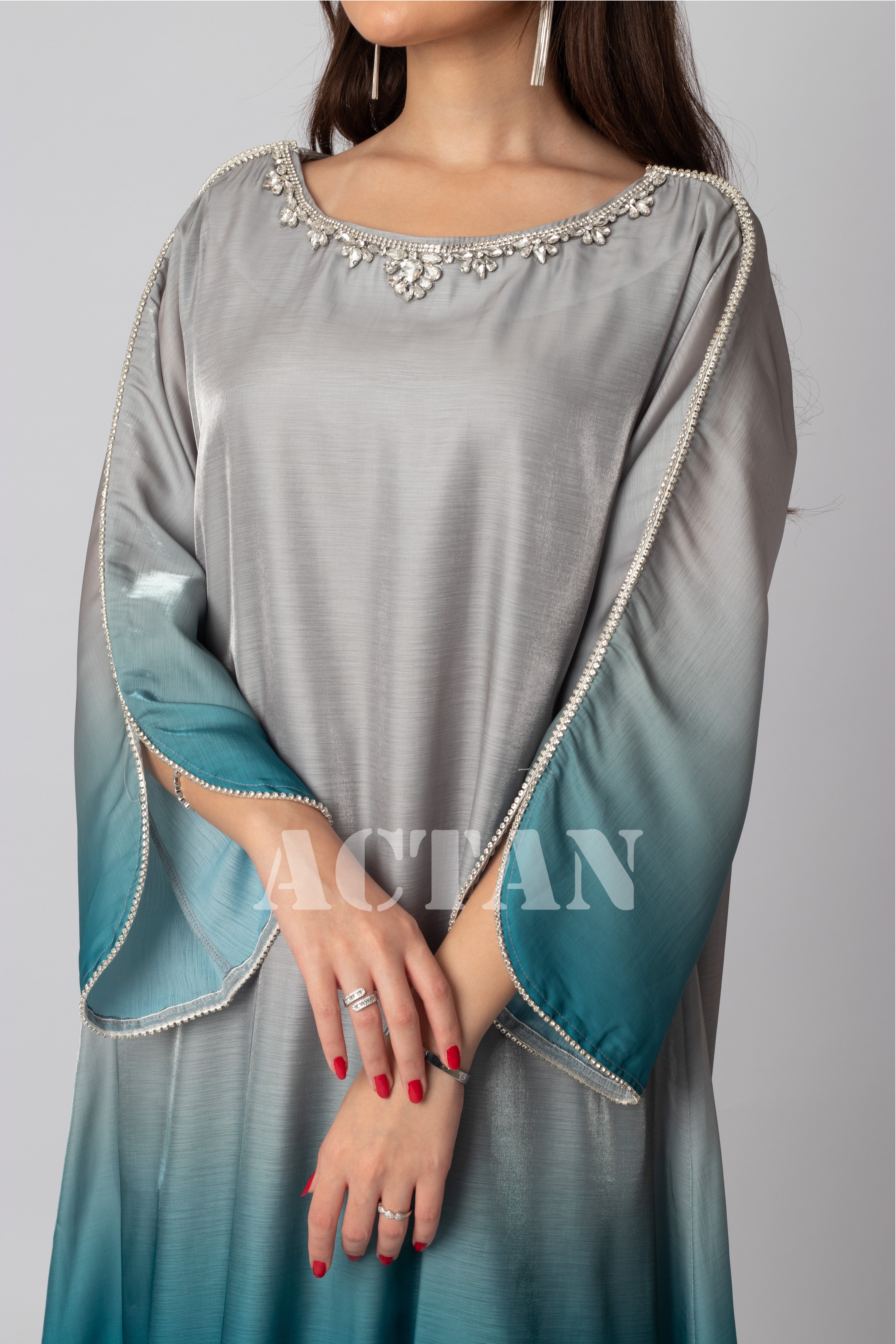 جلابية طويلة واسعة بلون مموج بأكمام طويلة وياقة دائرية مزينة بكريستال