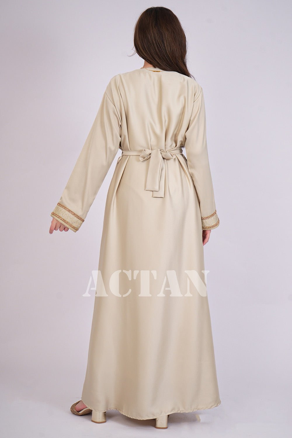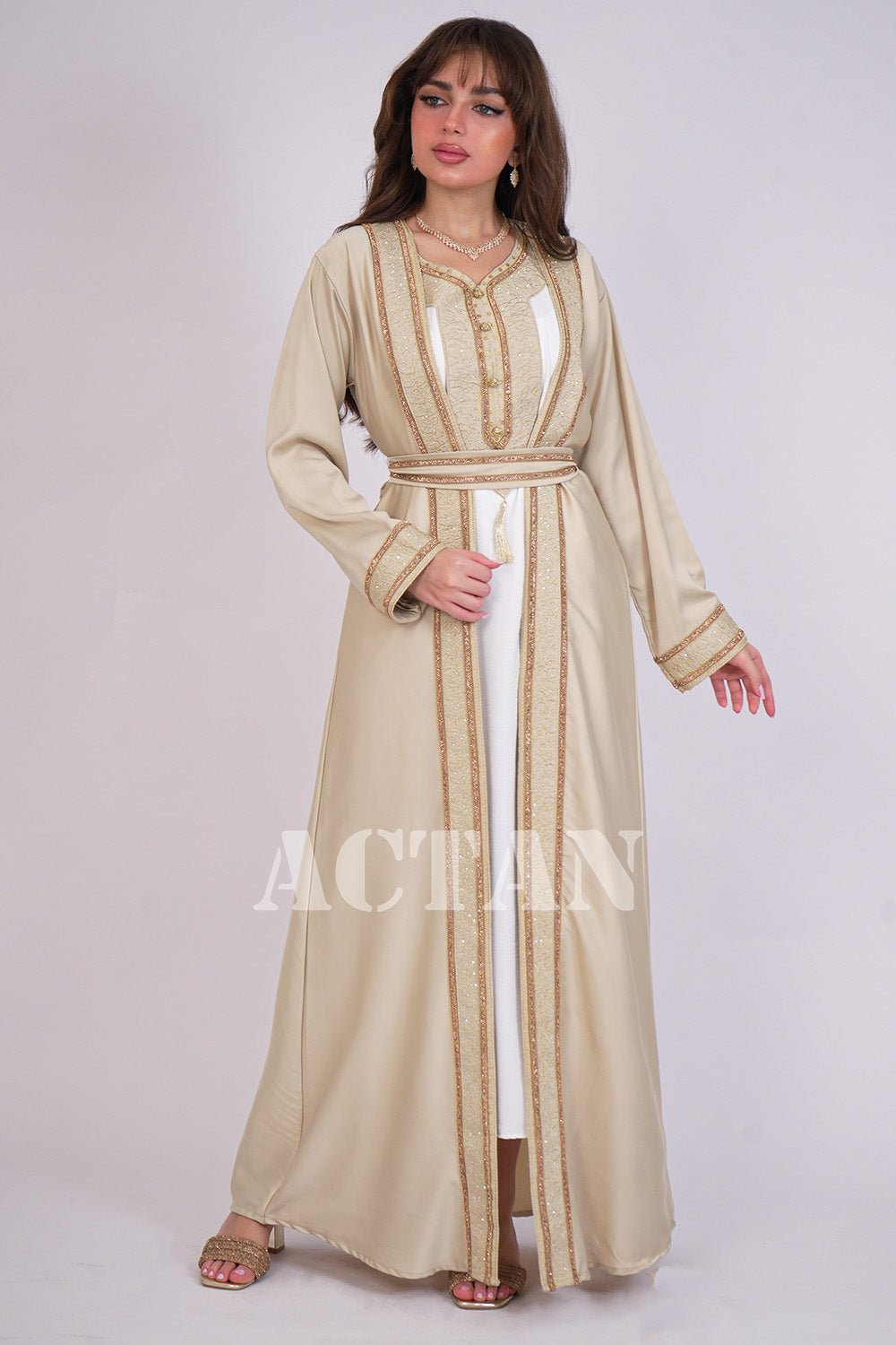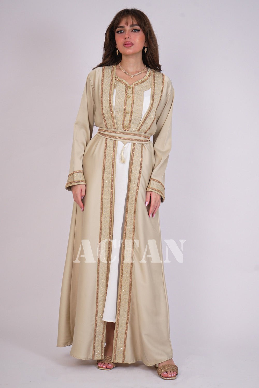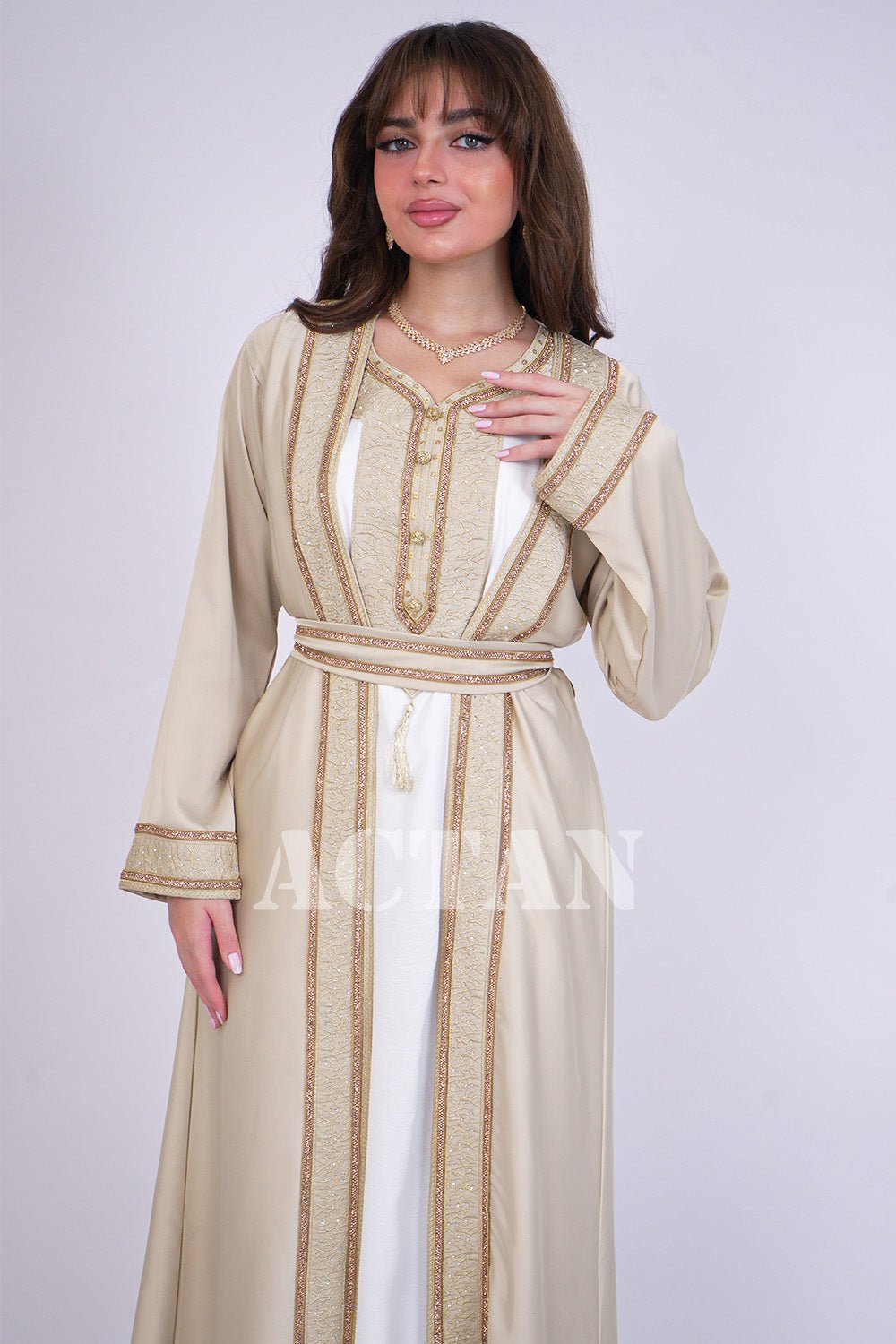 جلابية قطعتين بتطريز ذهبي لون بيج