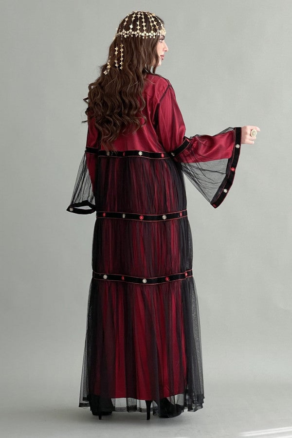 طويلة، القطعة الداخلية بكم طويل وياقة دائرية مع فتحة، أما القطعة الخارجية من التول بكم طويل رافلز، مفتوحة ومطرزة.