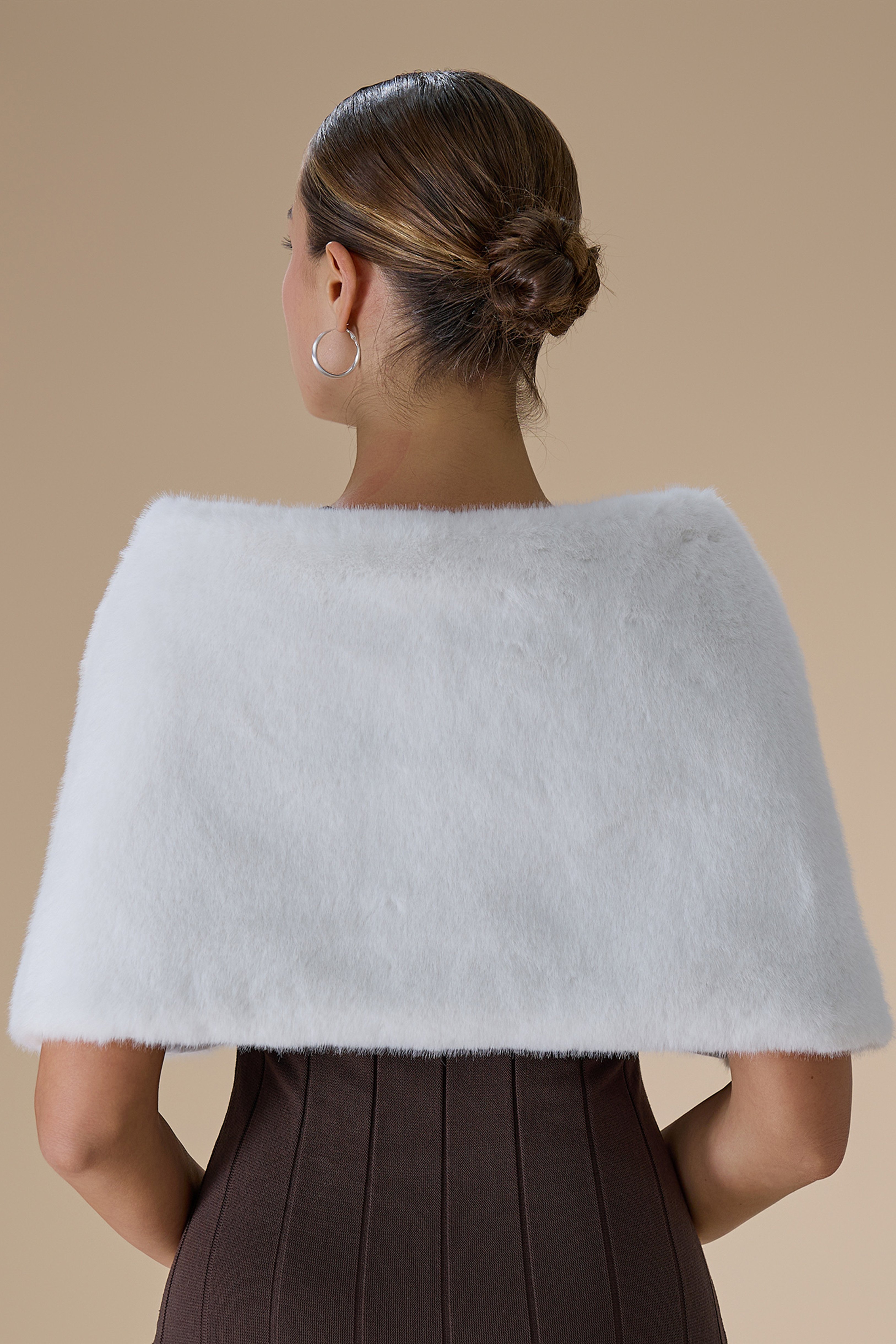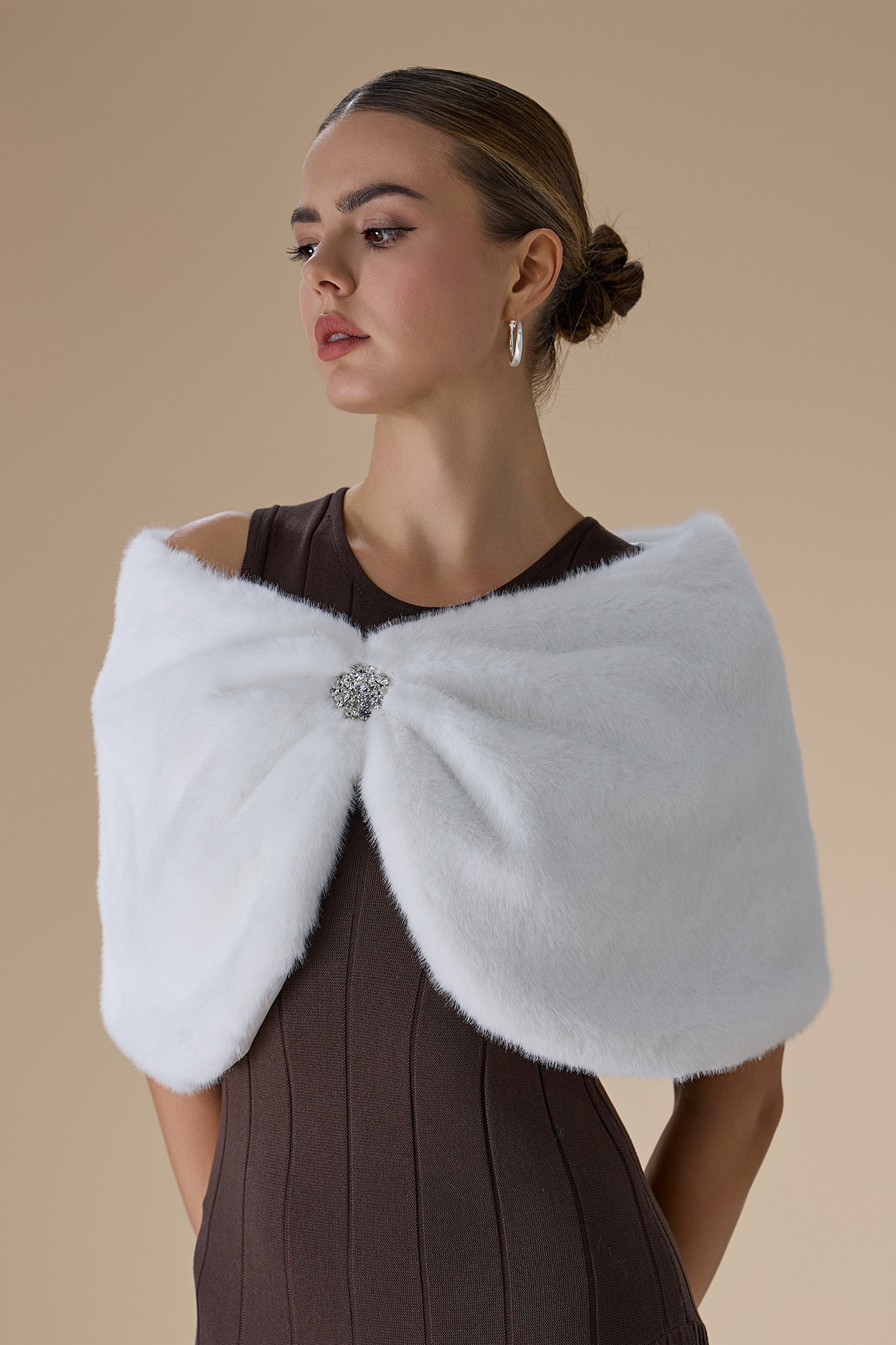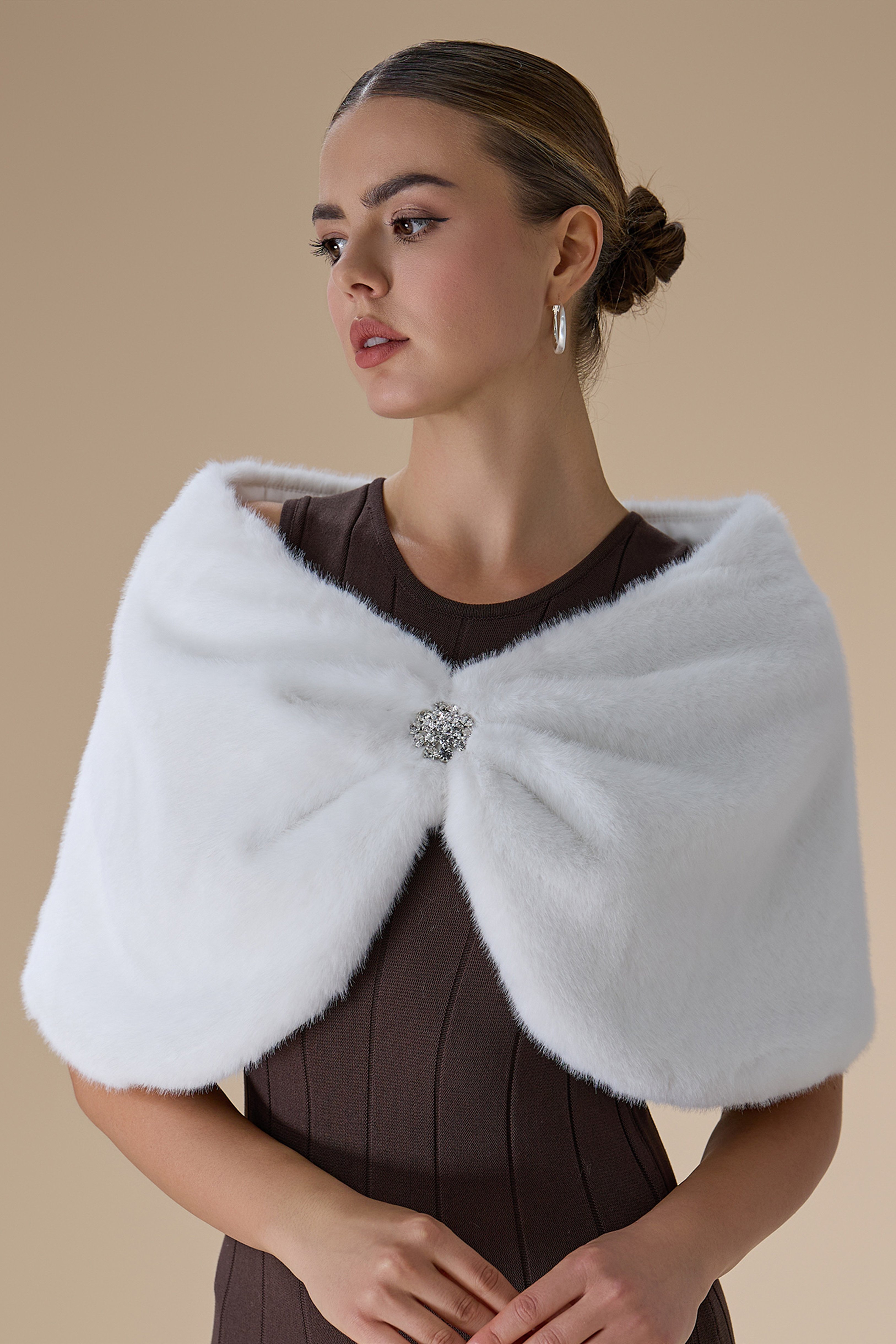 - نوع القصة: شال فرو قصير أبيض أنيق مزين ببروش