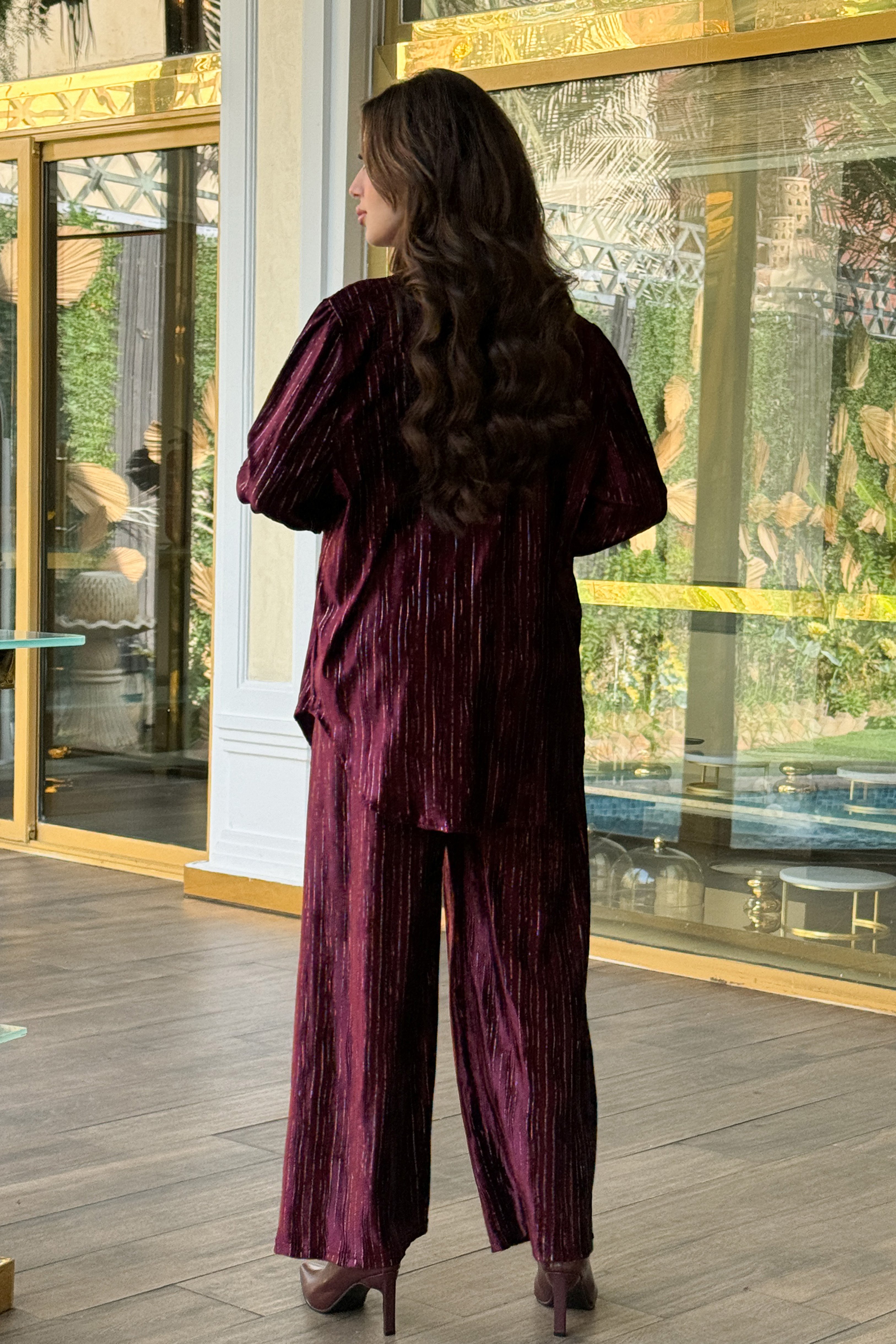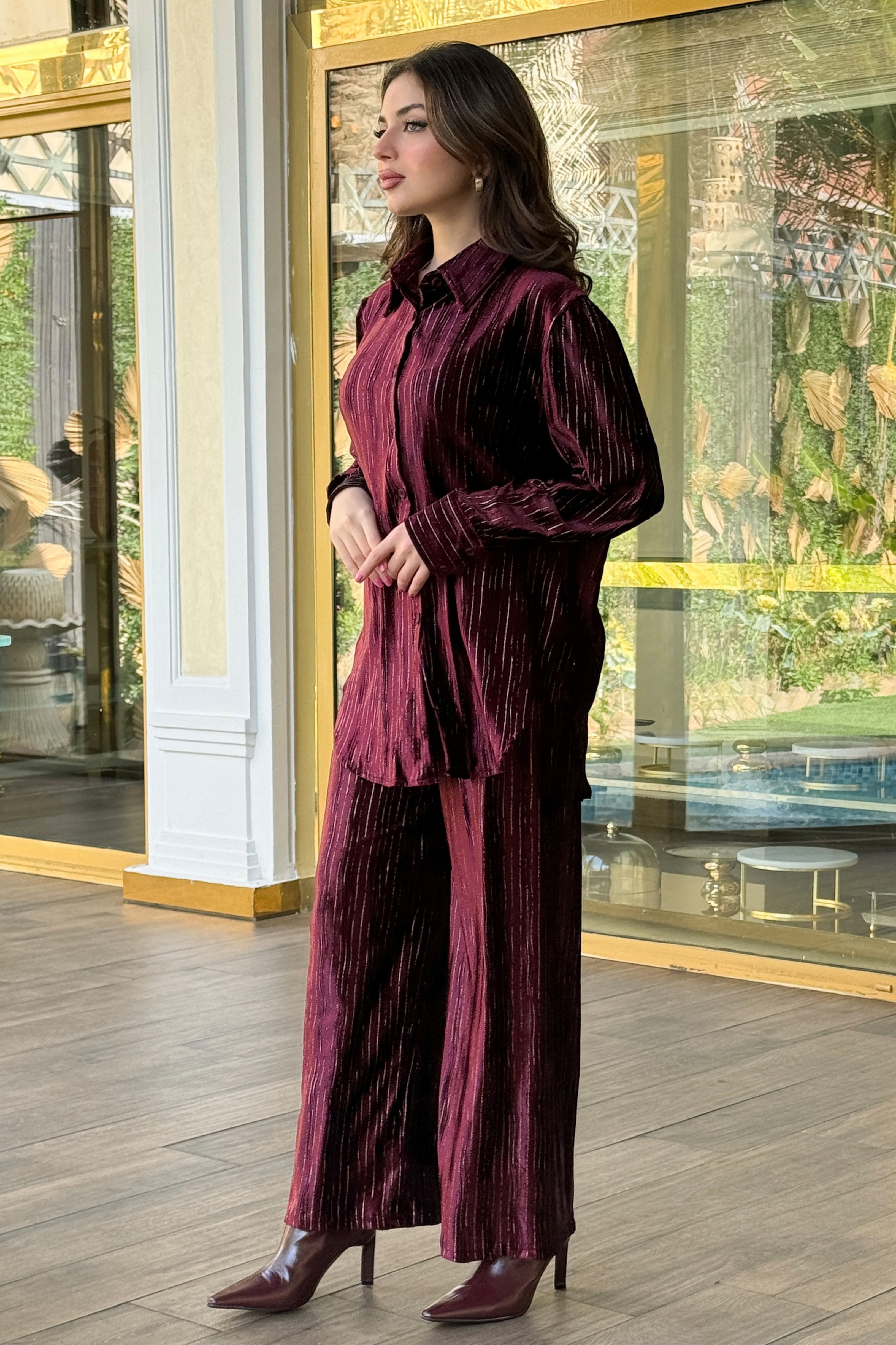 طقم مخملي بنطال وقميص مزين بخطوط لون عنابي فضية