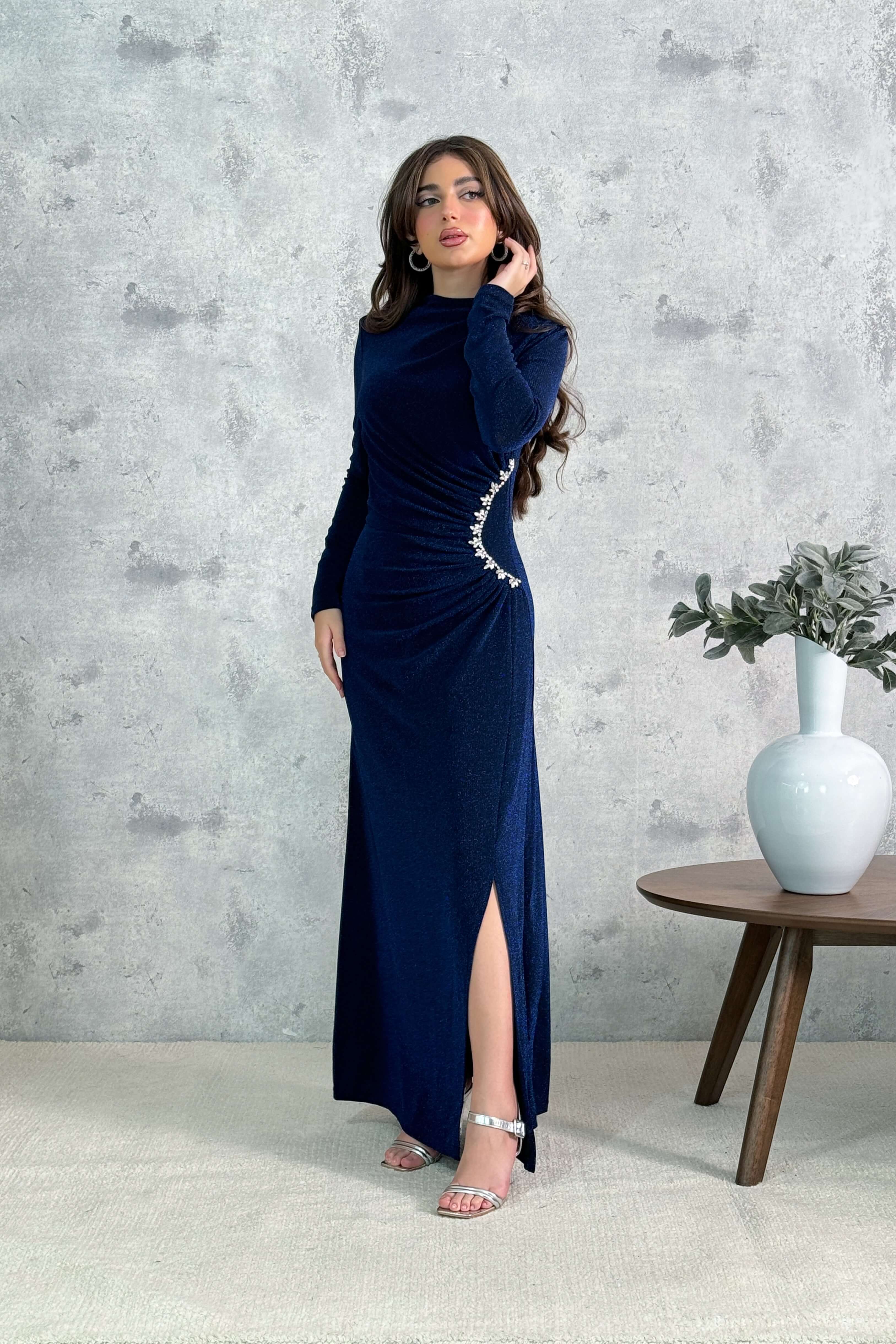 - نوع القصة: فستان أنيق طويل بفتحة سفلية، مزين بالكريستال بتفاصيل درابيه، بياقة دائرية ضيقة وأكمام طويلة