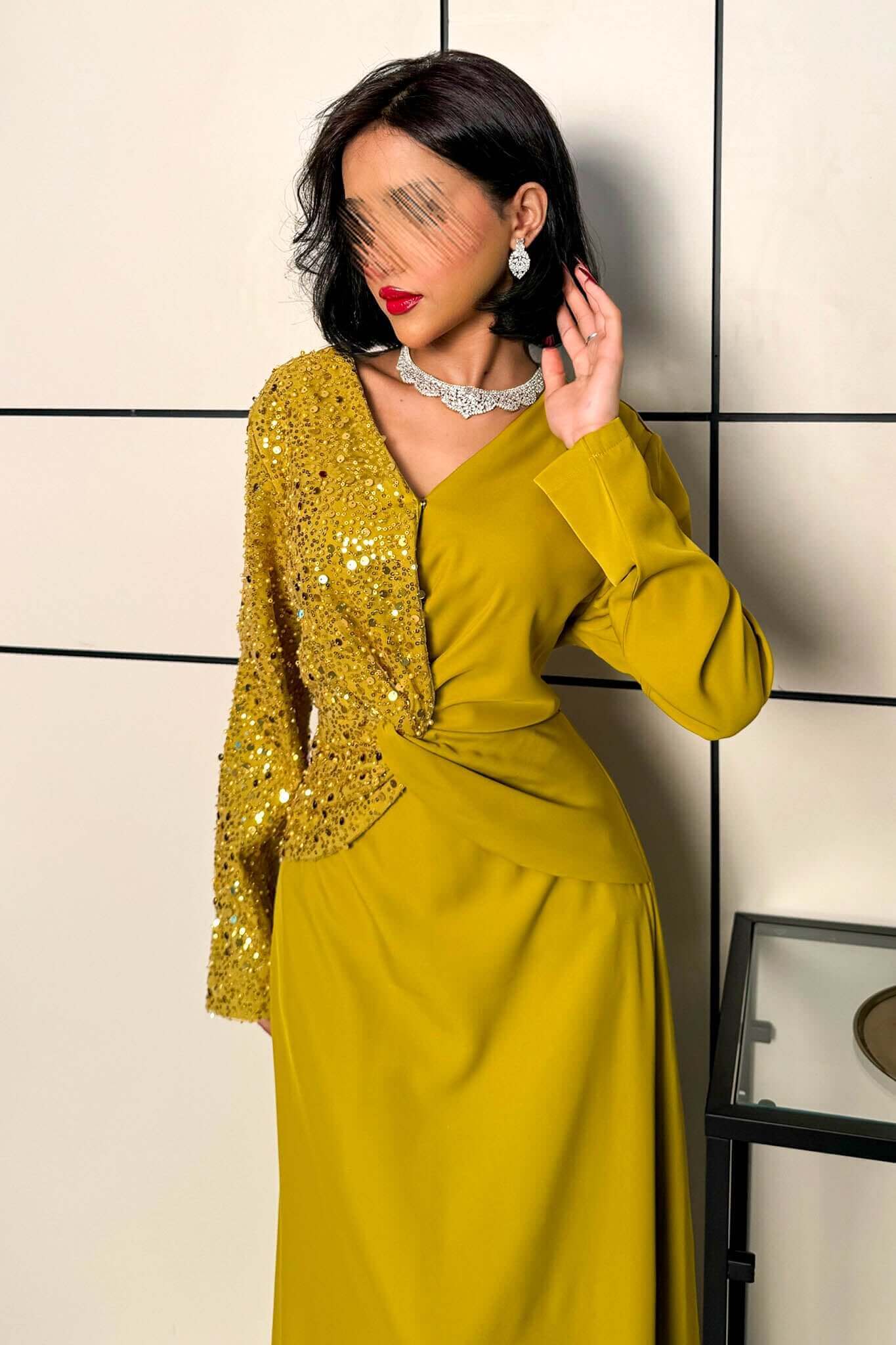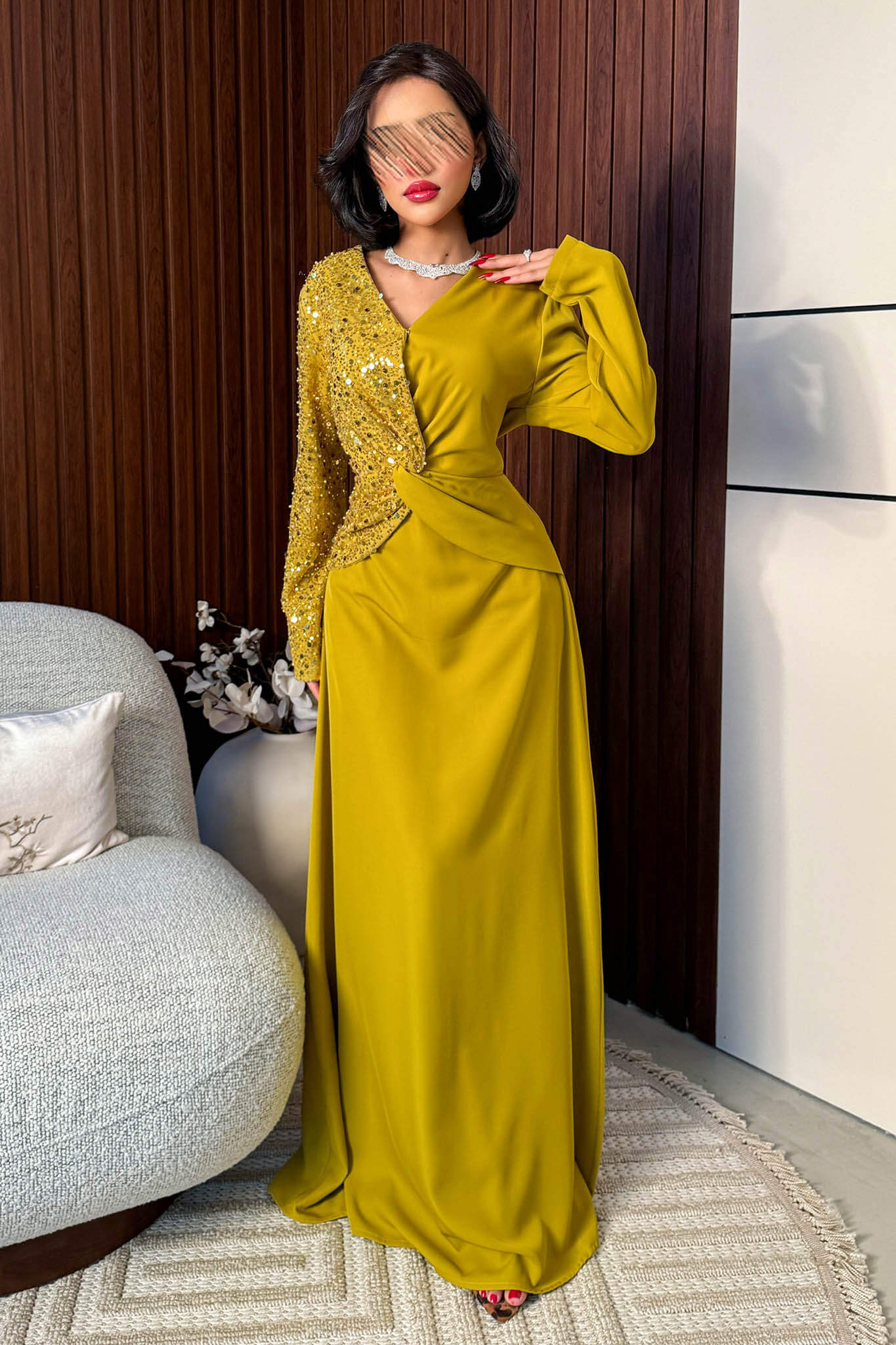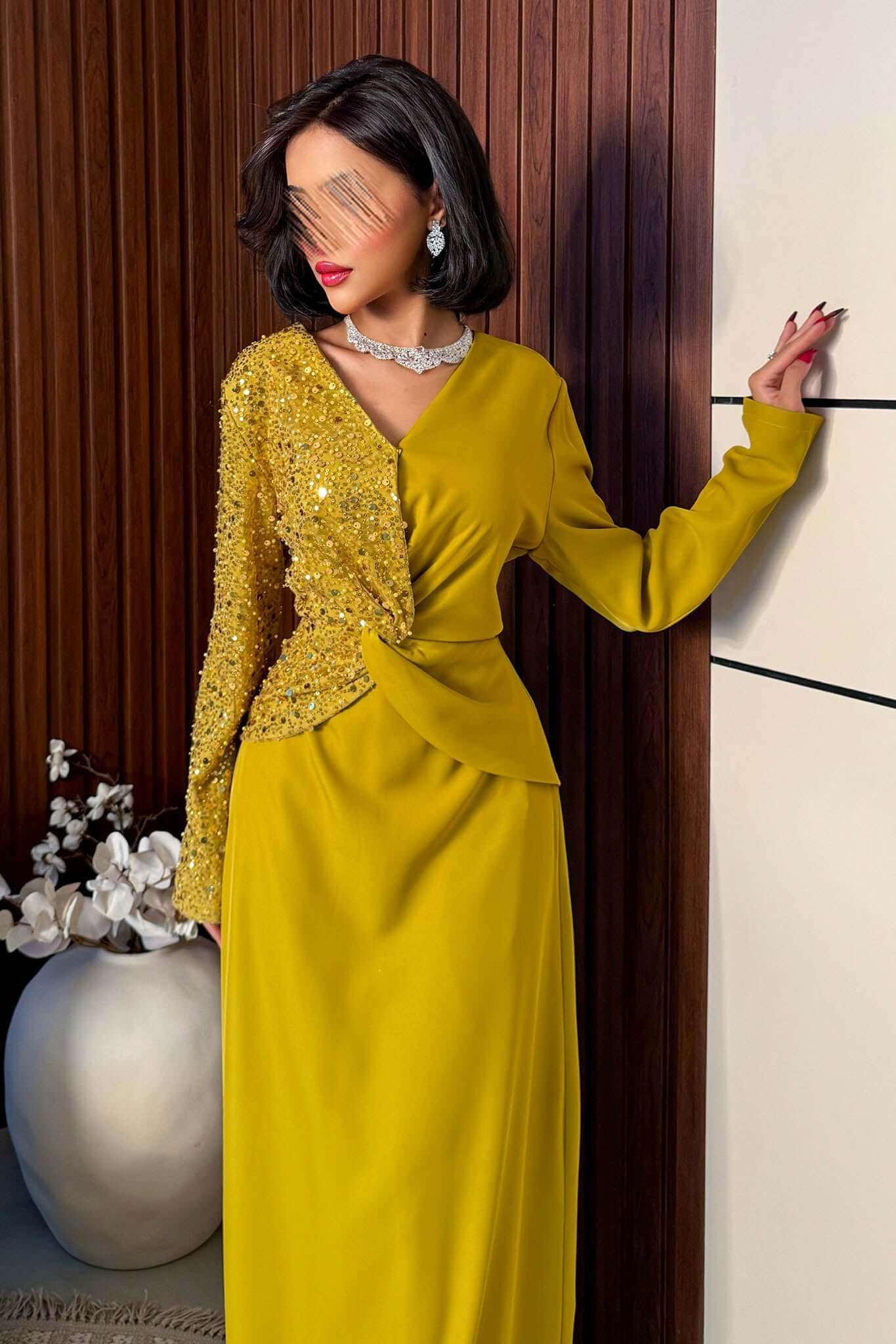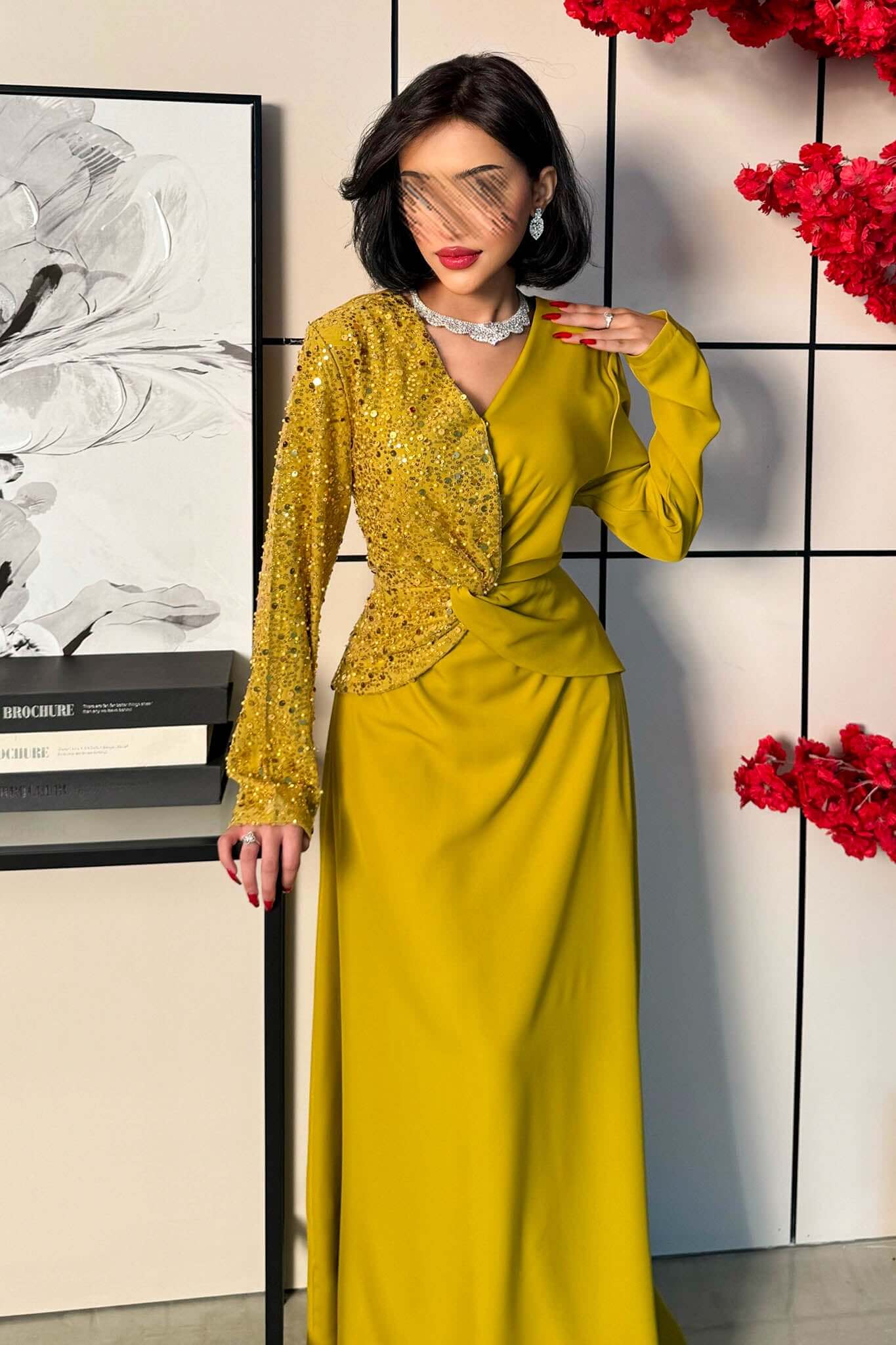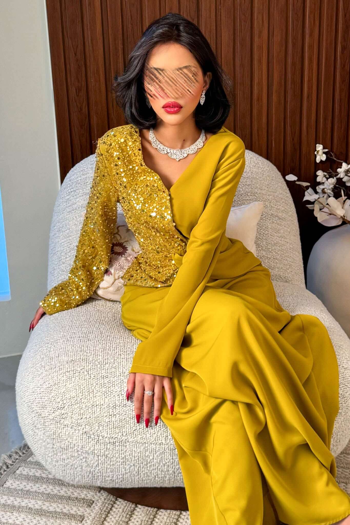 • نوع القصة: فستان طويل أنيق بقصة مستقيمة مزين بترتر لامع، بياقة على شكل V وأكمام طويلة