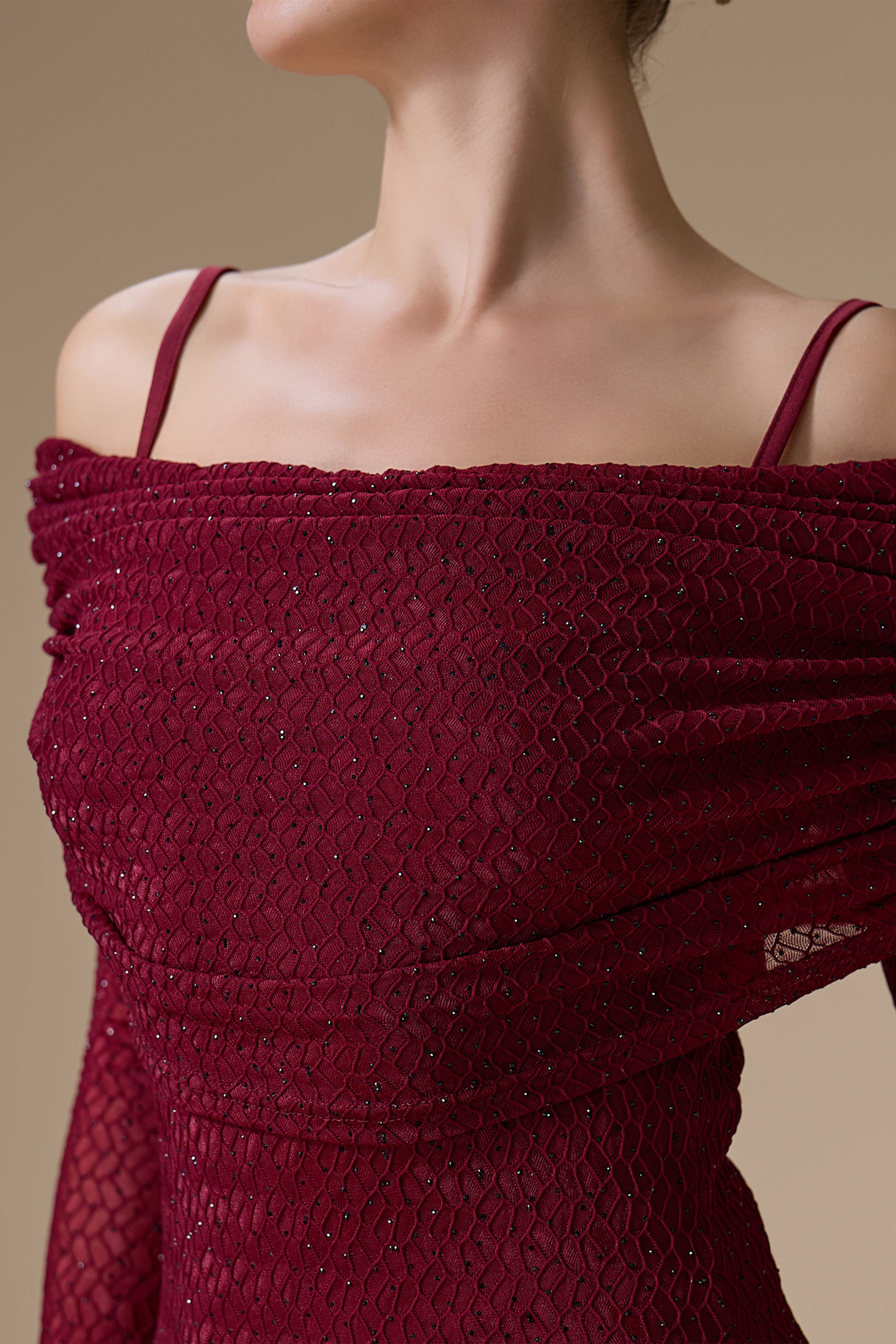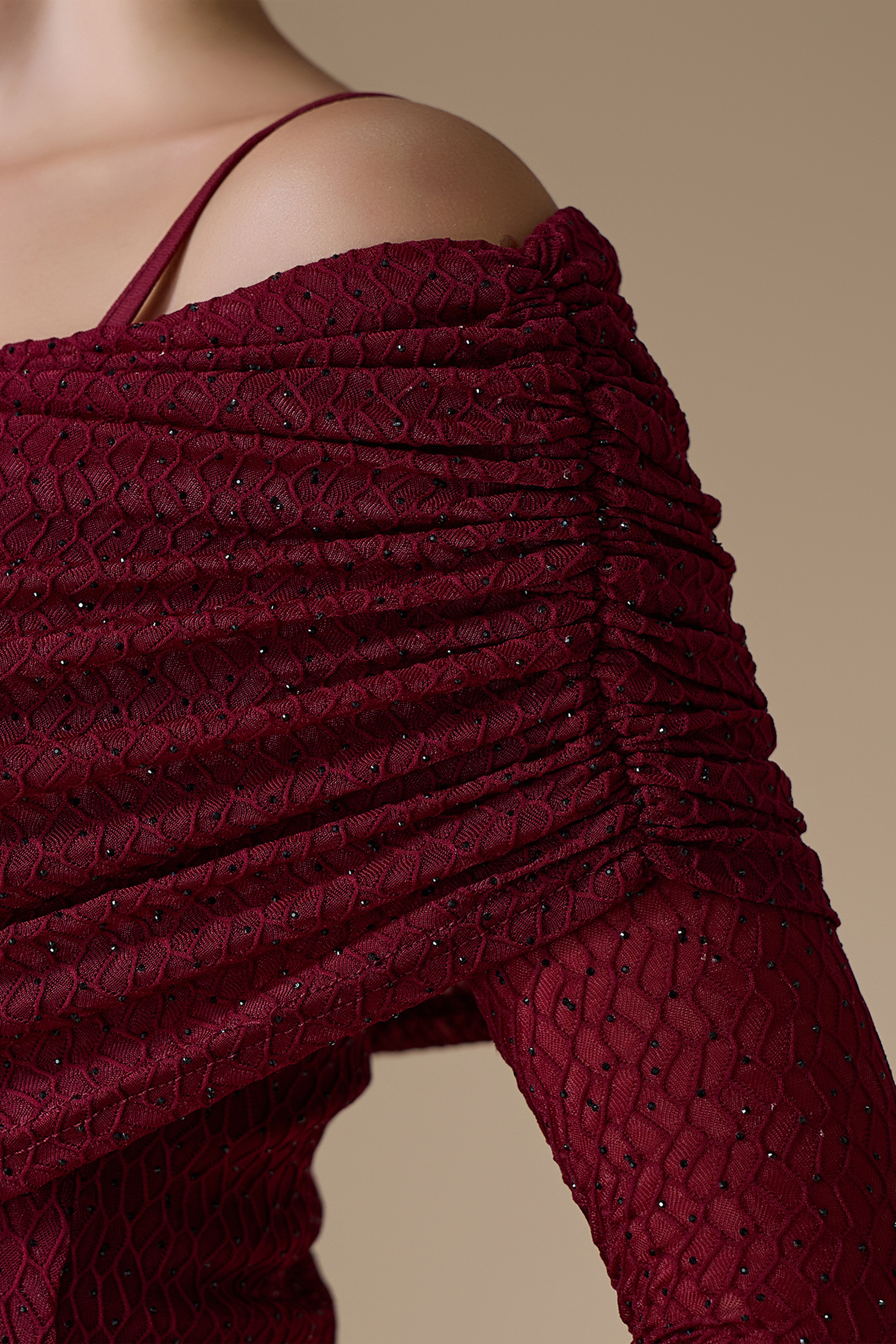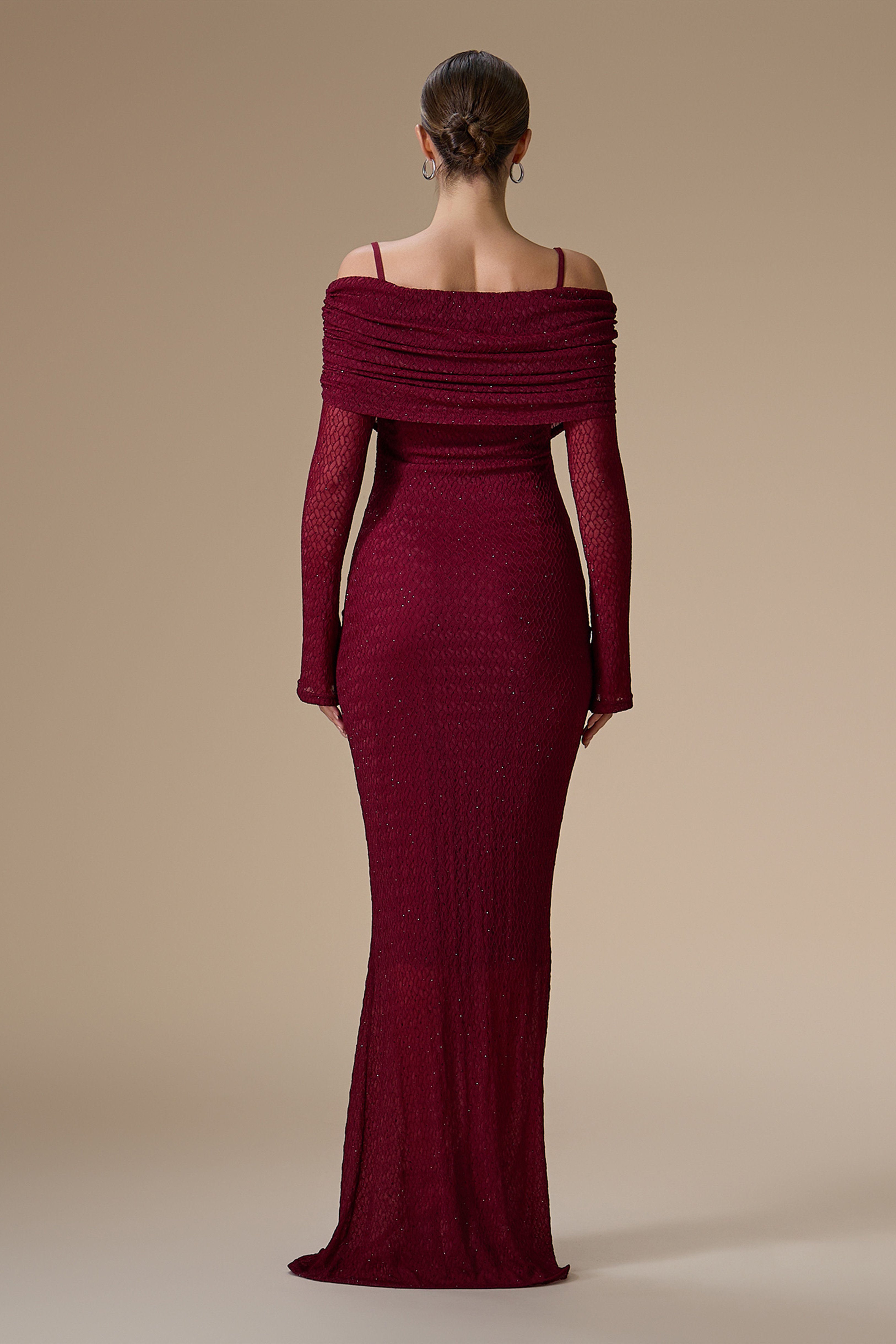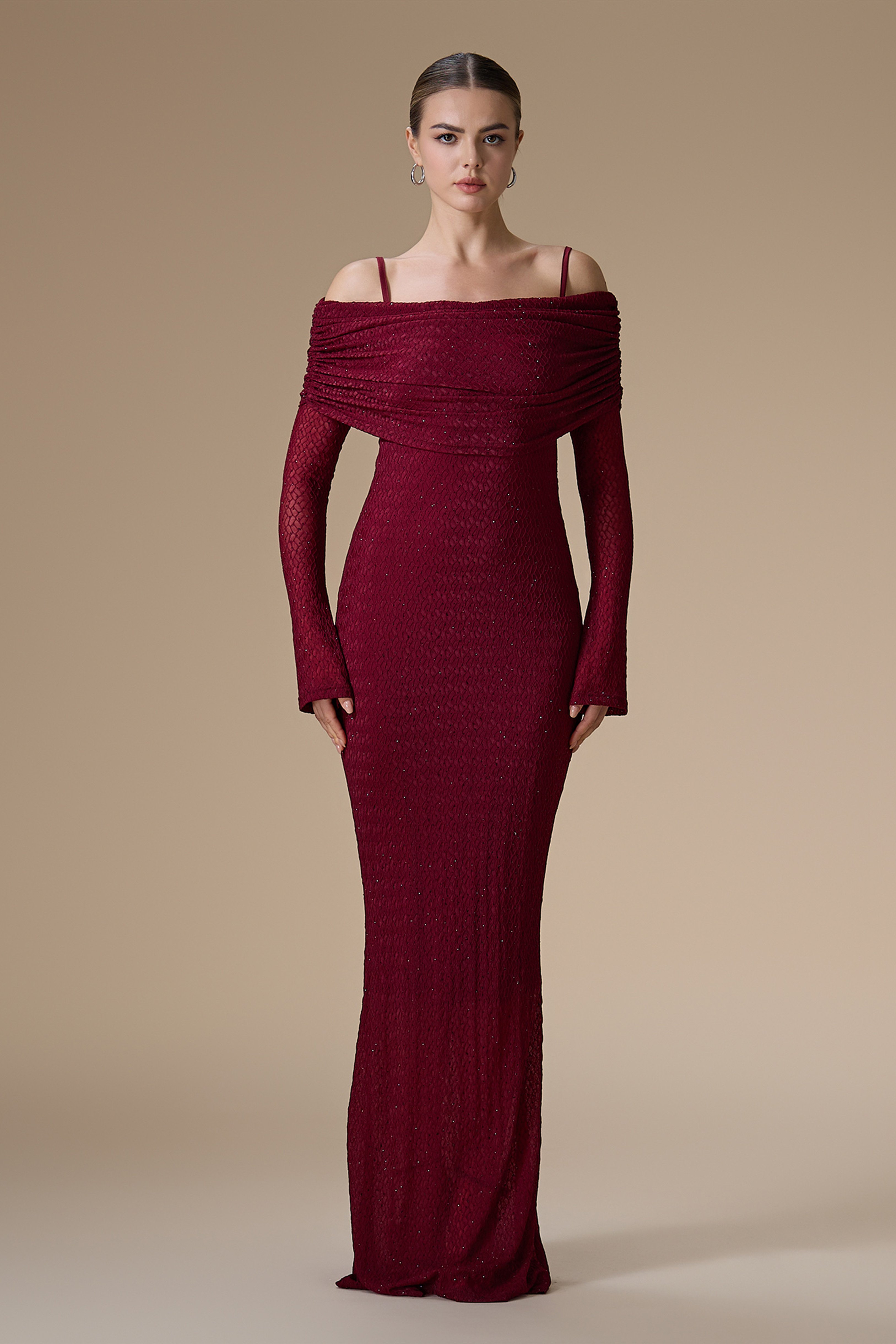 • نوع القصة: فستان كلاسيكي طويل مزين بالفصوص بقصة ضيقة بكسرات أوف شولدر وأكمام طويلة