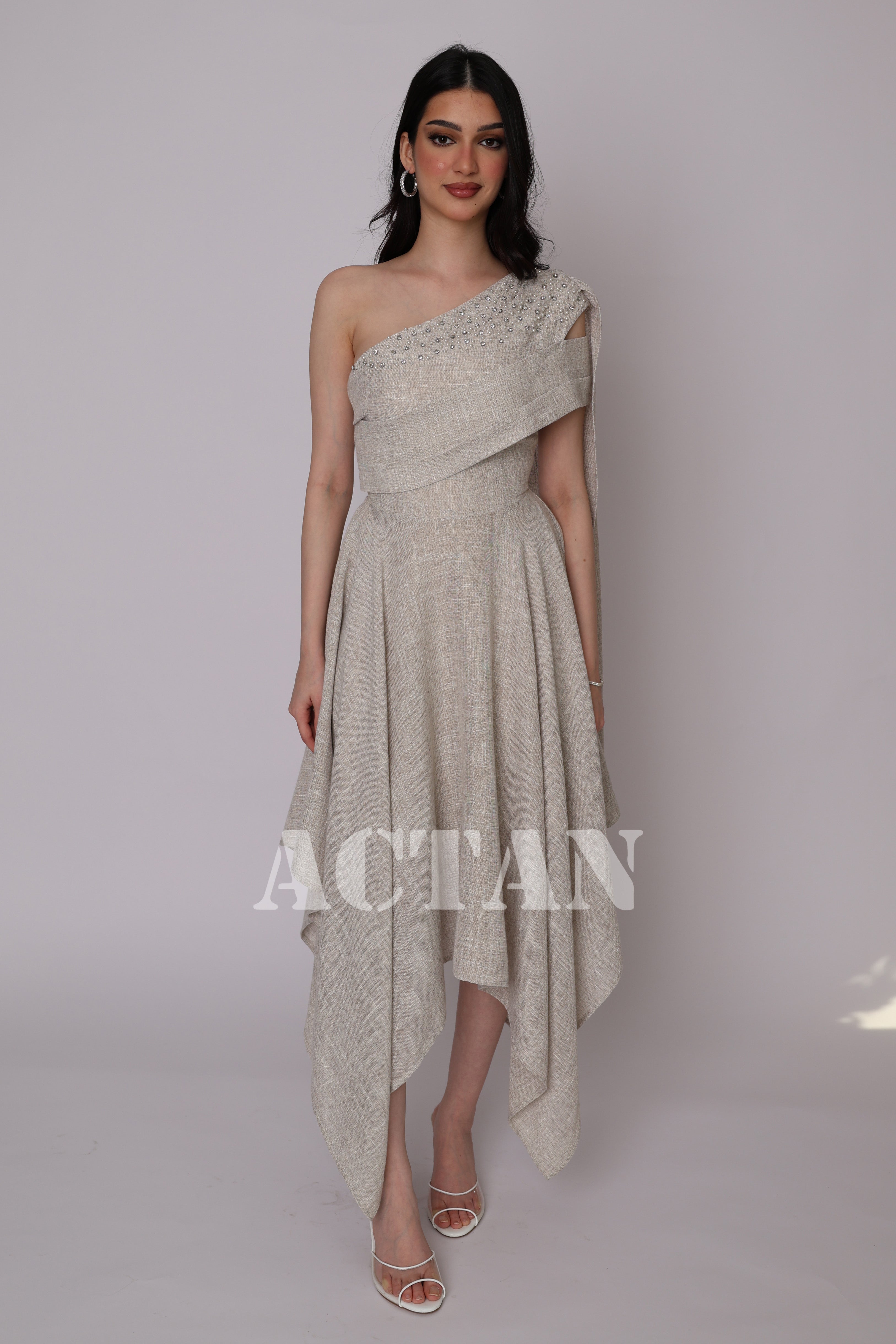 فستان بكتف واحد غير متساوي الأطوال لون بيج