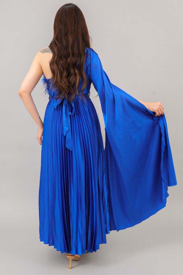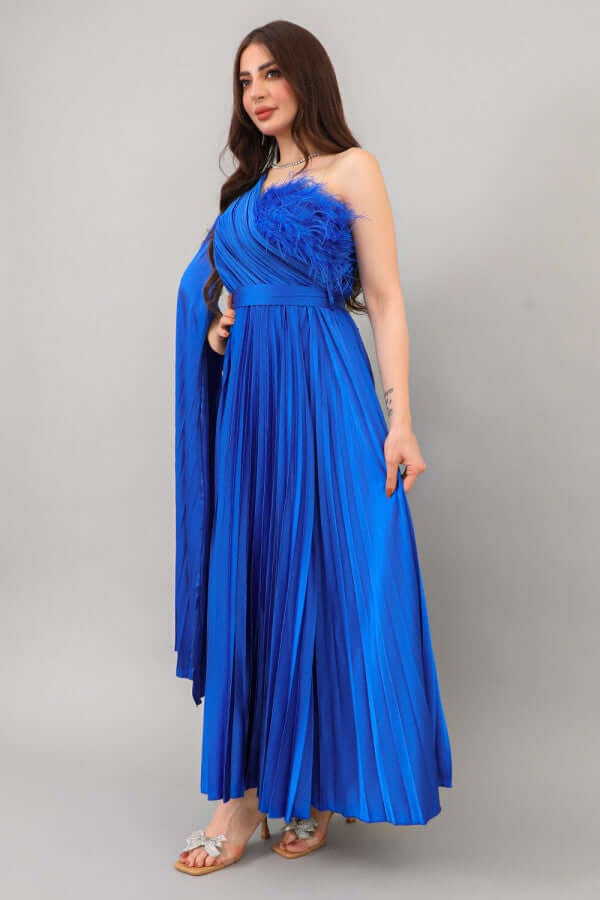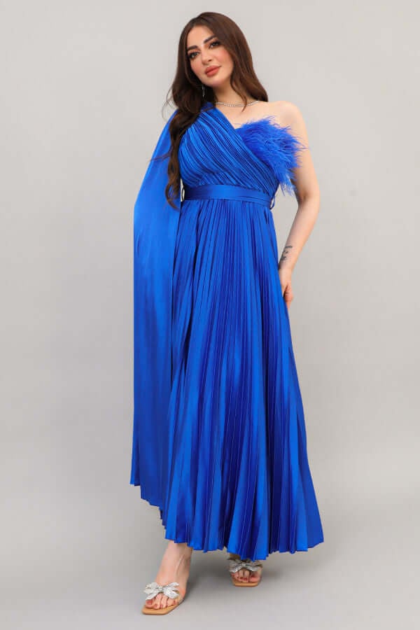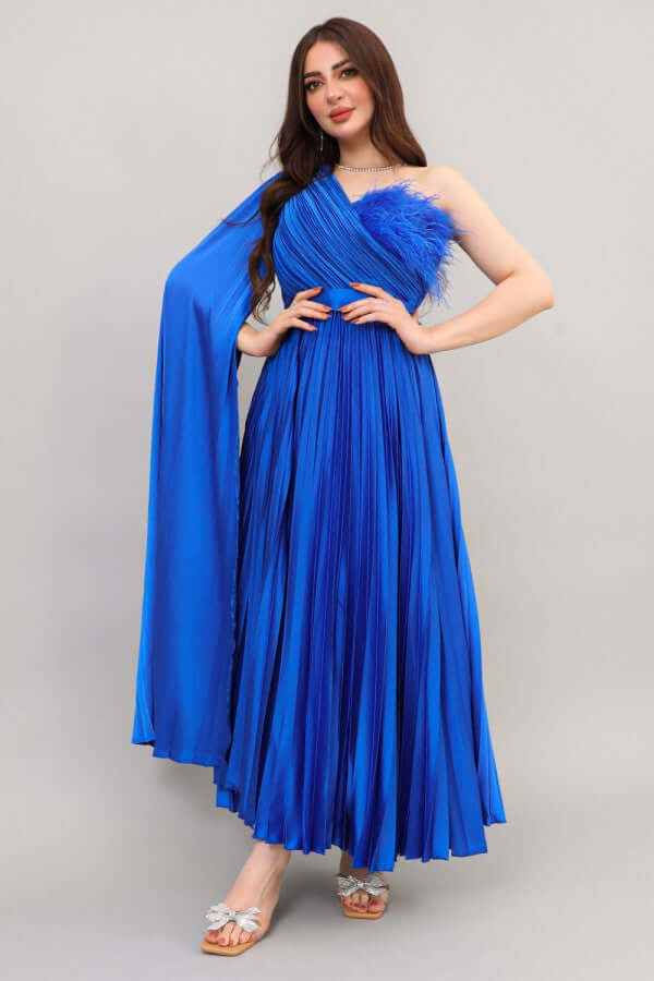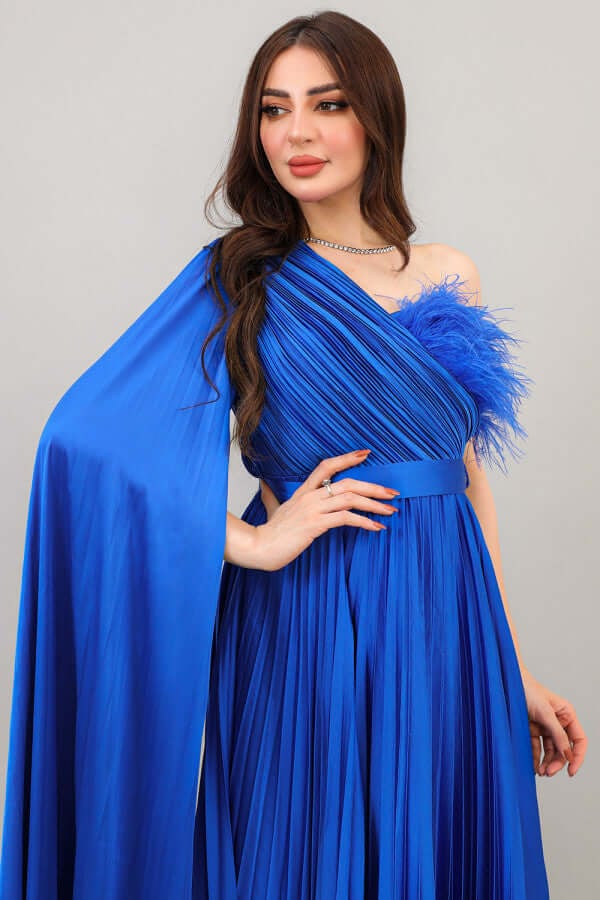 فستان بلاسيه بكتف واحد وكم كايب لون نيلي