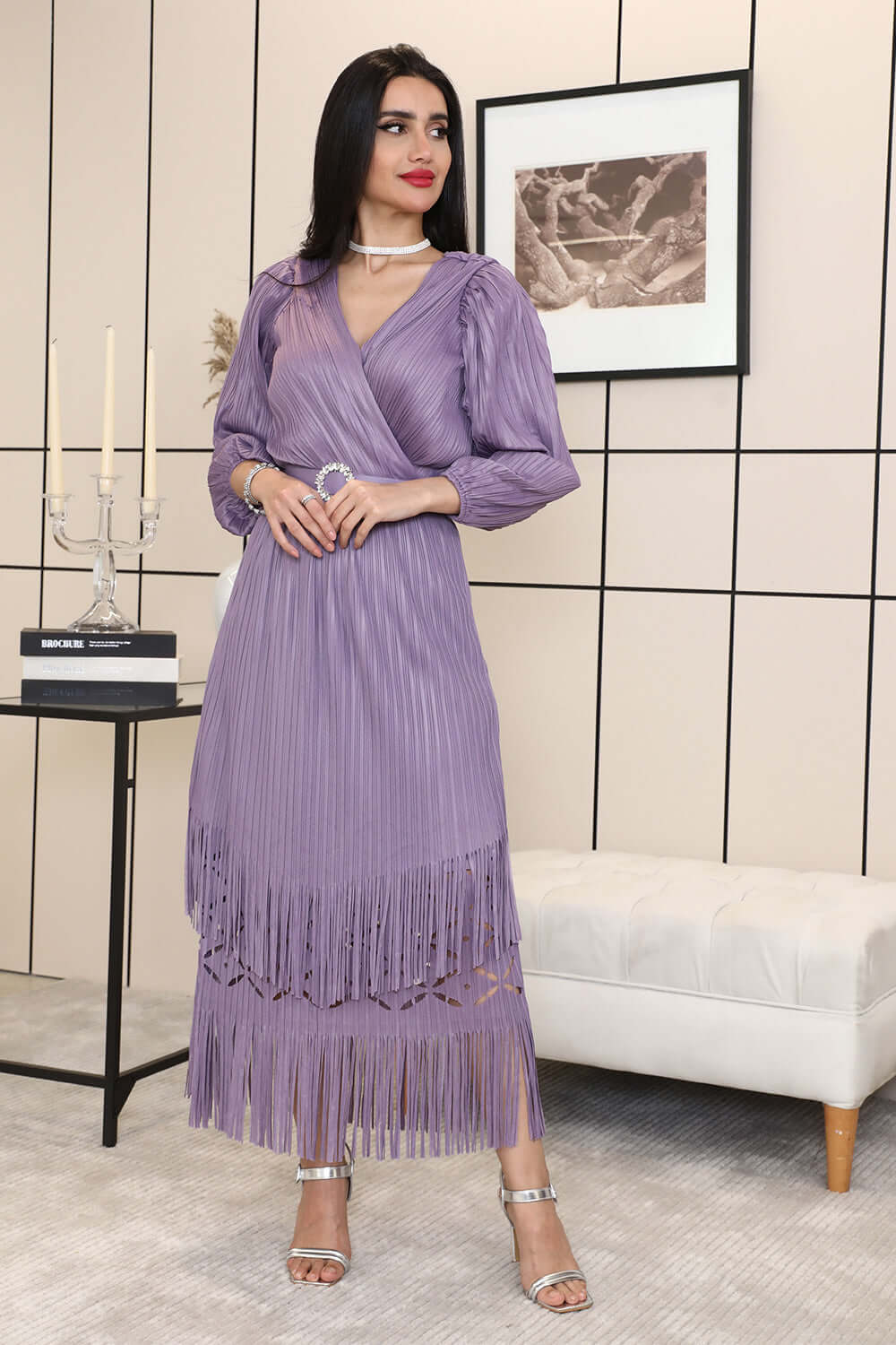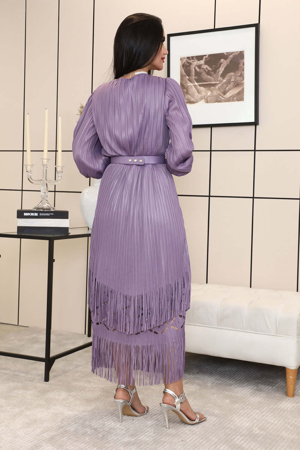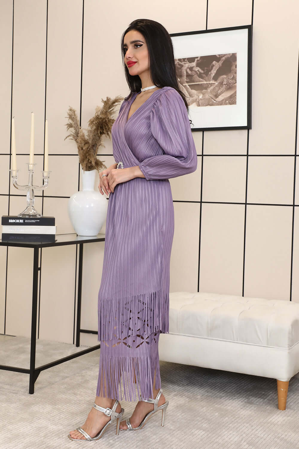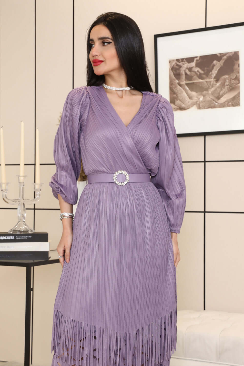 فستان ميدي بليسيه بطبقات، مزين بحزام عالخصر، وأكمام دانتيل طويلة، وياقة V