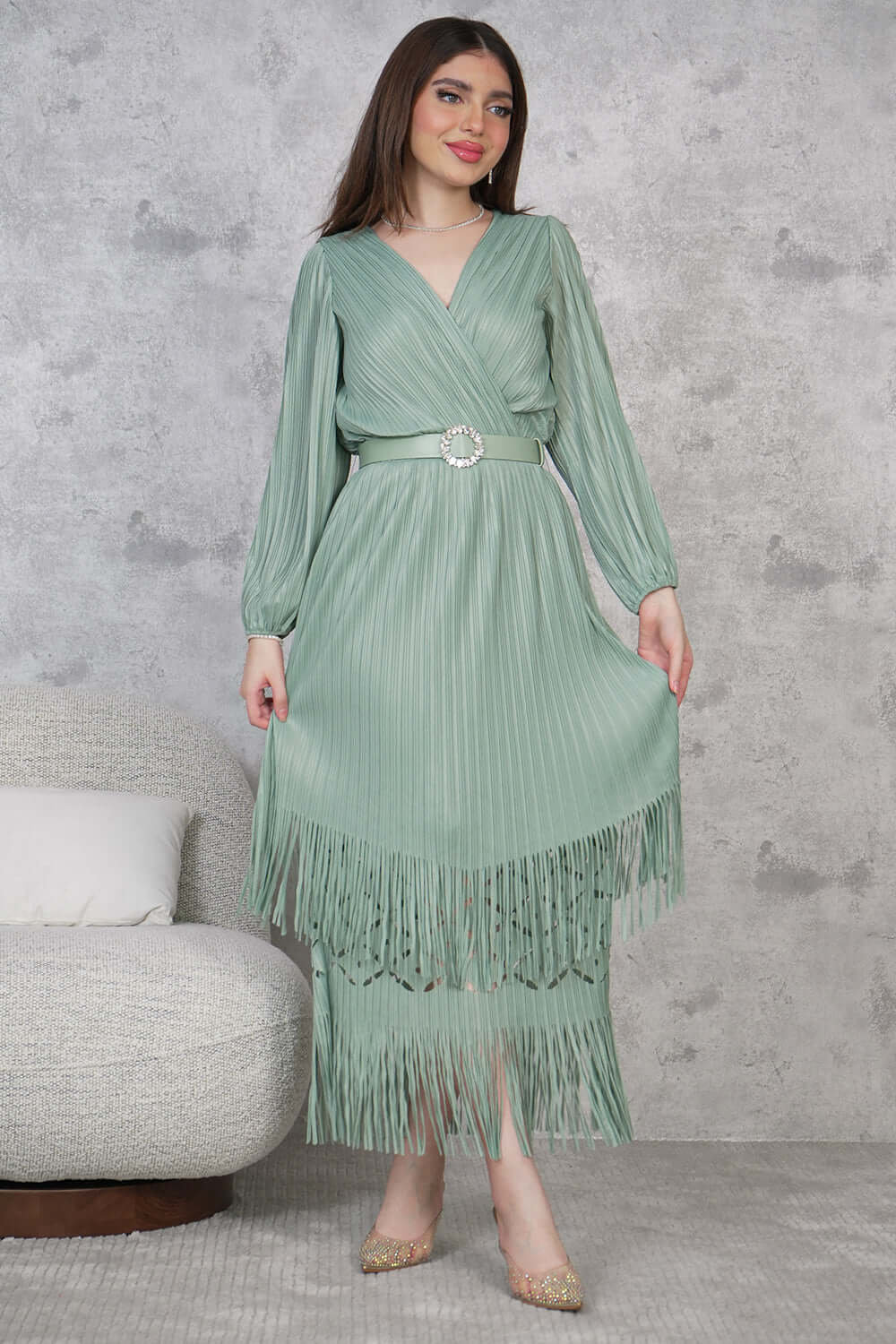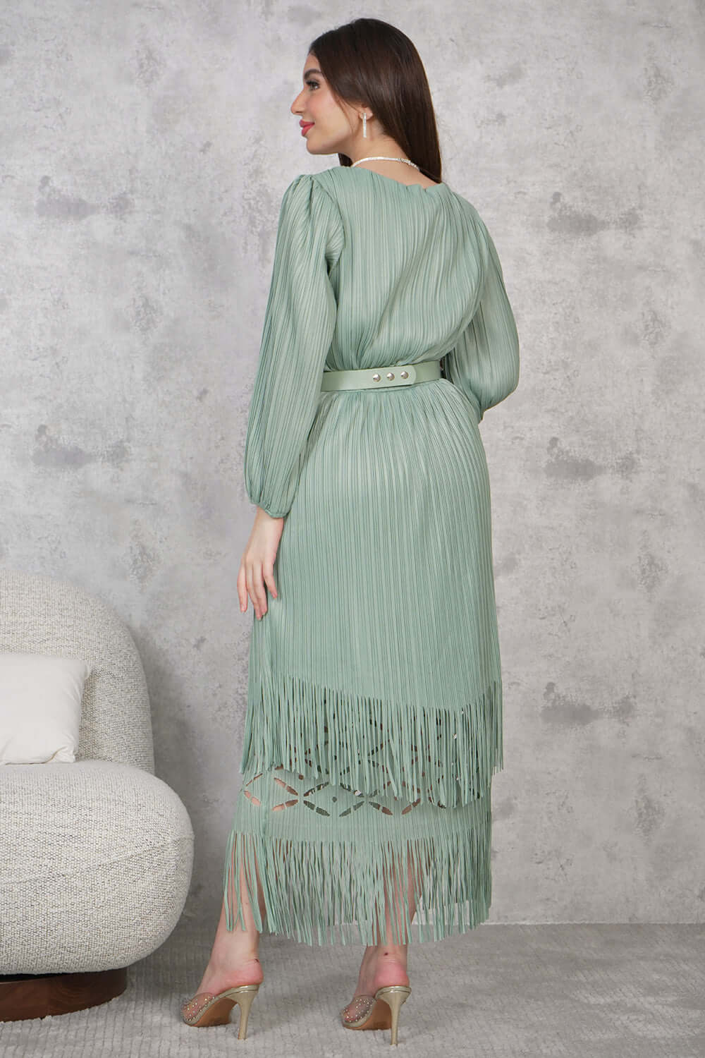 فستان بليسيه مزين بهدب لون تيفاني