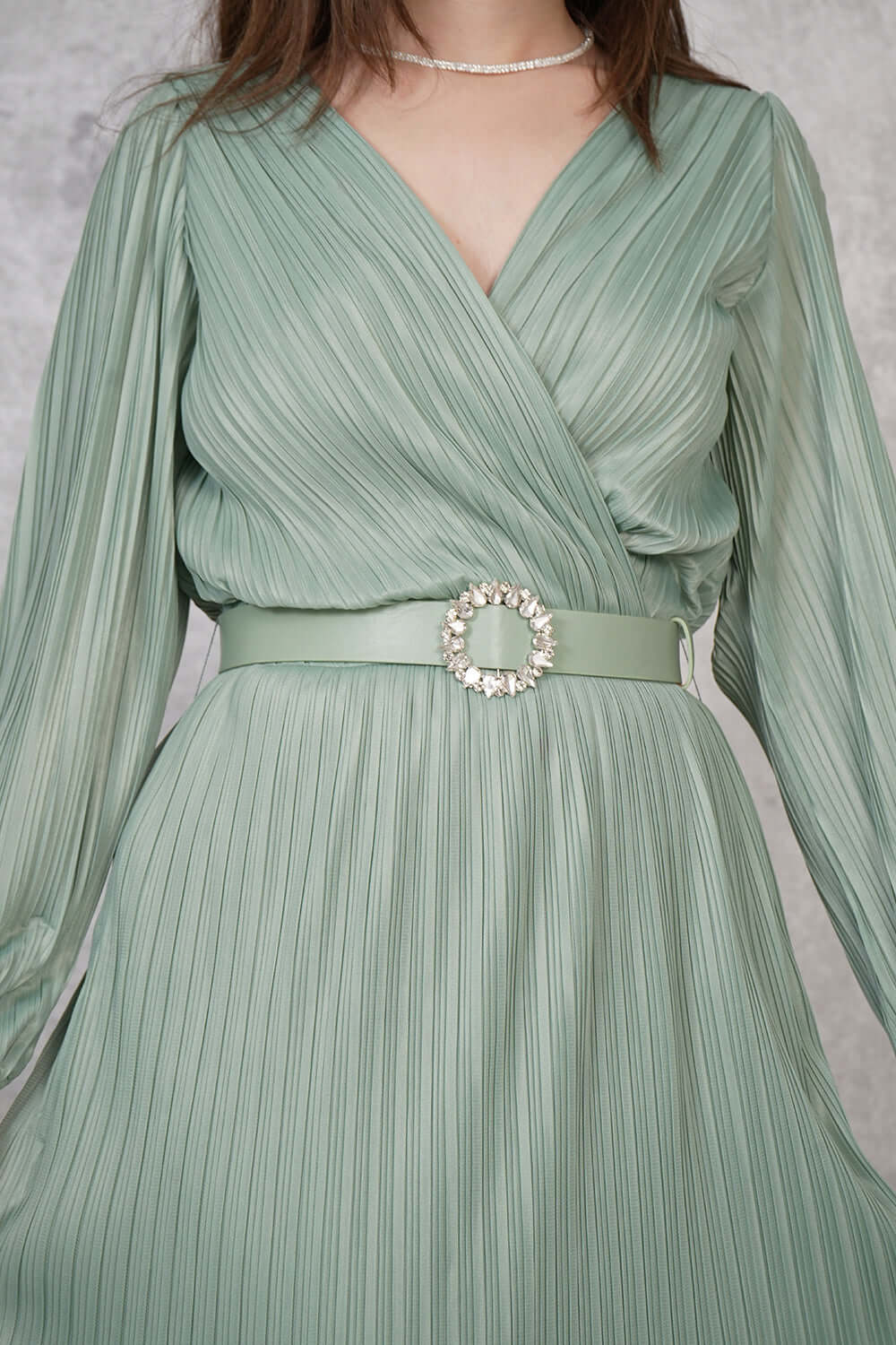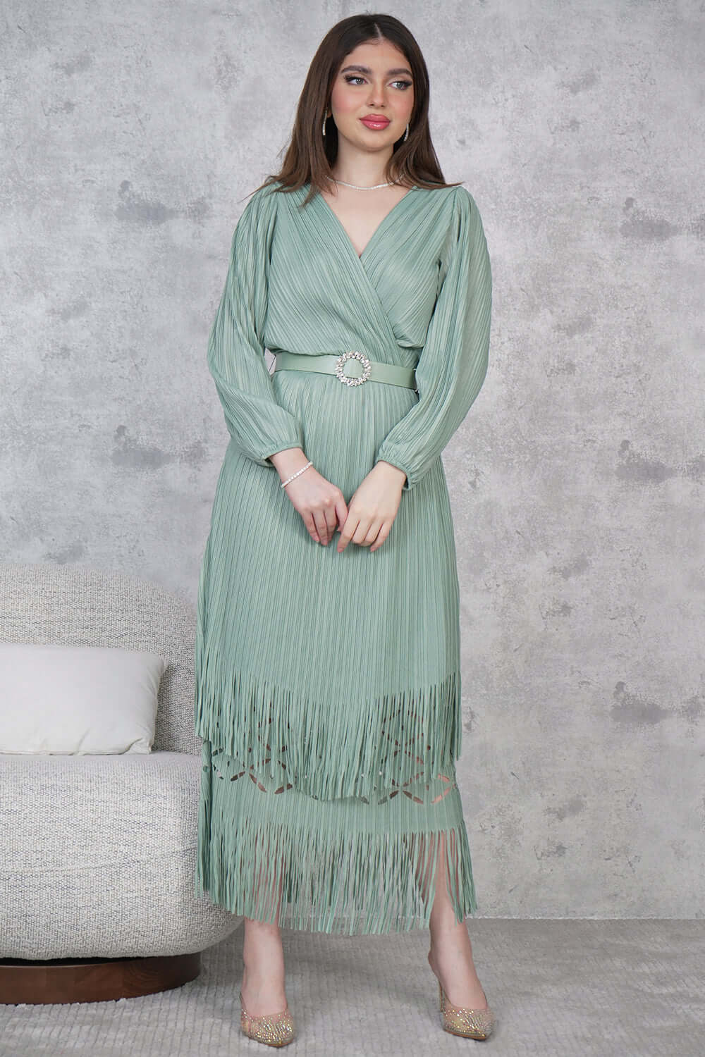 • نوع القصة: فستان ميدي بليسيه بطبقات، مزين بحزام عالخصر، وأكمام دانتيل طويلة، وياقة V
