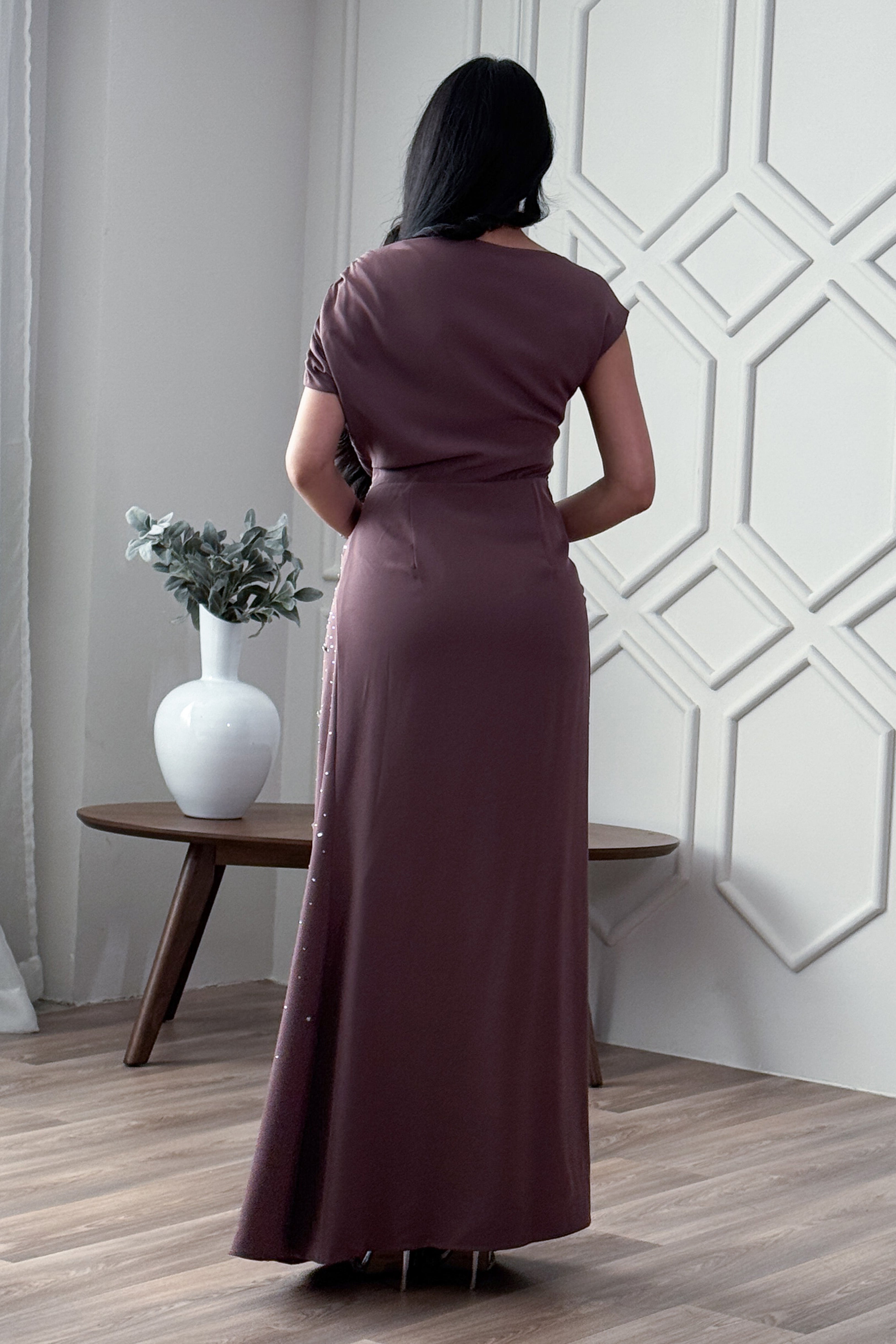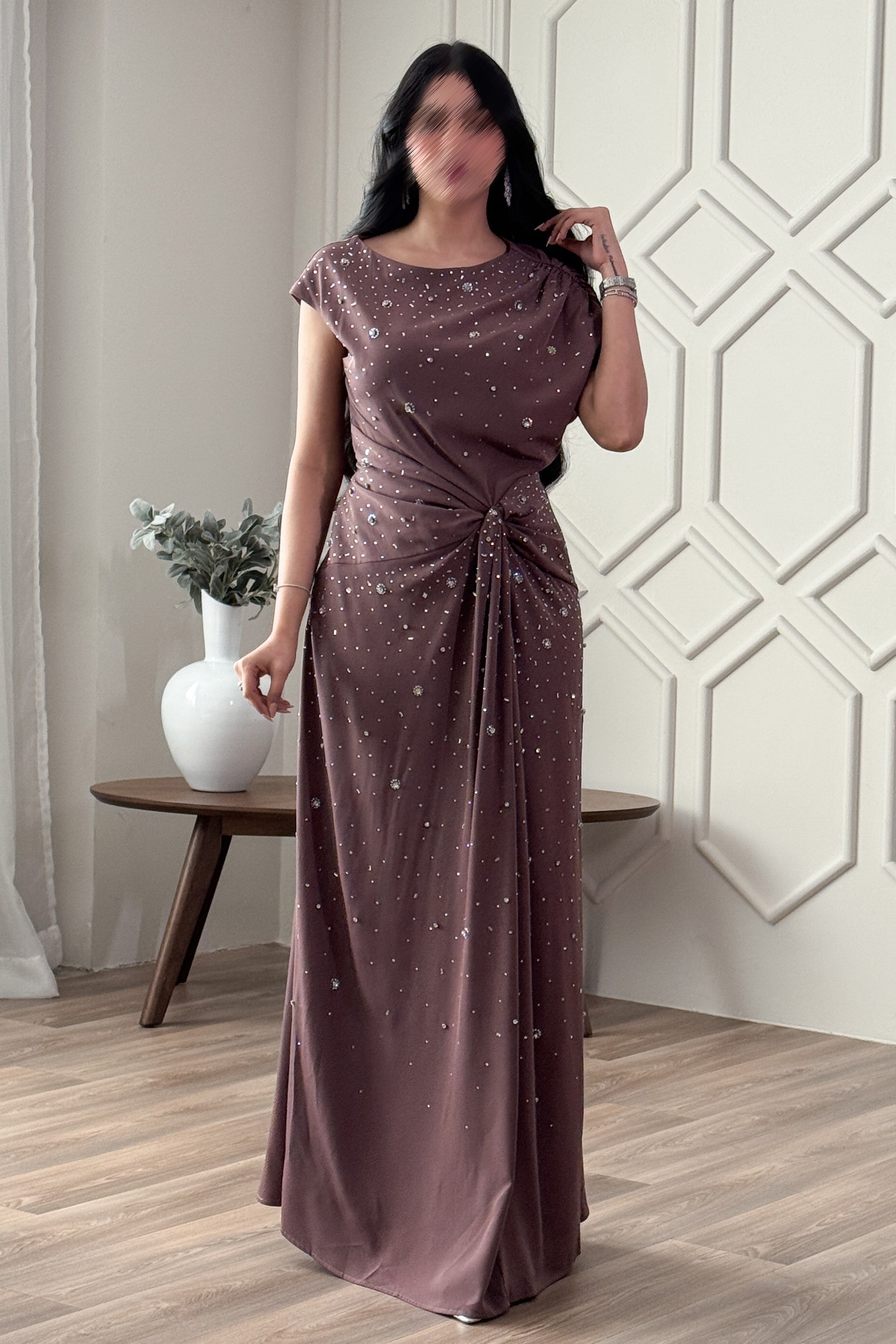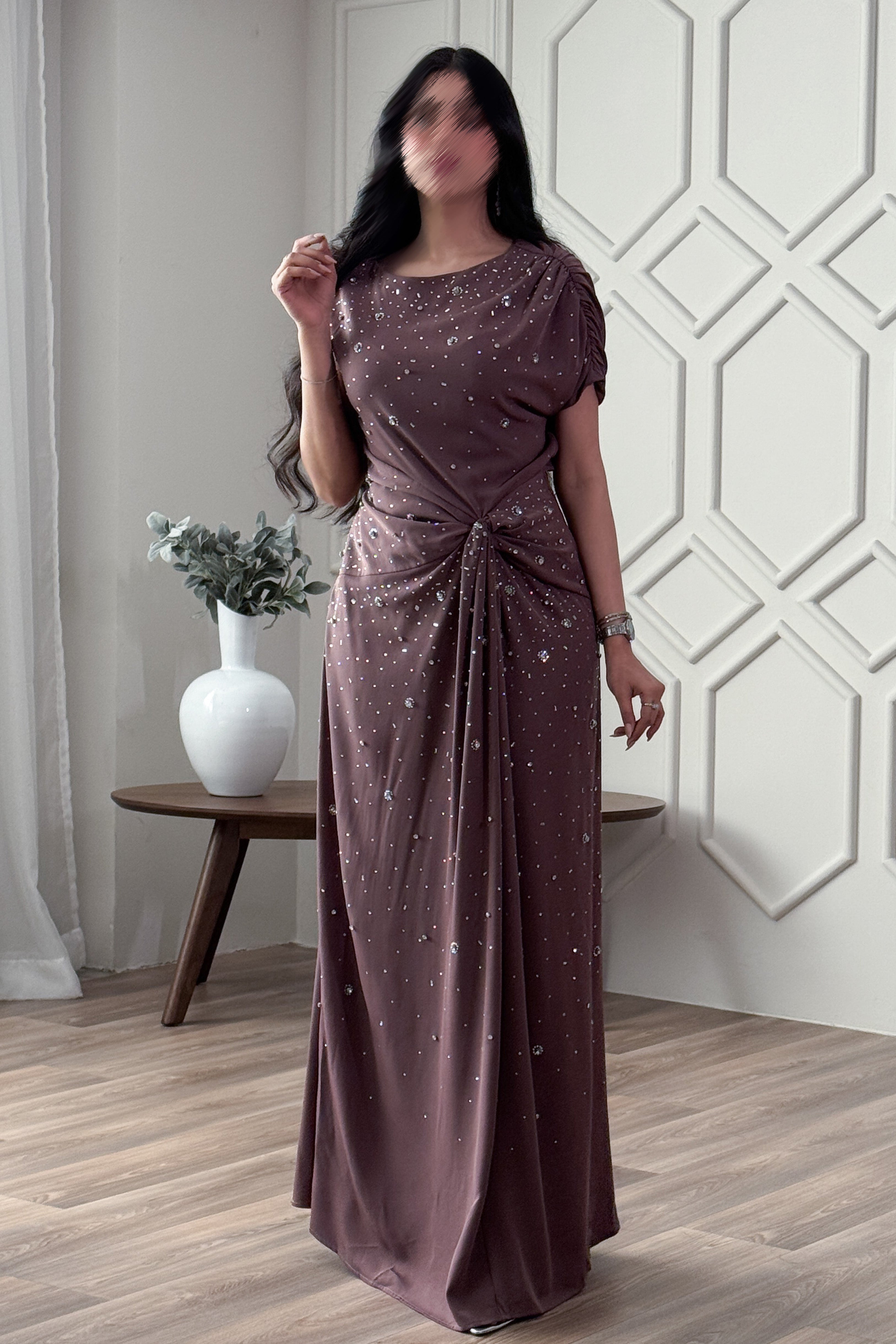 فستان بني سهرة ماكسي بزم مزين بالكريستال