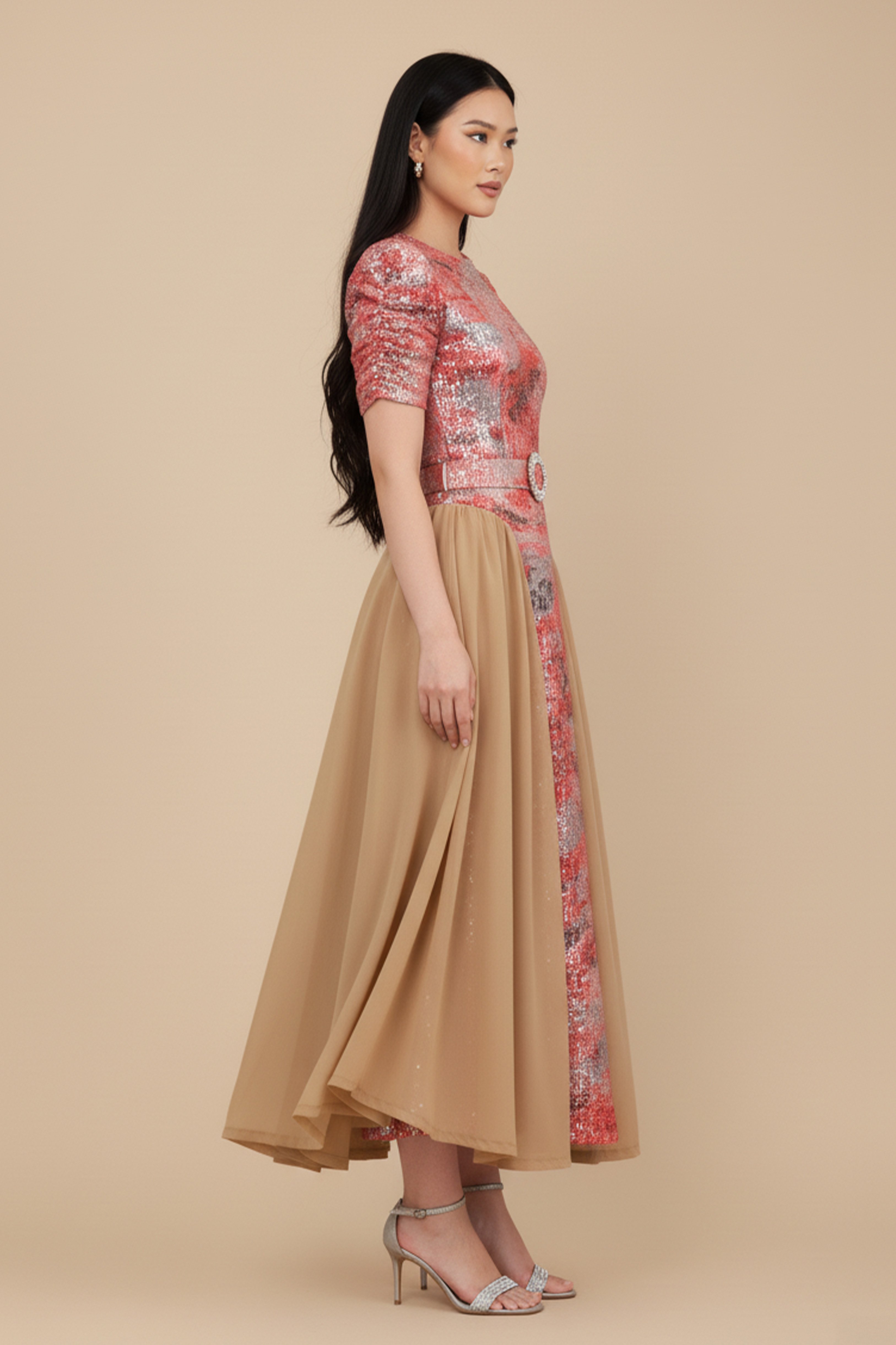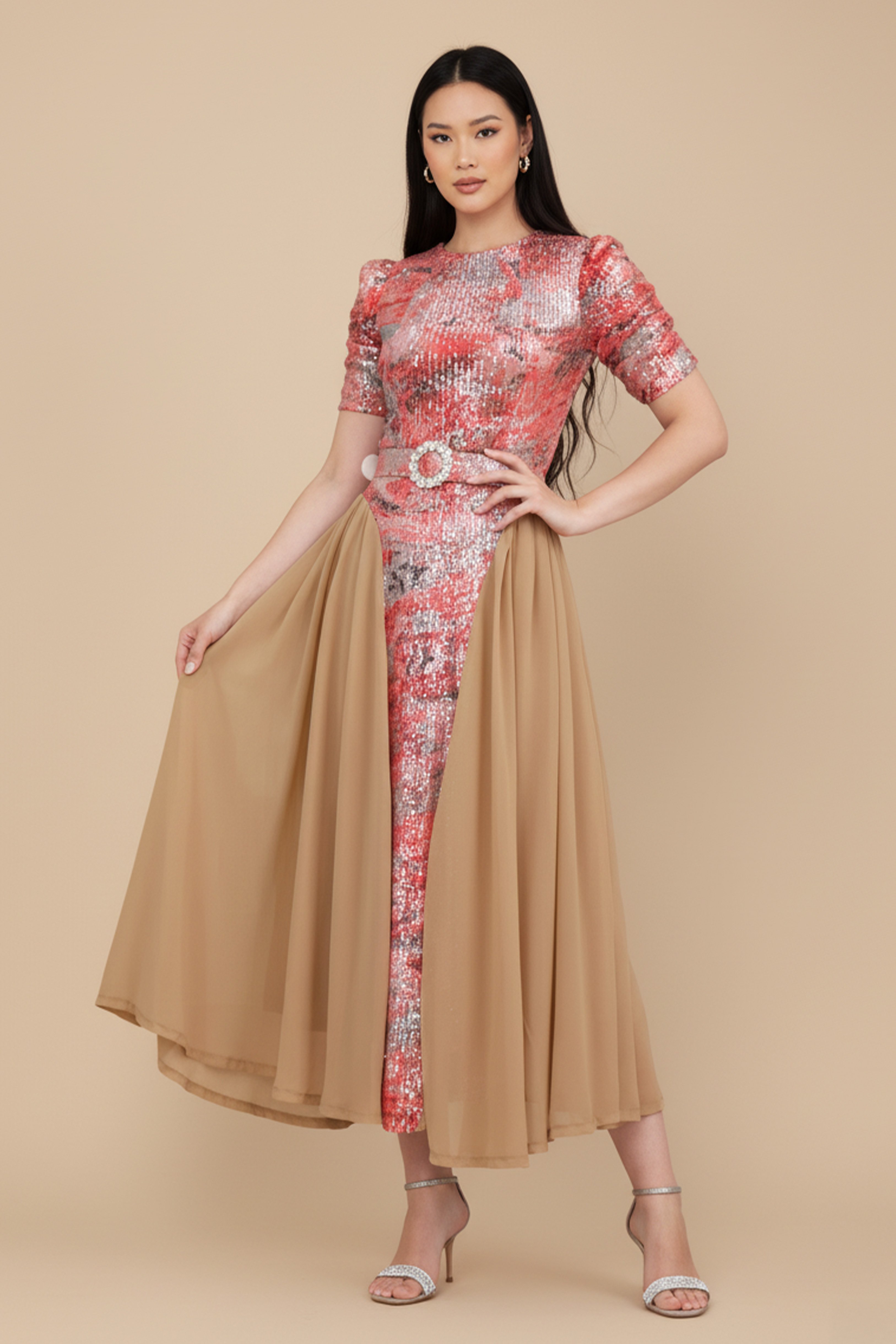 • نوع التصميم: فستان ترتر مموج اللون بكسرات