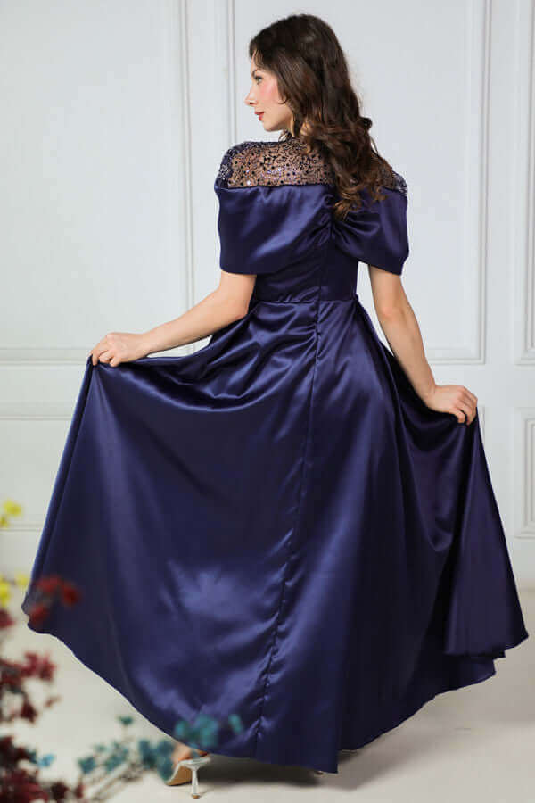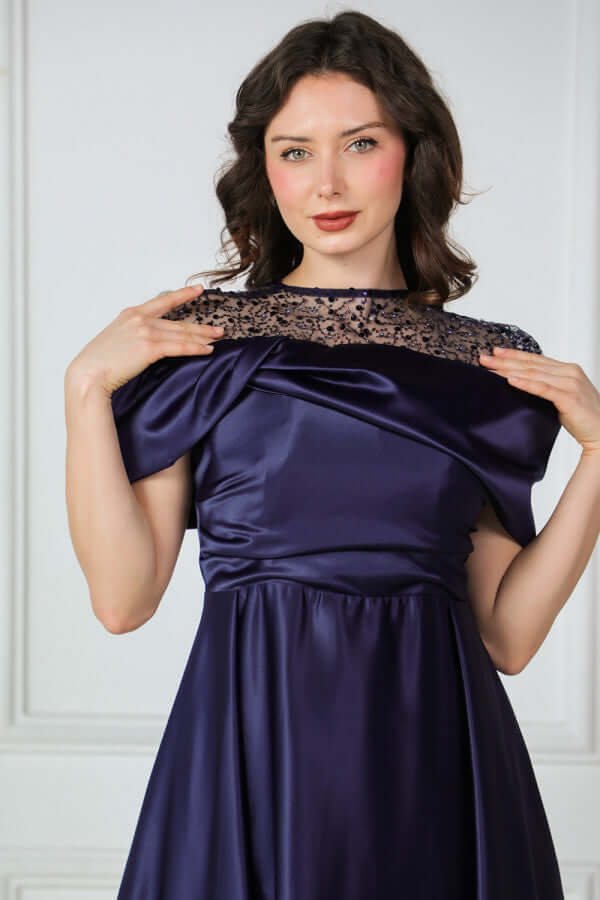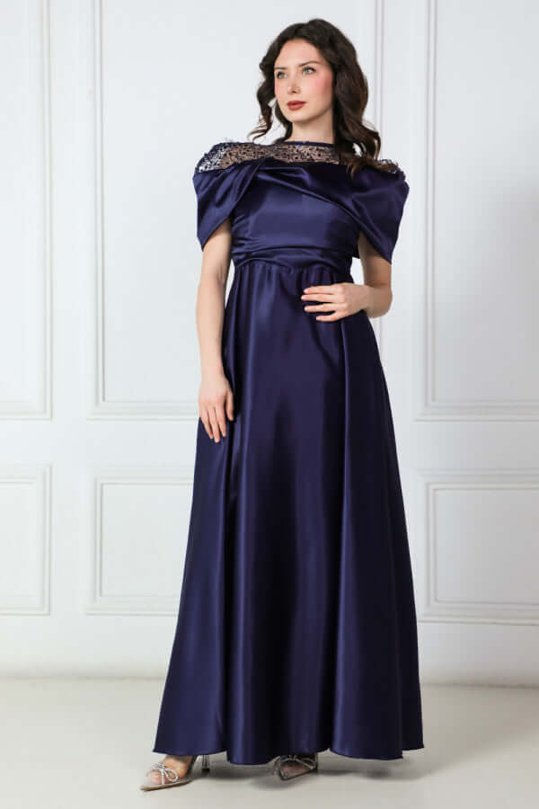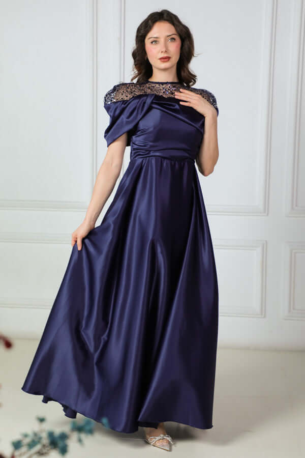 فستان تفته ساتان باكمام الكوله لون كحلي