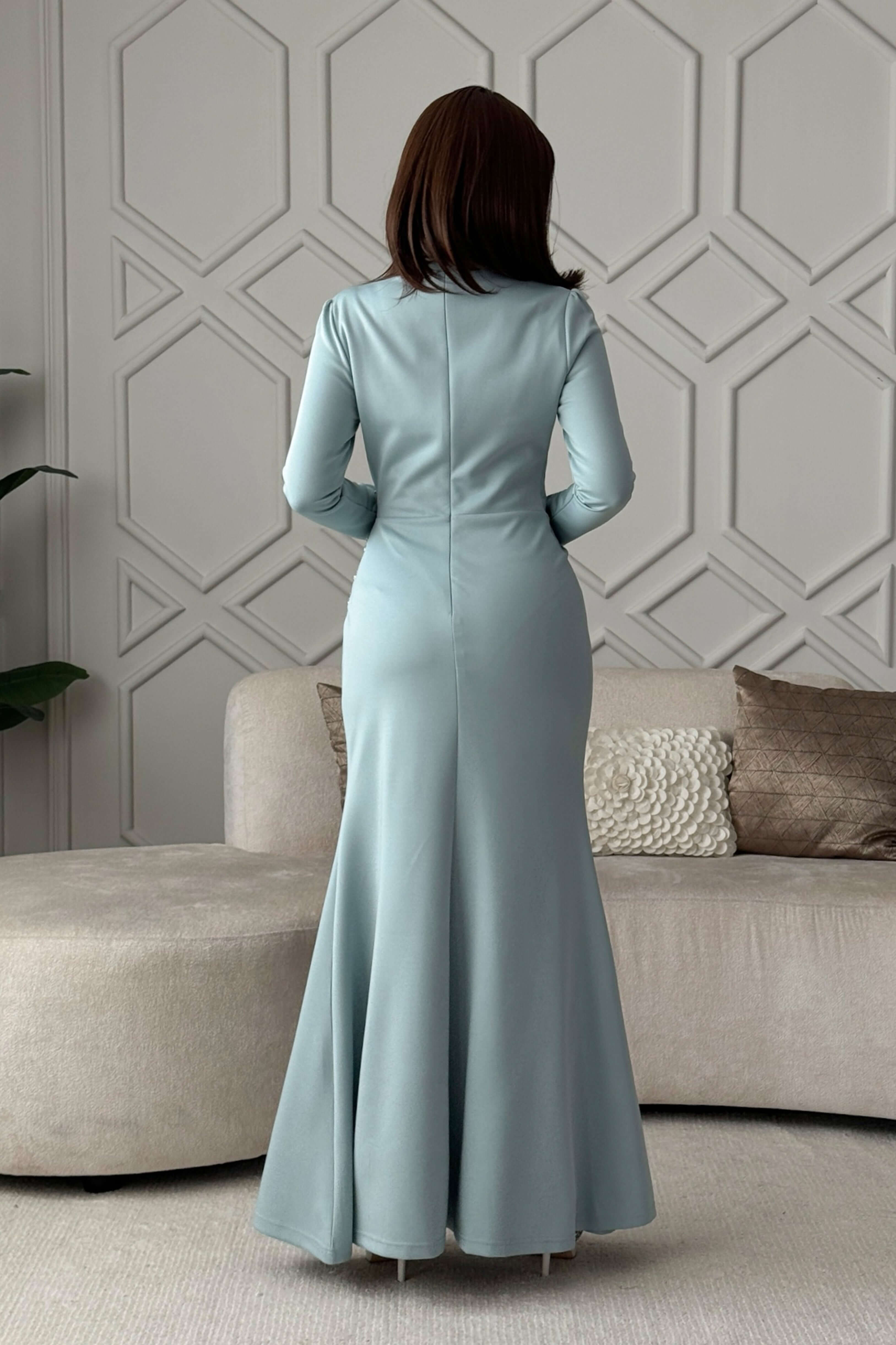 فستان طويل بقصة درابيه مزين بالكريستال، بأكمام طويلة وياقة دائرية ضيقة