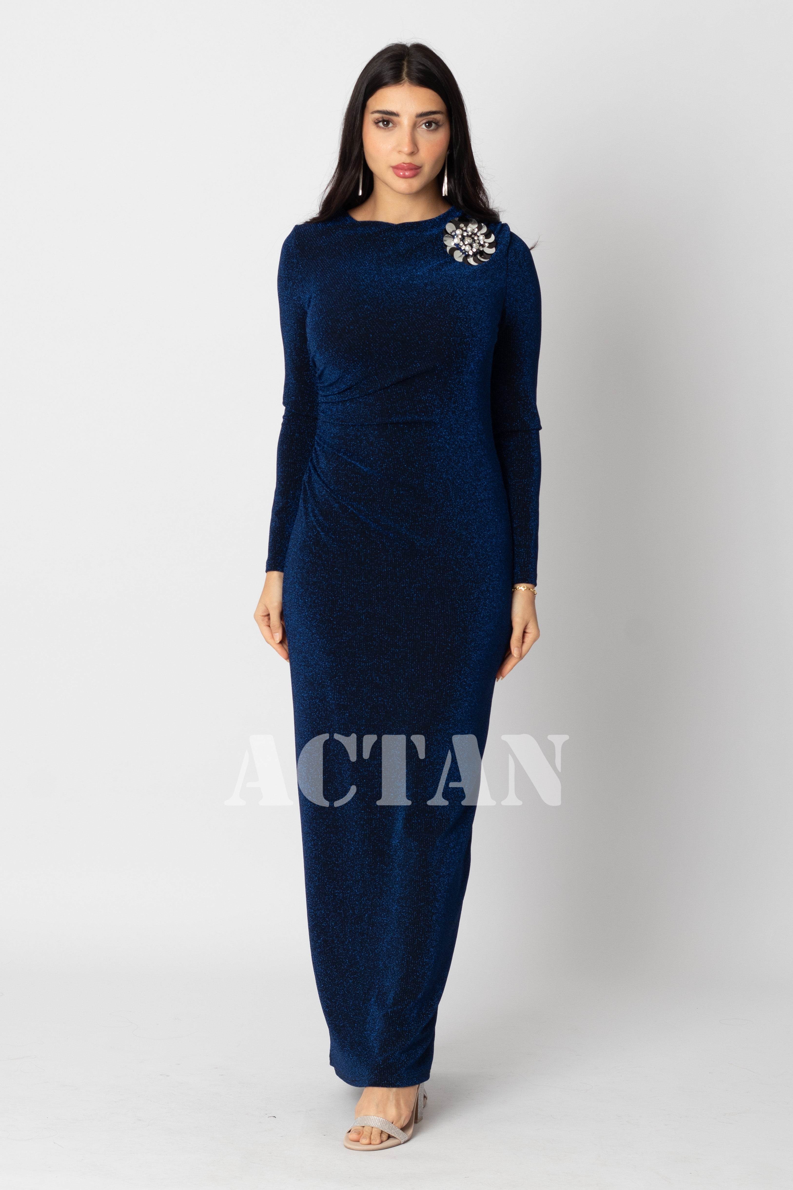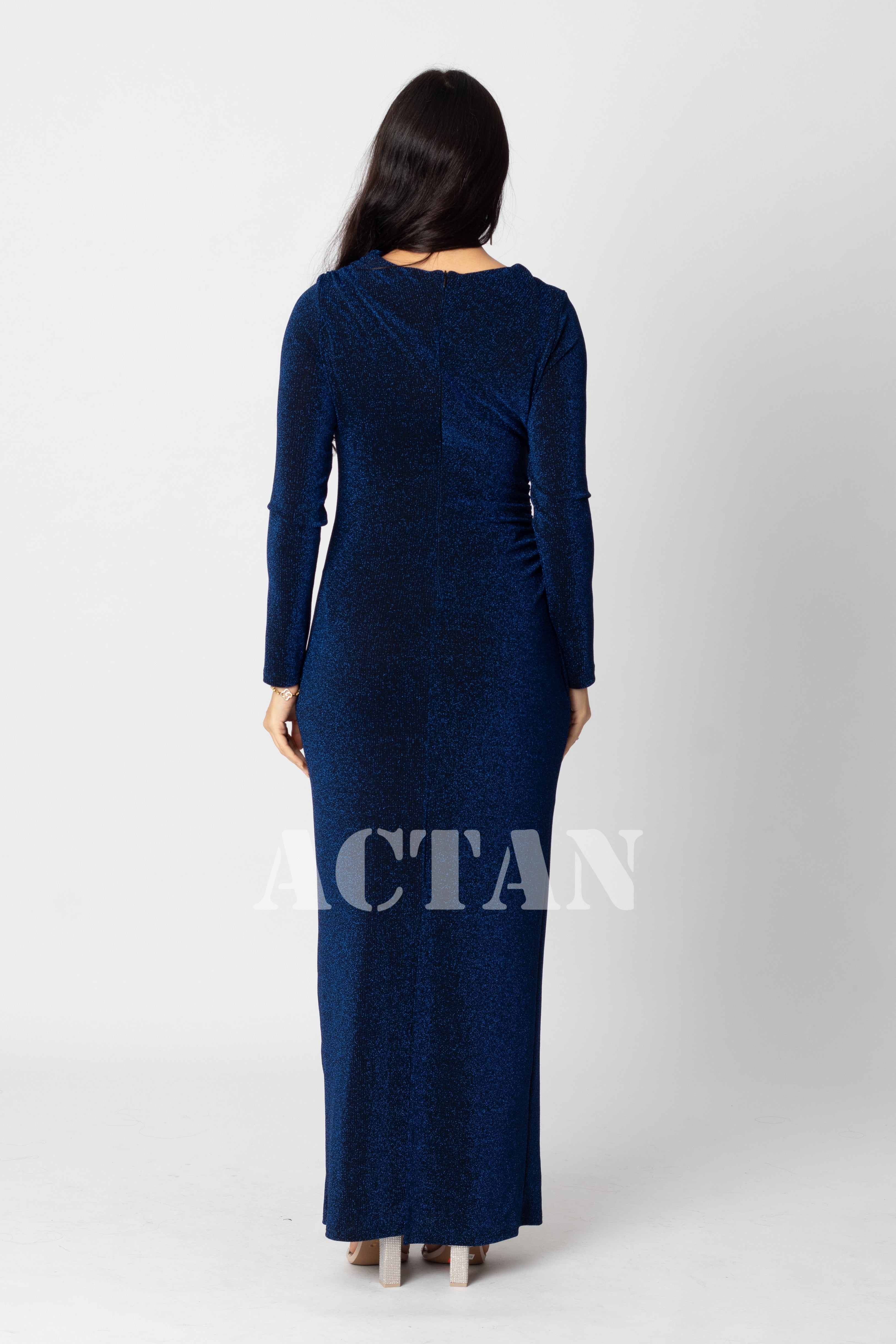 • نوع القصة: فستان جورسيه ماكسي بخصر مزموم بأكمام طويلة وياقة دائرية ضيقة