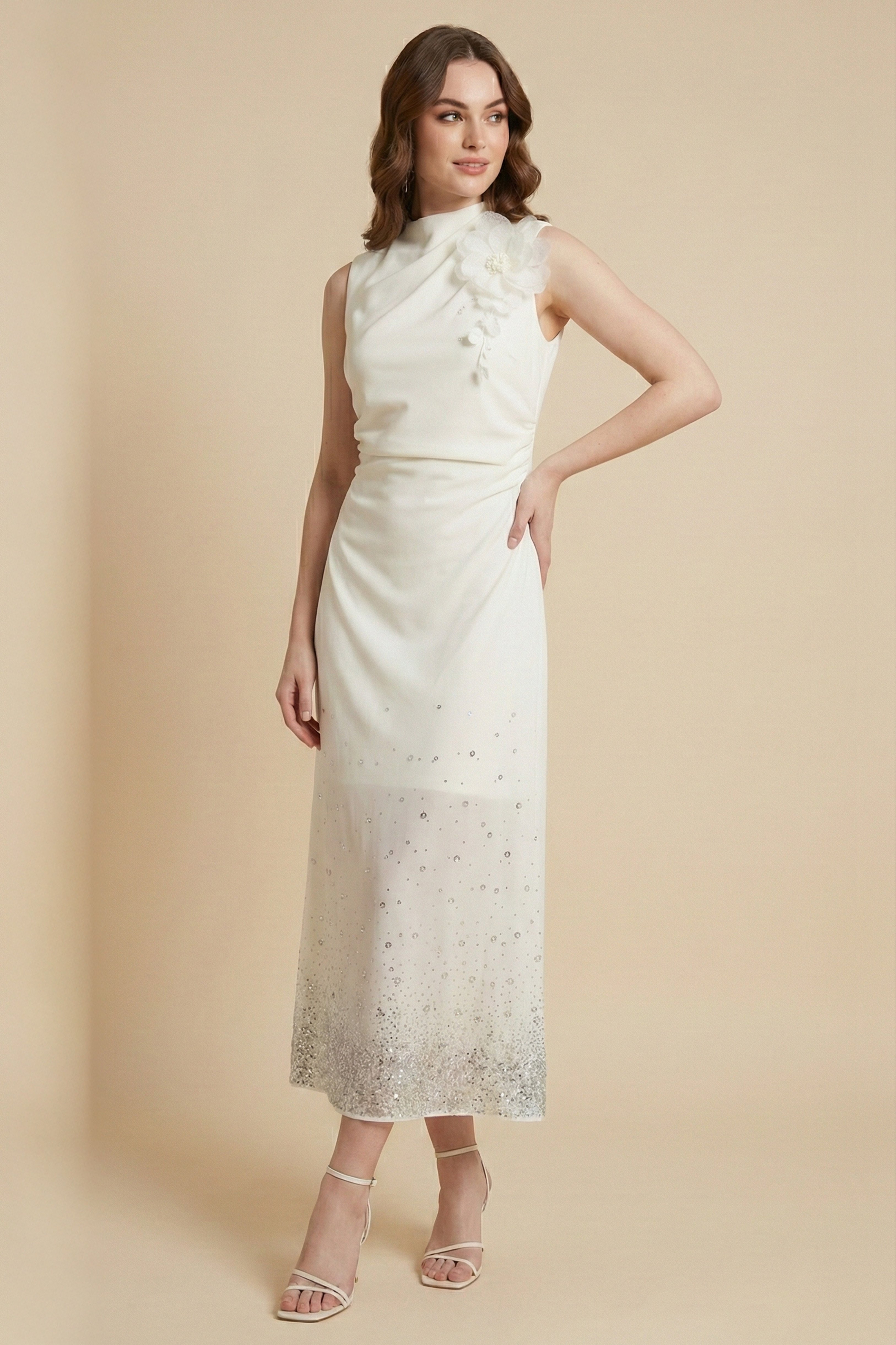 نوع القصة: فستان درابية مزين ببروش ورد وكريستال بفتحة من الخلف