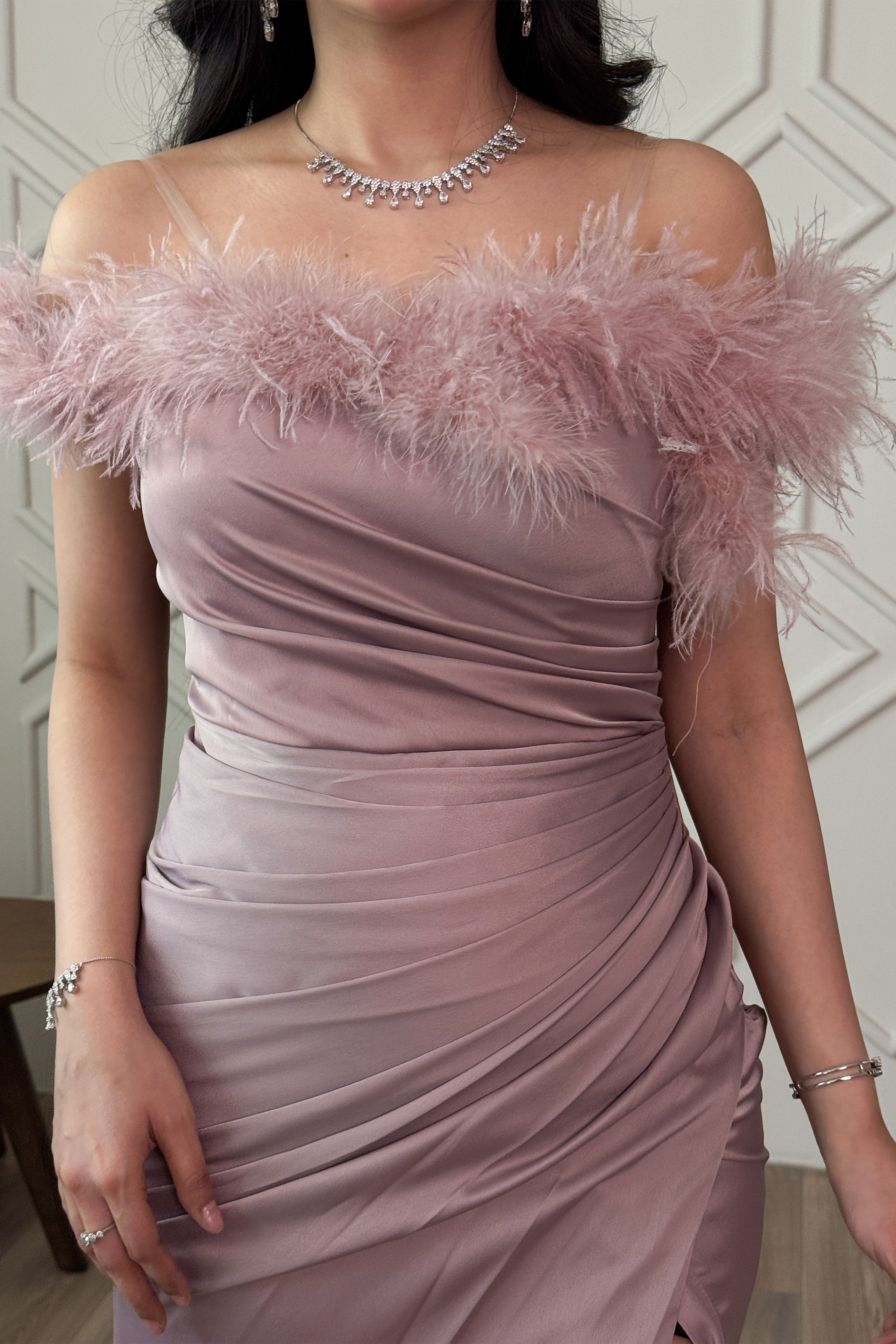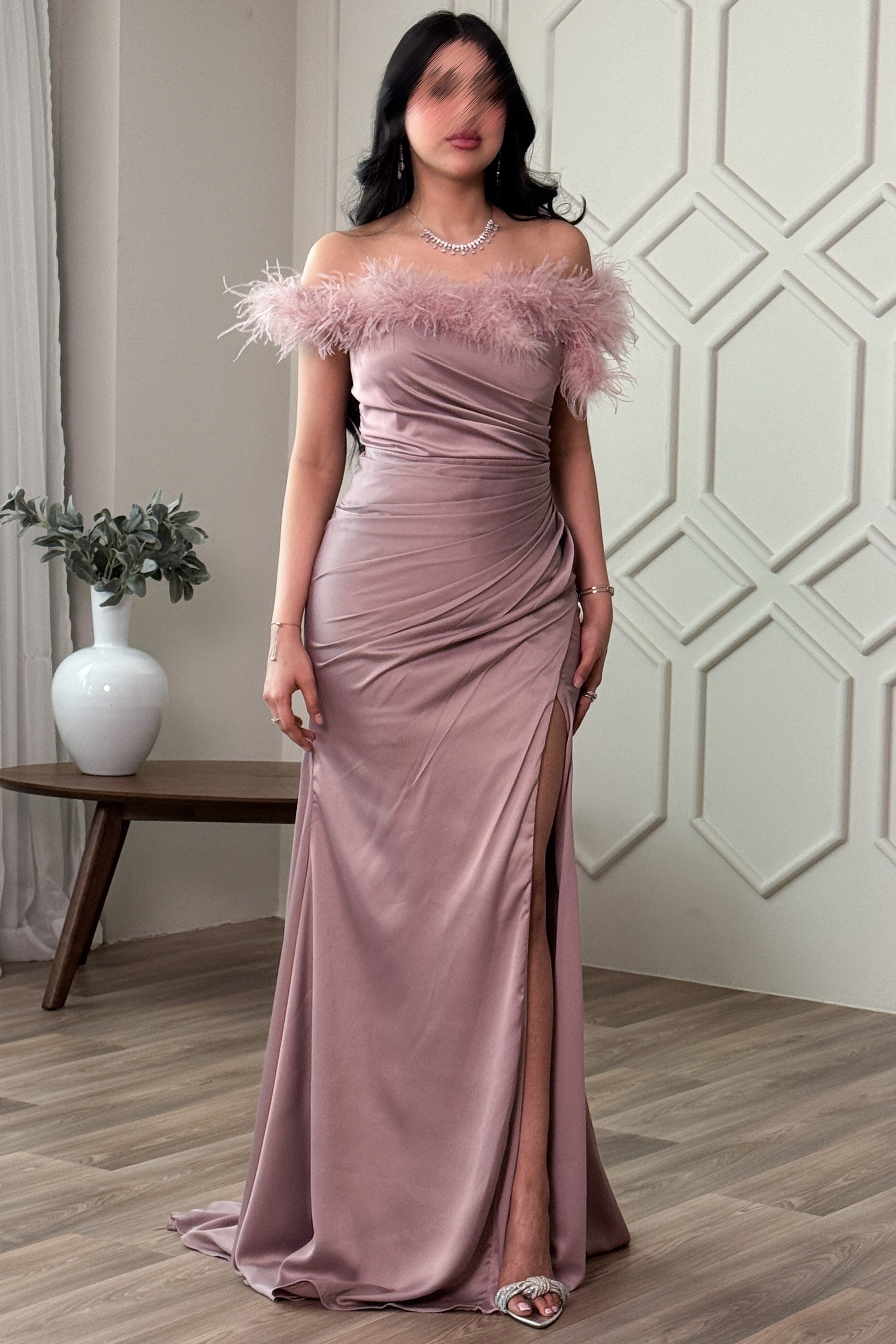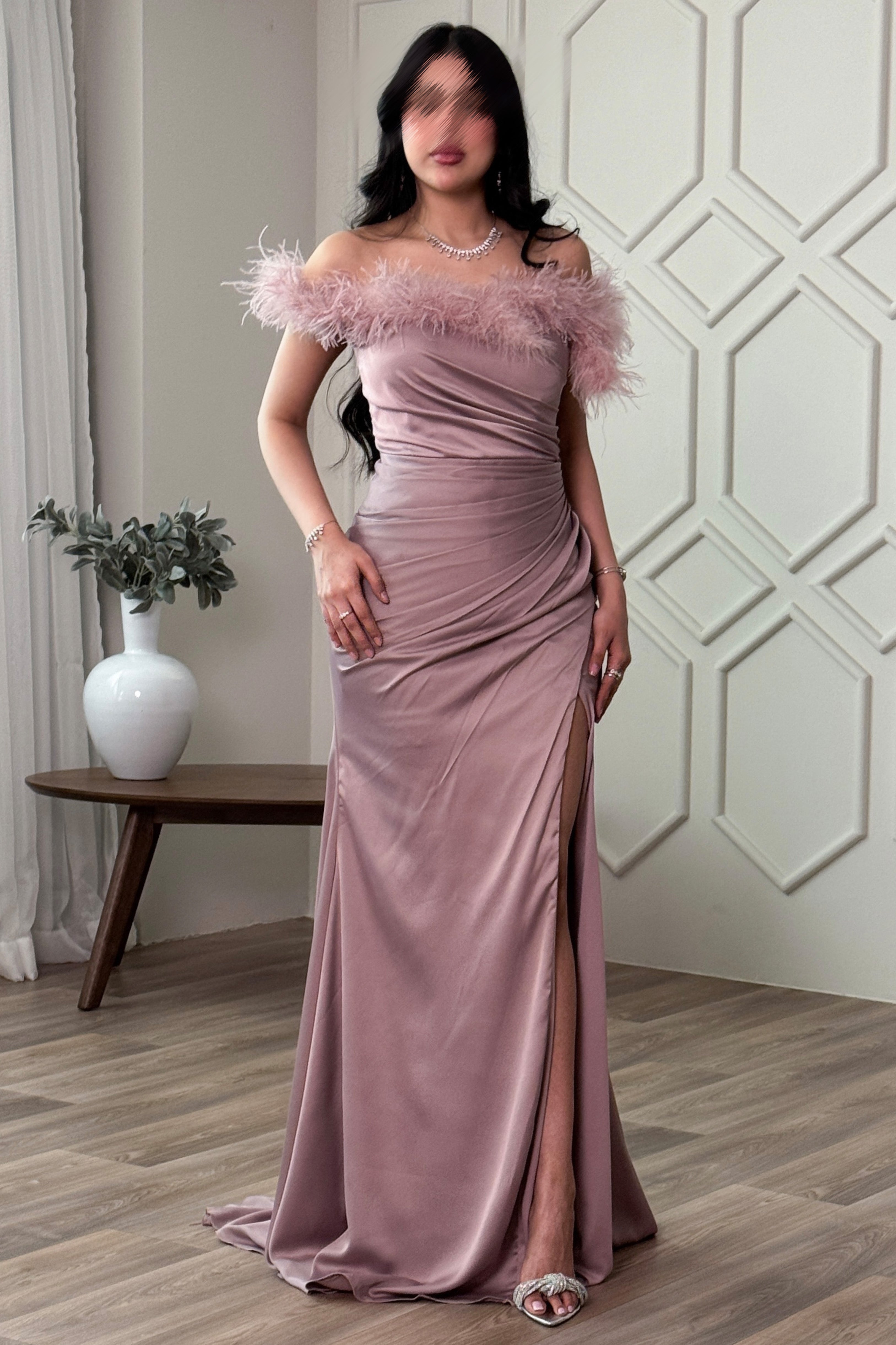 الخامة خفيف التمدد نوع التصميم فستان ساتان مزين بريش نوع القصة طويل قصة ورب بفتحه الاكمام اوف شولدر مزين بريش الصدر درابيه المناسبة خروج سهره الخصر مزموم الاكمام اوف شولدر التمدد غير قابل لتمدد الاضافات ريش عالاكمام ارشادات العناية قابل للغسيل والكي بدرجة حراره منخفضه