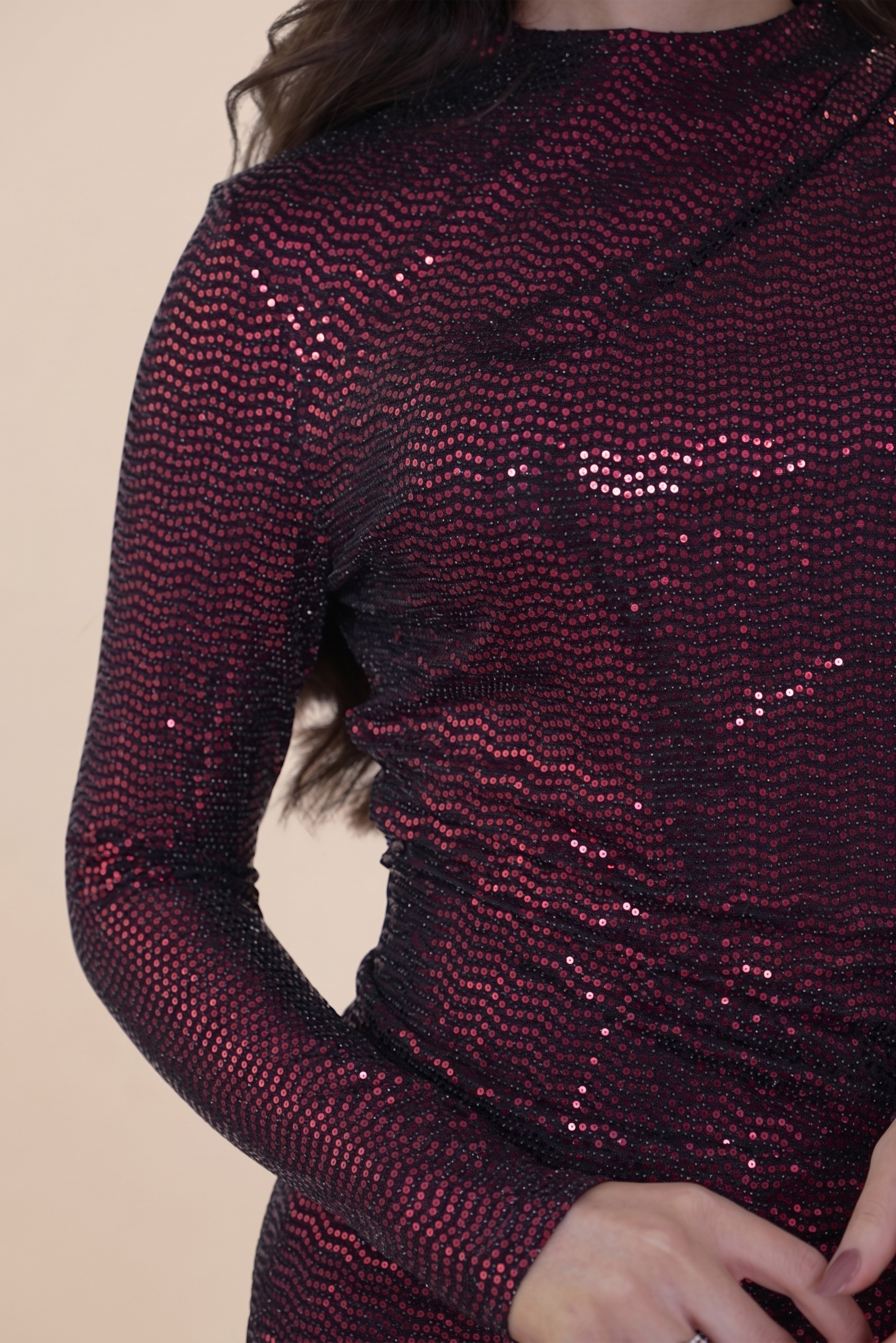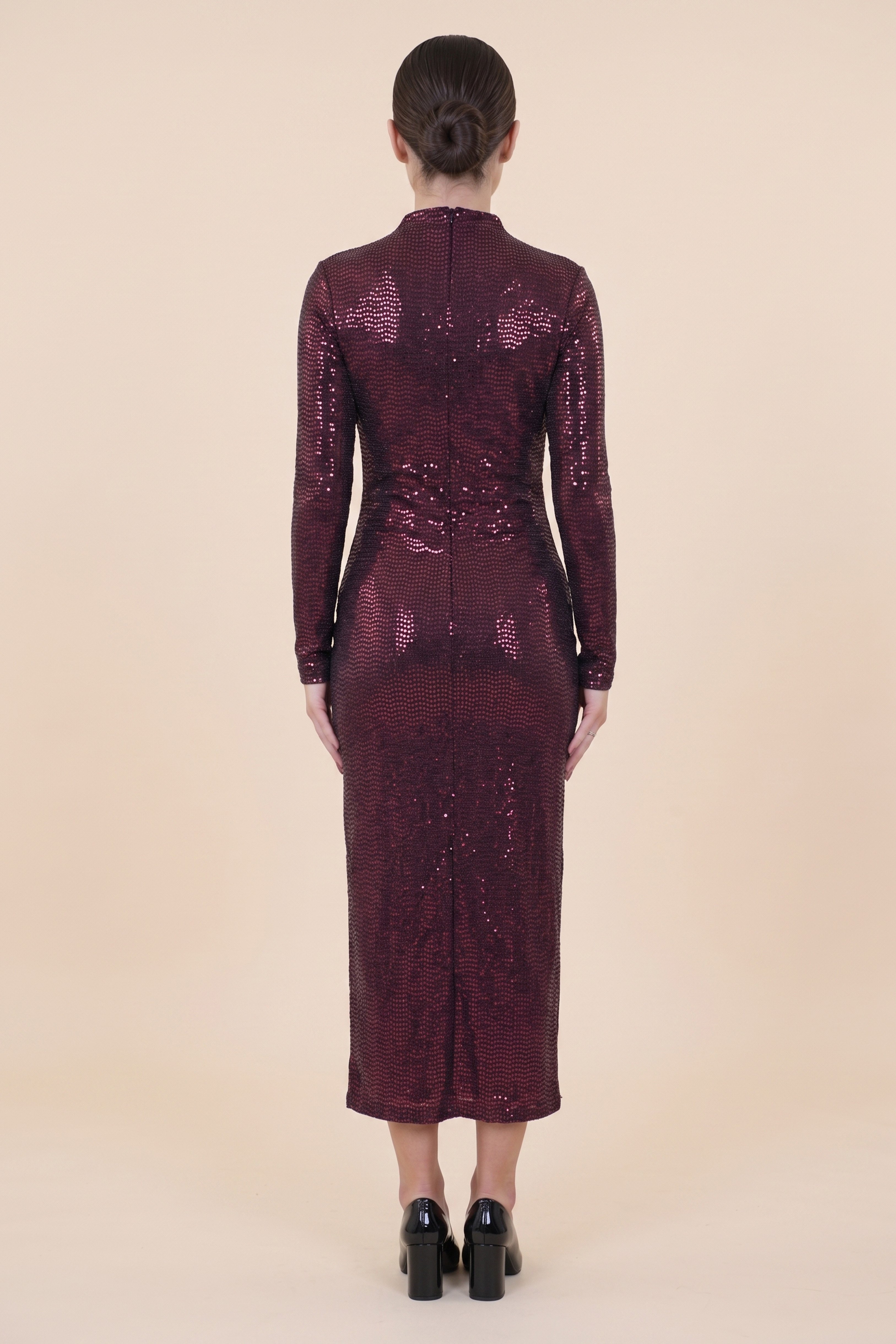 فستان سهرة أحمر لامع ميدي بفتحة أمامية وأكمام طويلة