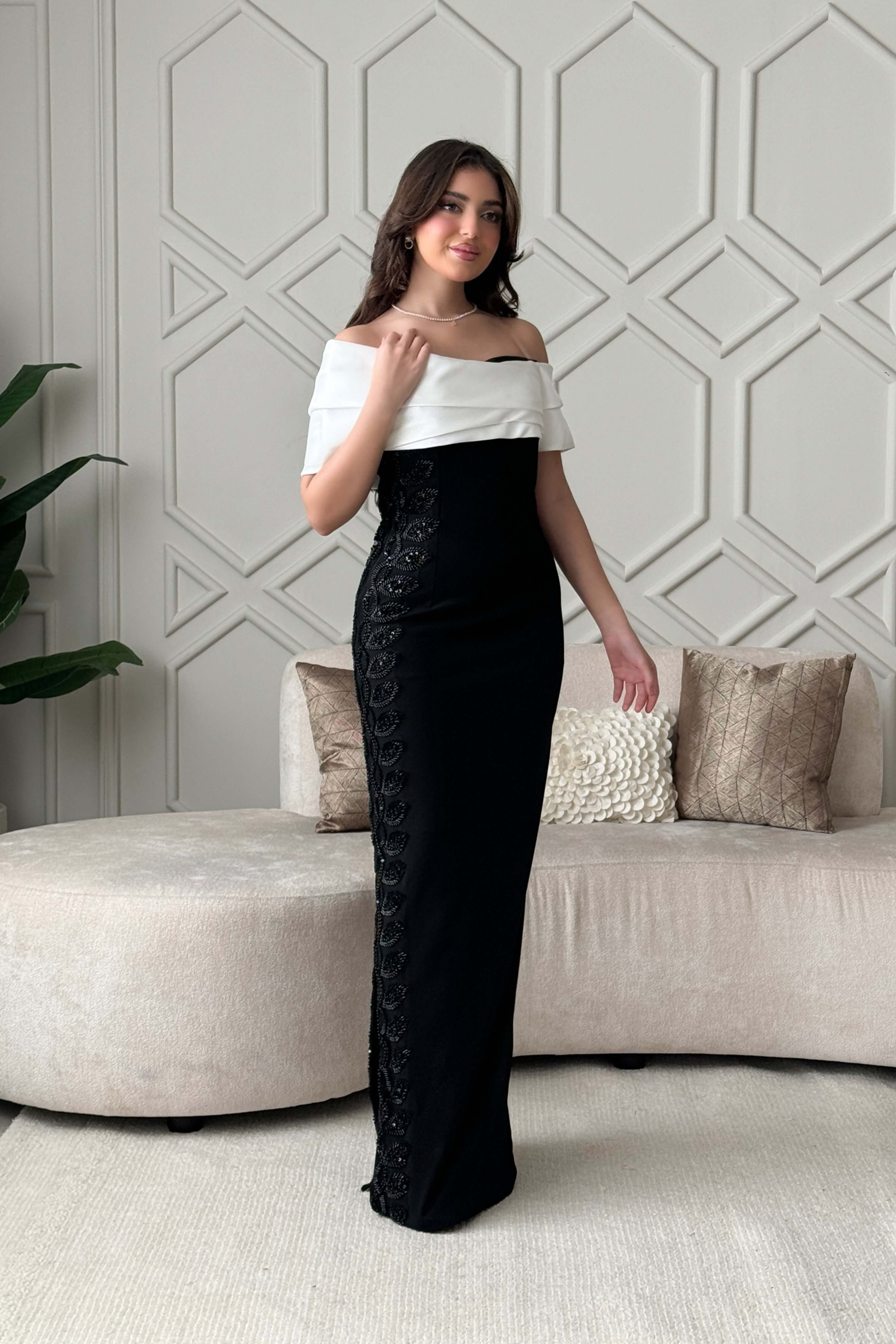 : فستان سهرة ماكسي أوف شولدر مزين بالخرز