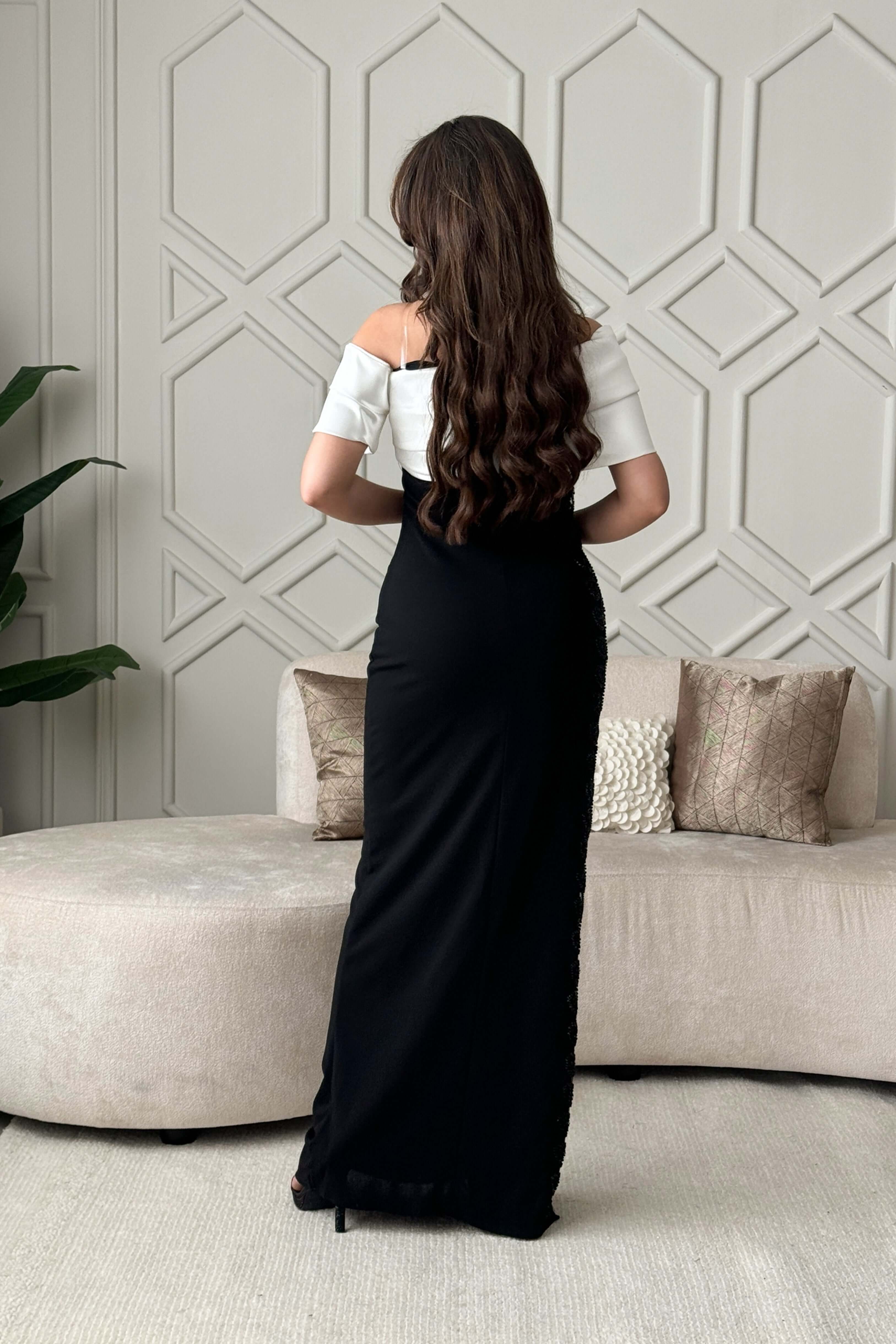 : فستان سهرة ماكسي أوف شولدر مزين بالخرز بفتحة من الجانب