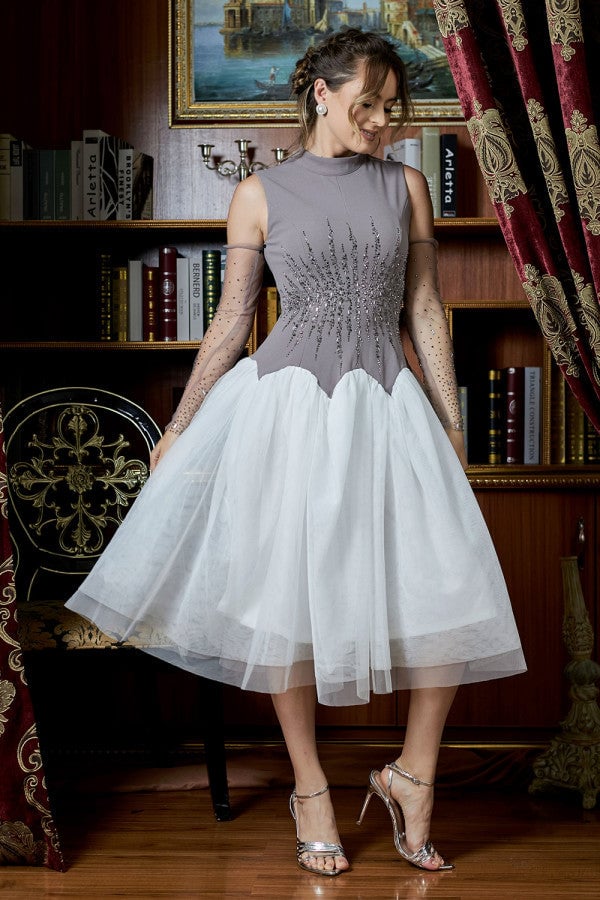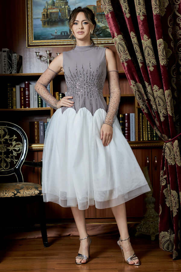 فستان سهره بتصميم اكمام منفصله لون رصاصي