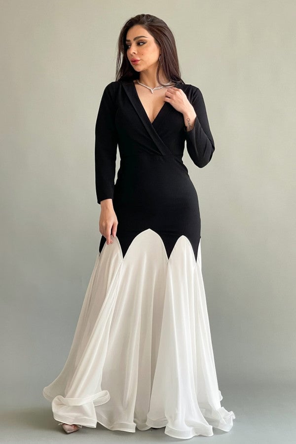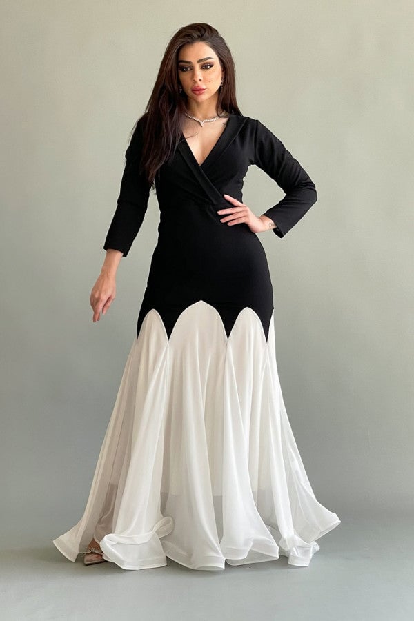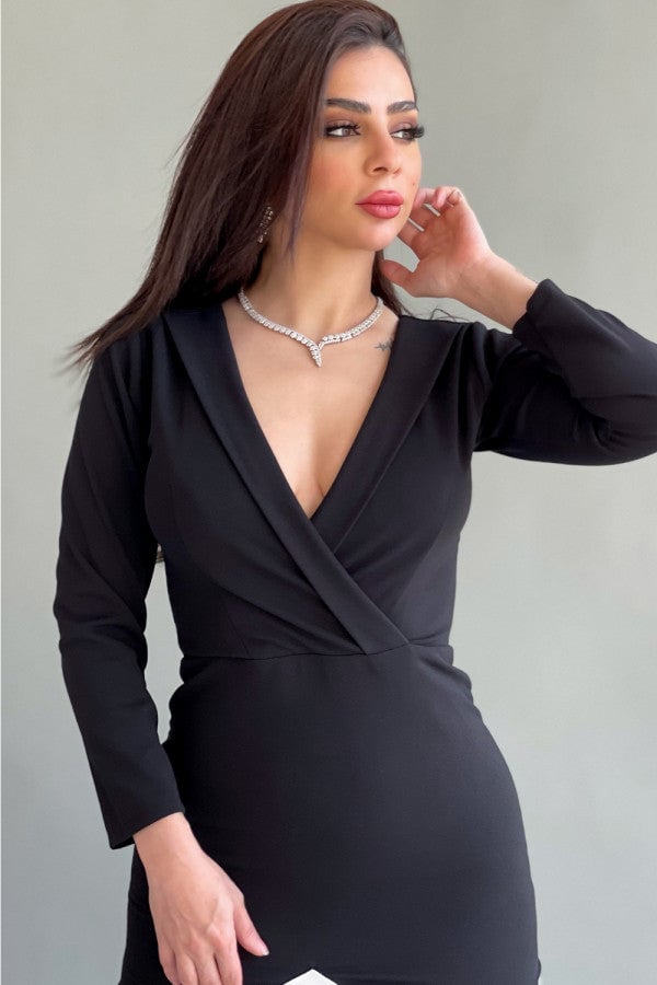 طويل بقصة شوقر من الأسفل، ضيق الخصر، وياقة V لف