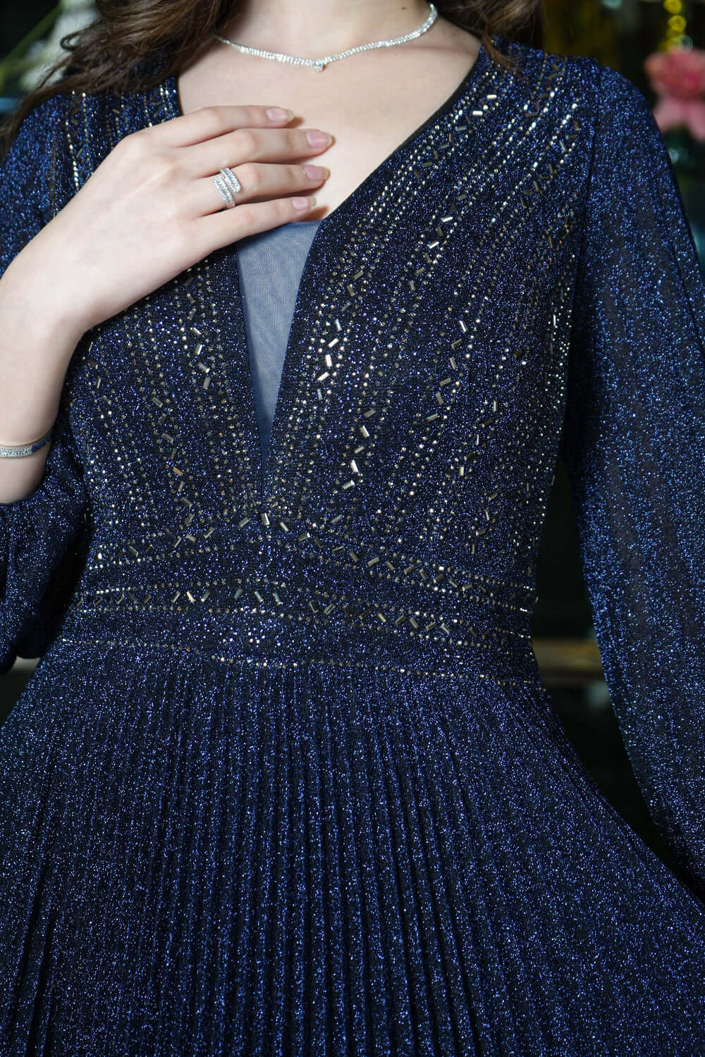 نوع القصة: فستان سهرة طويل بليسيه مزين بالفصوص بأكمام طويلة وياقة V