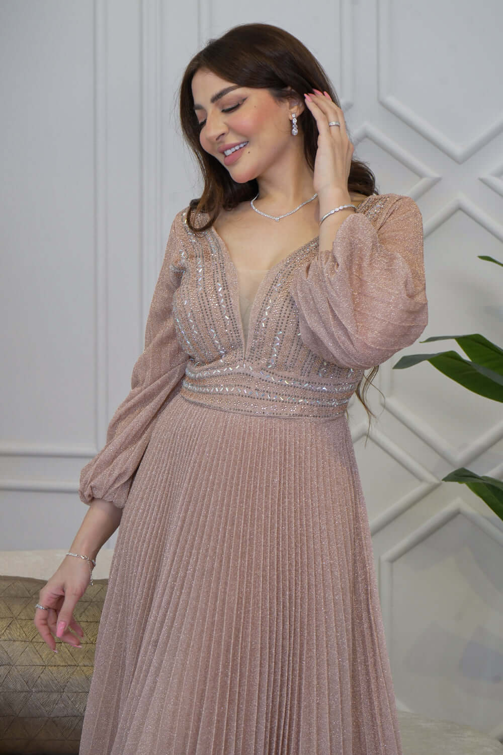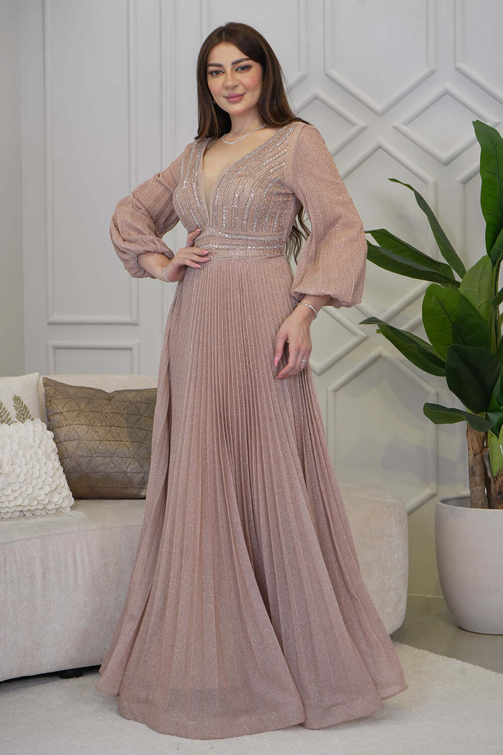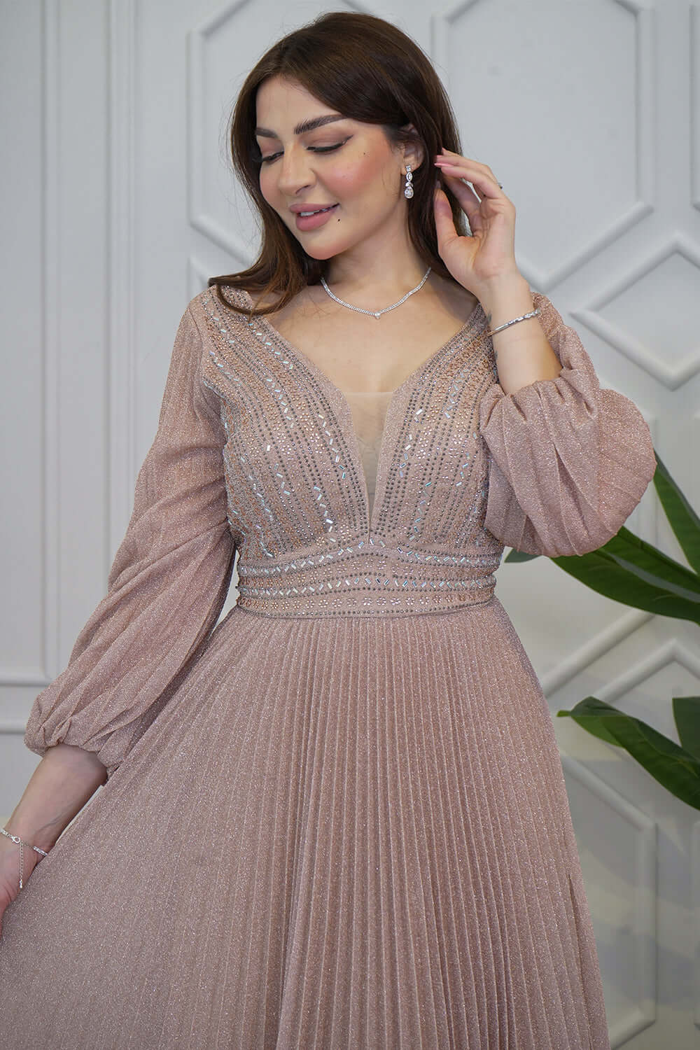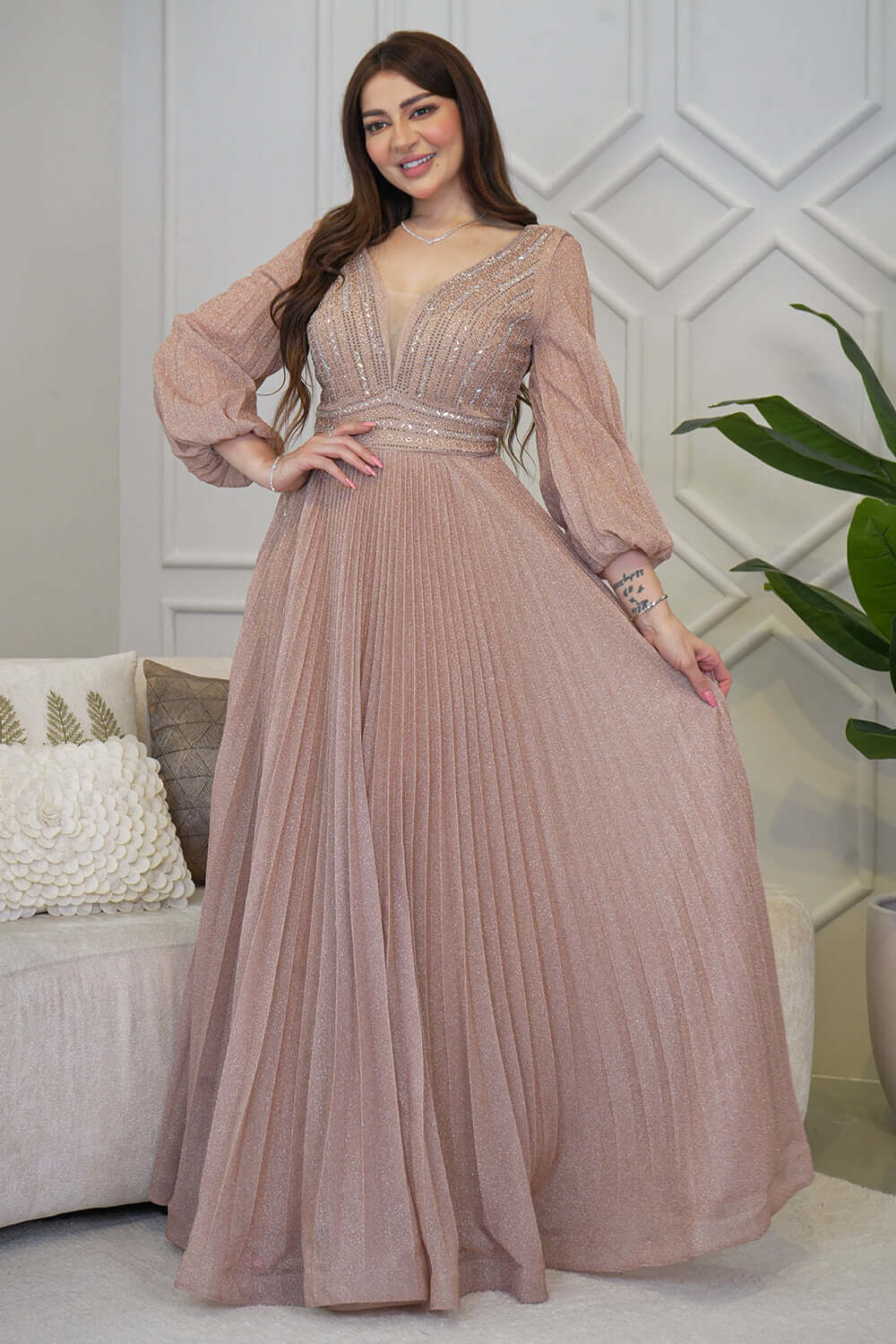 نوع القصة: فستان سهرة طويل بليسيه مزين بالفصوص بأكمام طويلة وياقة V