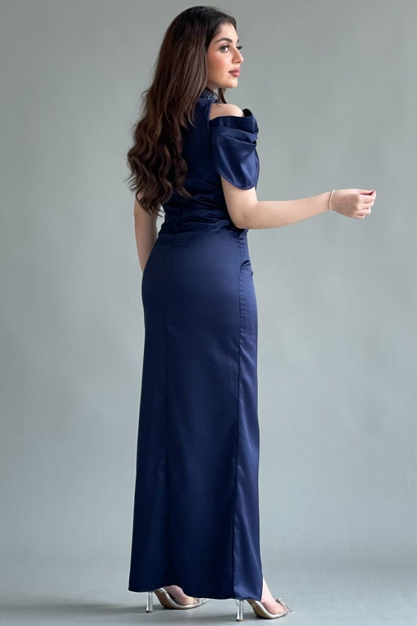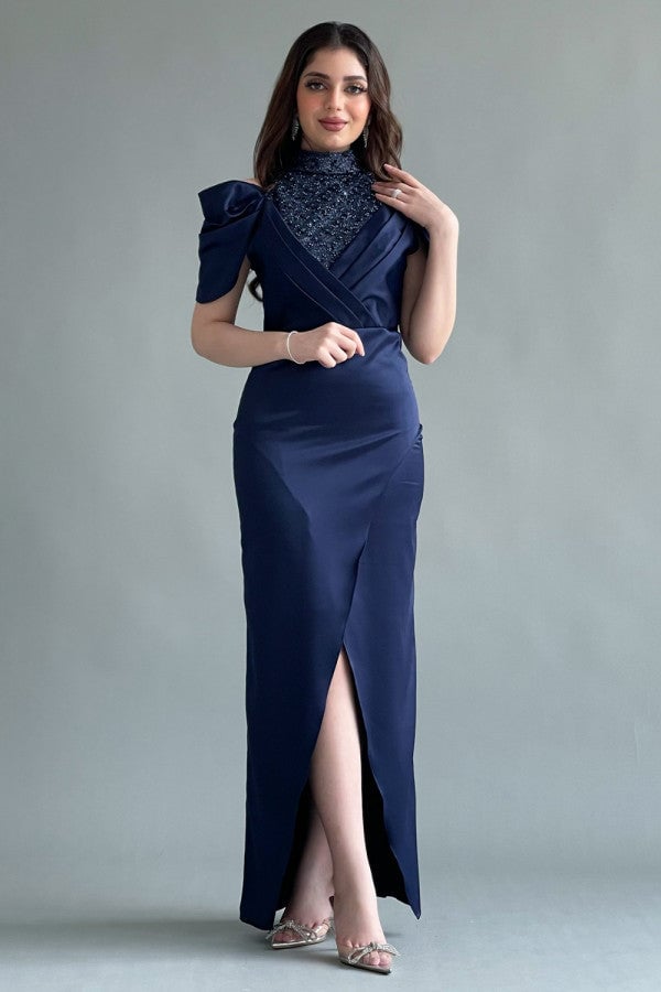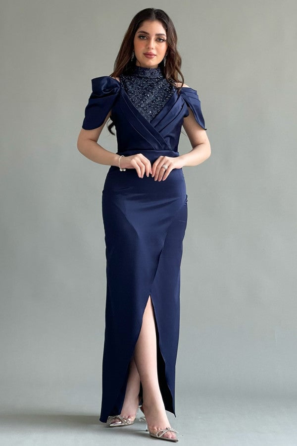 فستان سهره ماكسي بياقه مطرزه لون كحلي