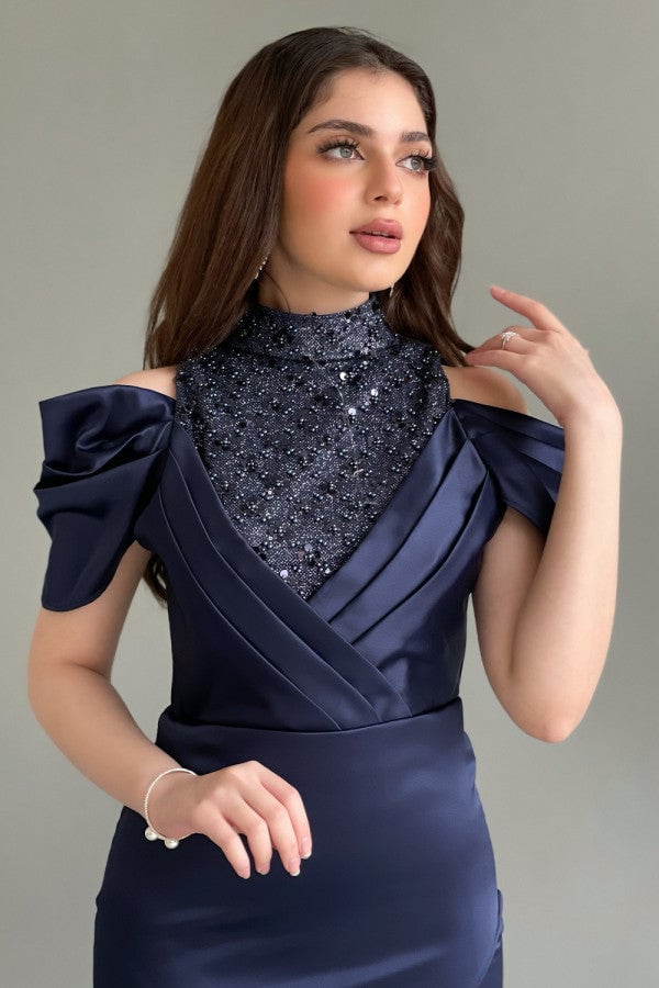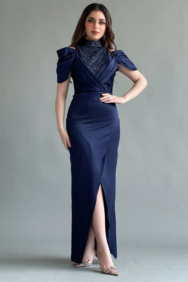 : فستان طويل بقصة ضيقة مع لف من الأسفل وفتحة صدر مطرزة بياقة عالية وكتف مكشوف وكم قصير