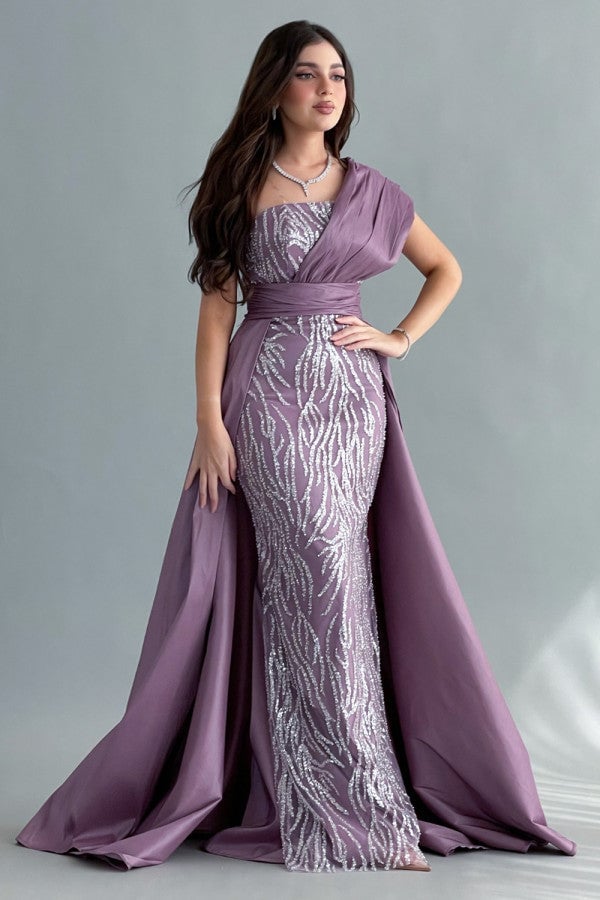 فستان سهرة مطرز بتصميم فاخر من تول مطرز مع تفته يمنحك إطلالة راقية في كل مناسبة. يتميز بقصة طويلة ضيقة مع توب بكتف واحد وذيل خلفي يضيف لمسة أنوثة وجاذبية.
