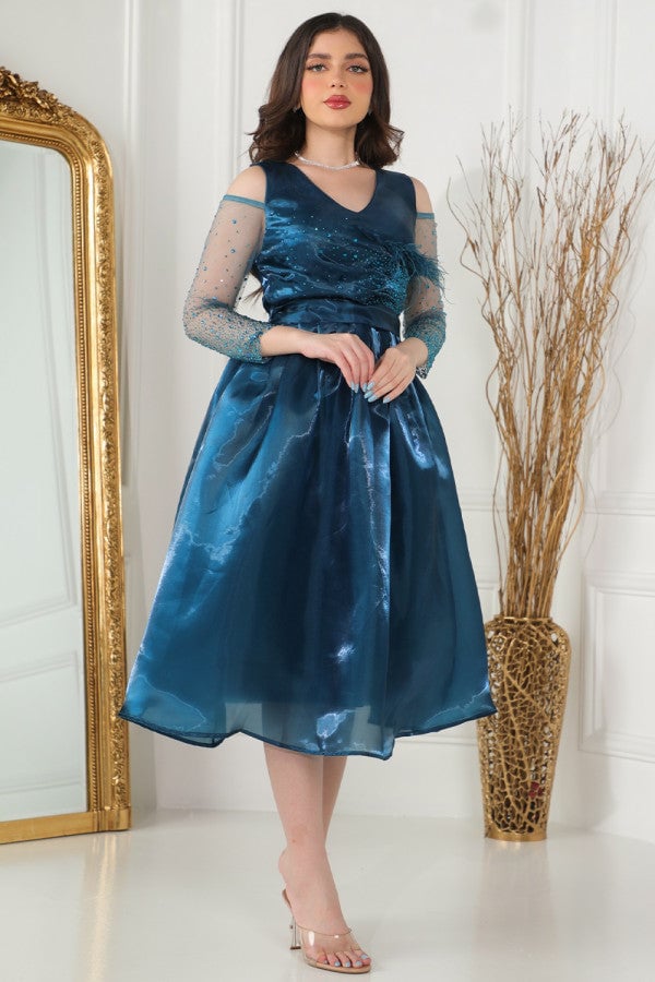 فستان سهره منفوش مزين بفصوص لون تركواز