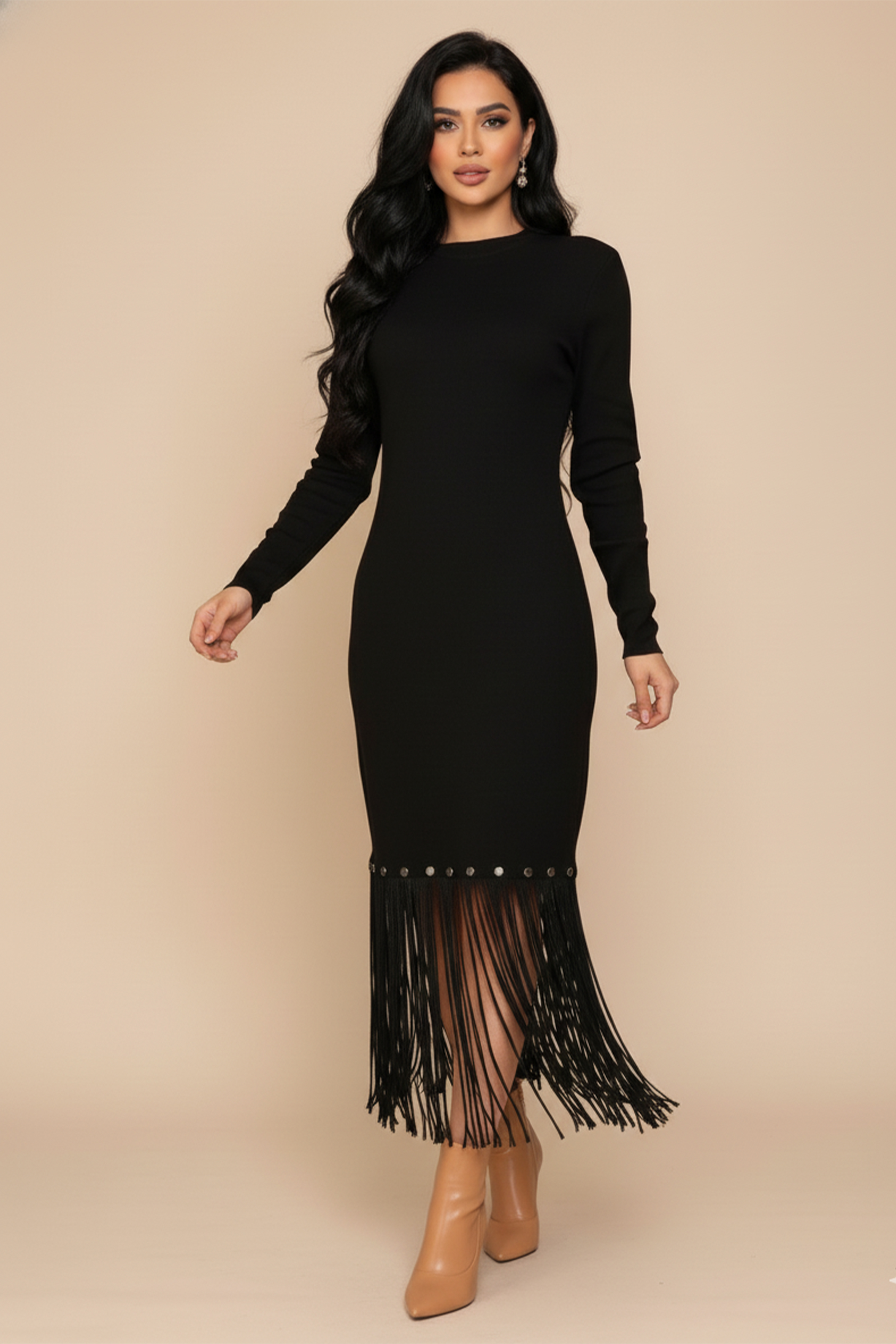 فستان شتوي مزين بهدب بأكمام طويلة لون اسود