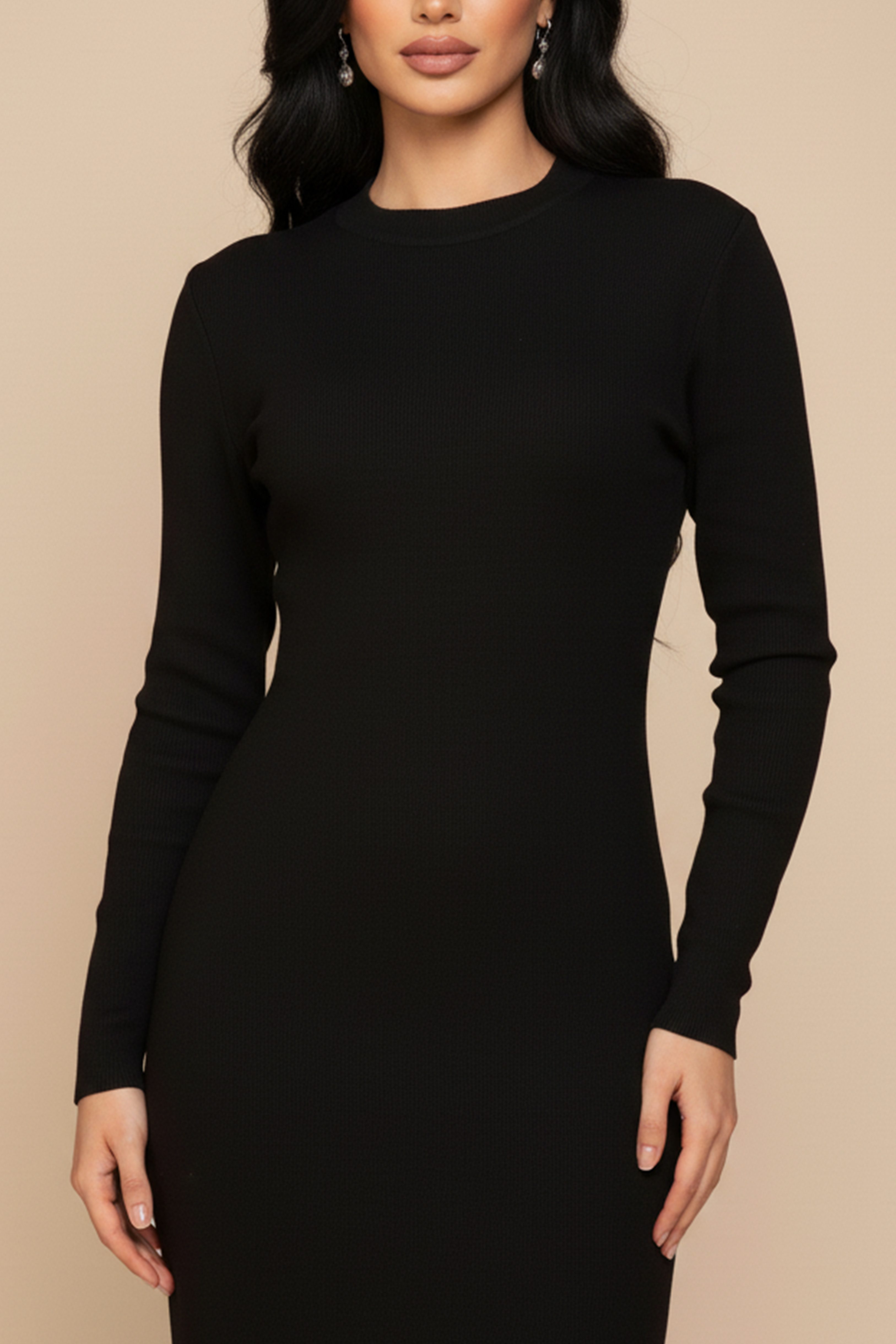 فستان سويتر ميدي شتوي أسود بياقة دائرية مزين بهدب وأزرار فضية وأكمام طويلة