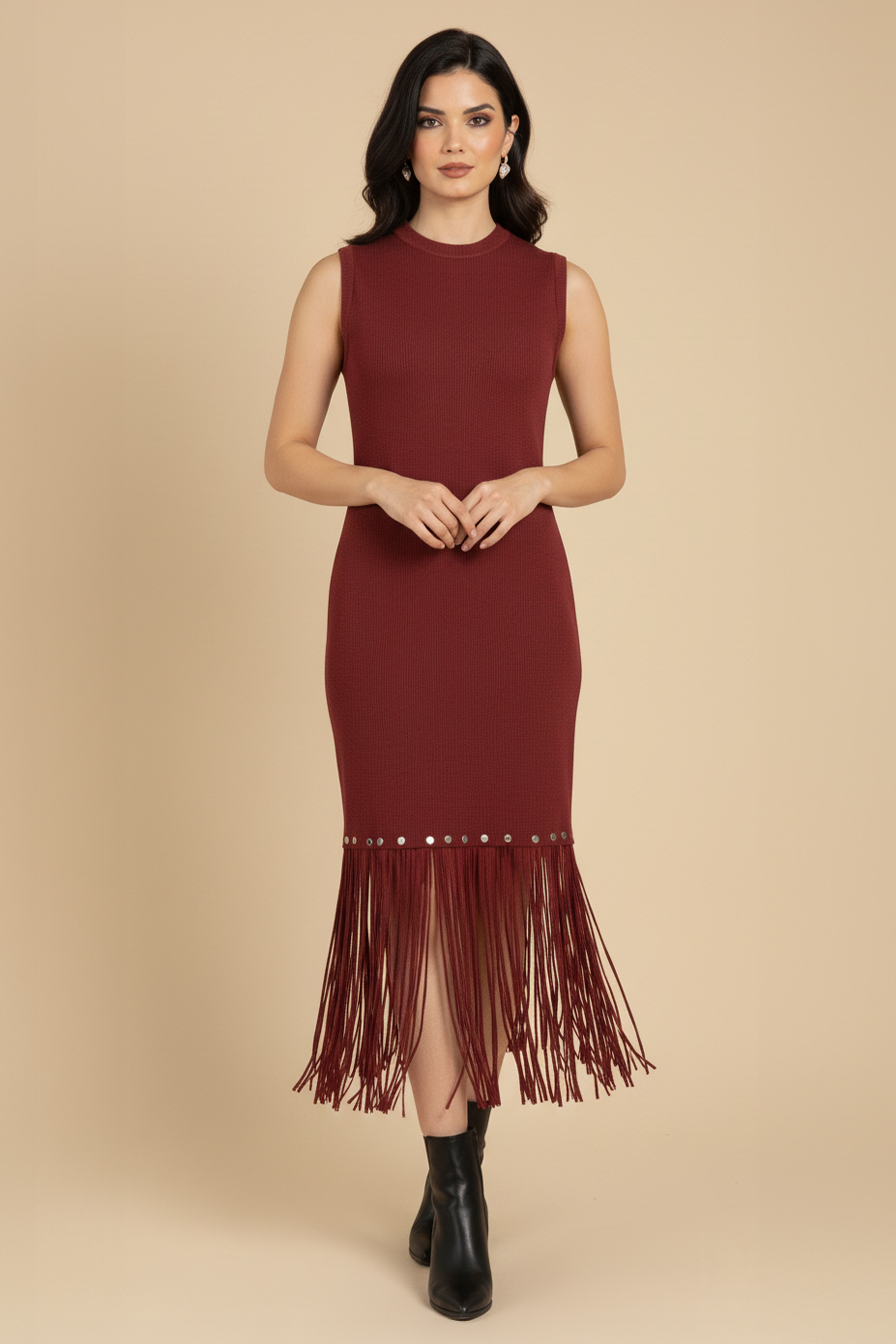 فستان شتوي مزين بهدب بأكمام كت لون كستنائي