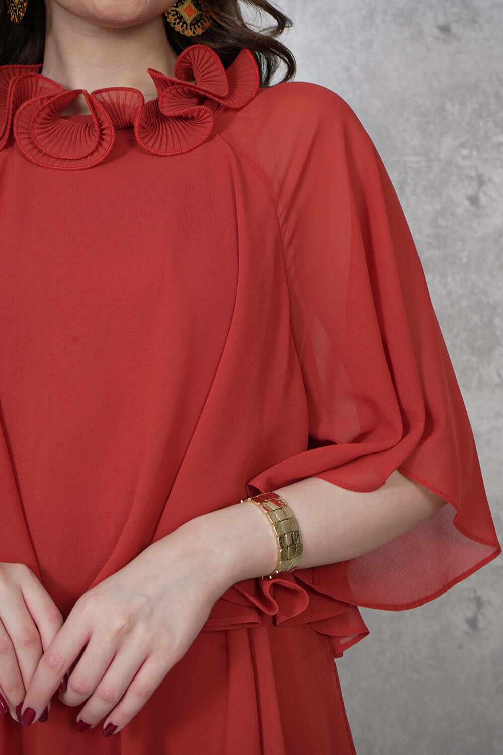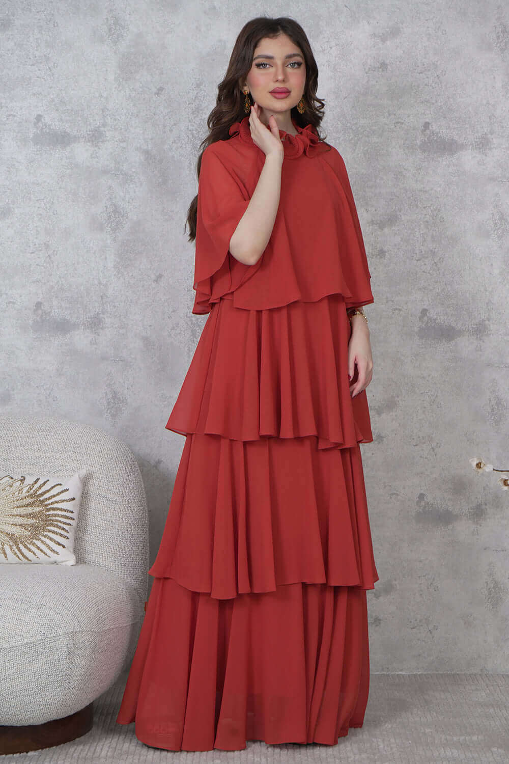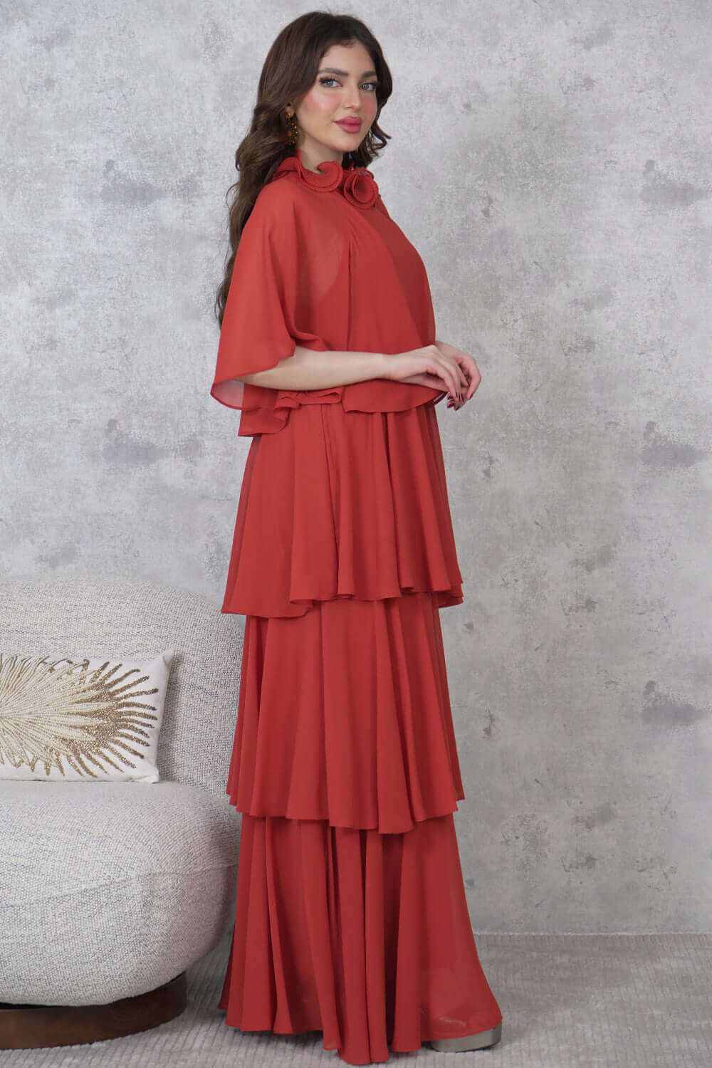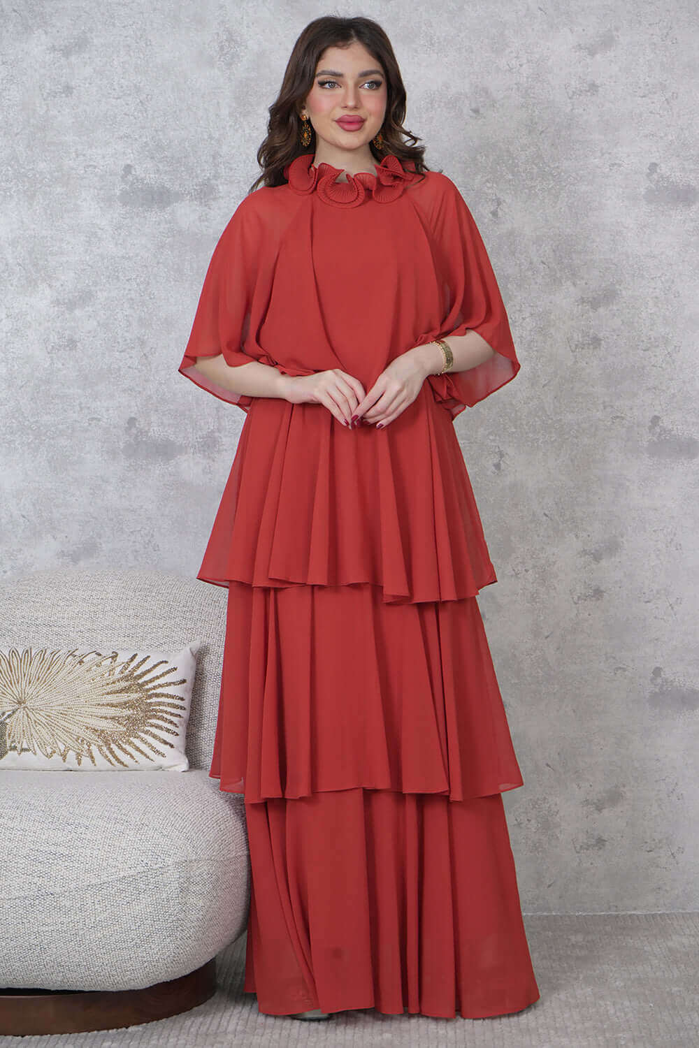 فستان شيفون طويل بطبقات مزمومة لون برتقالي