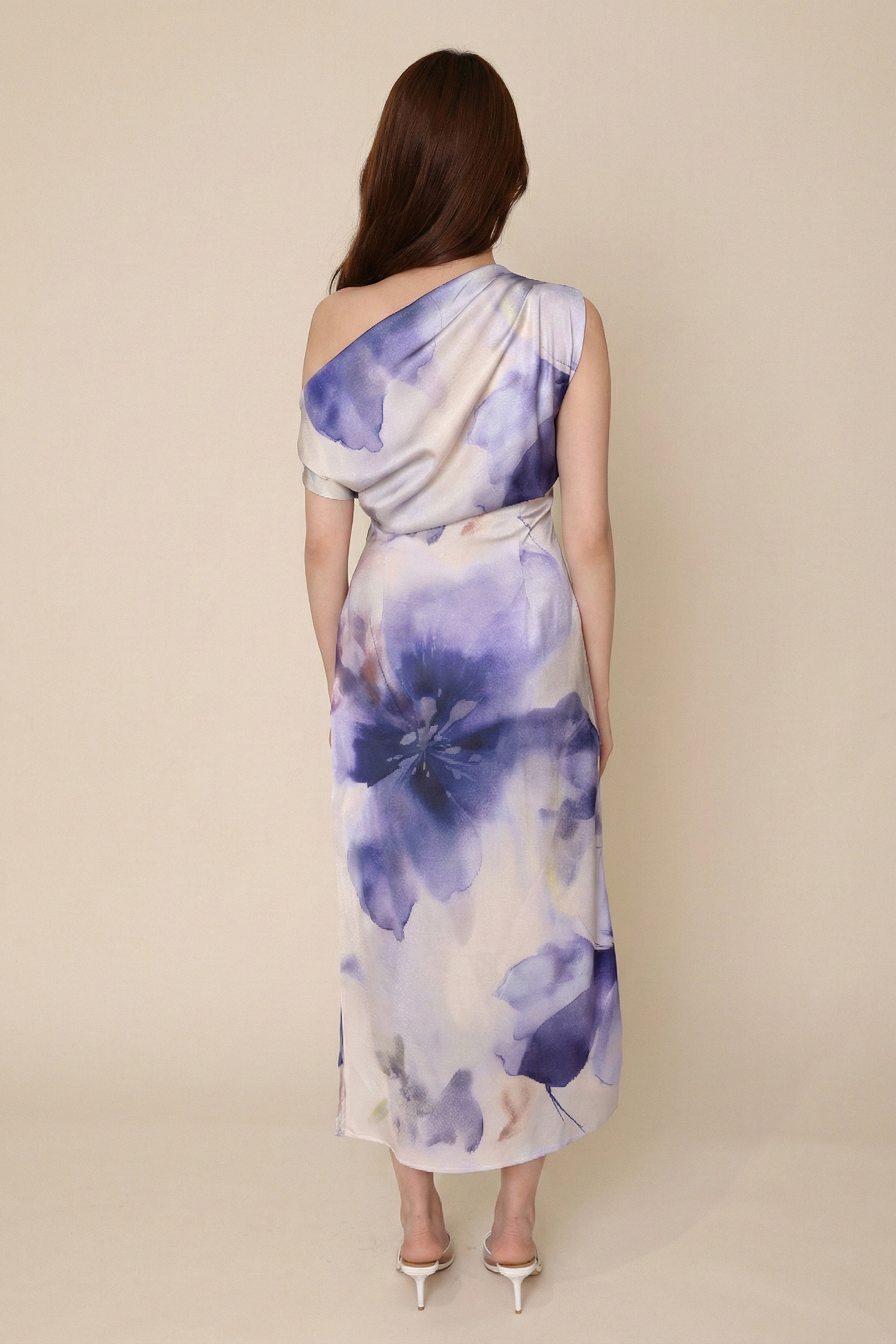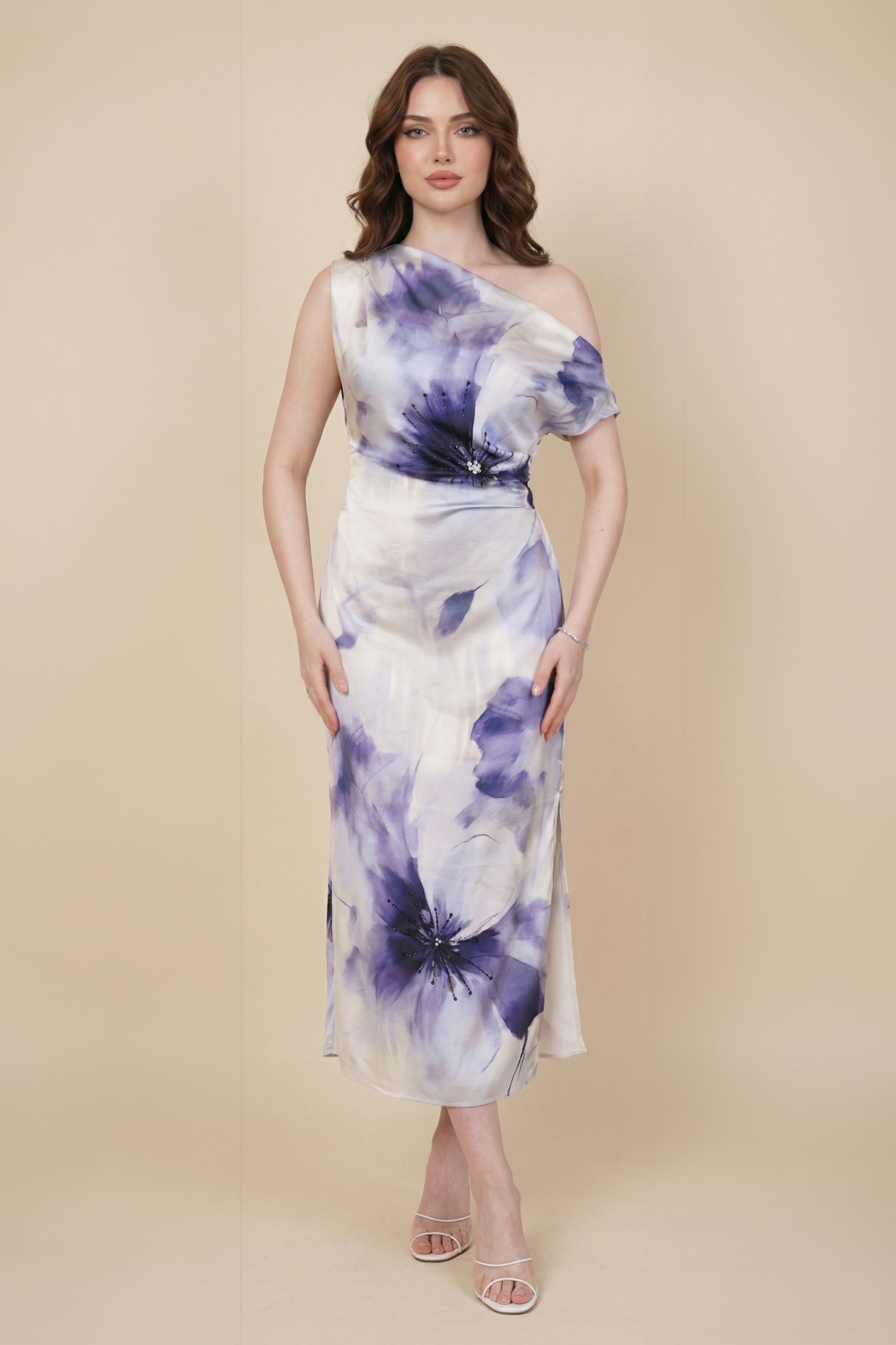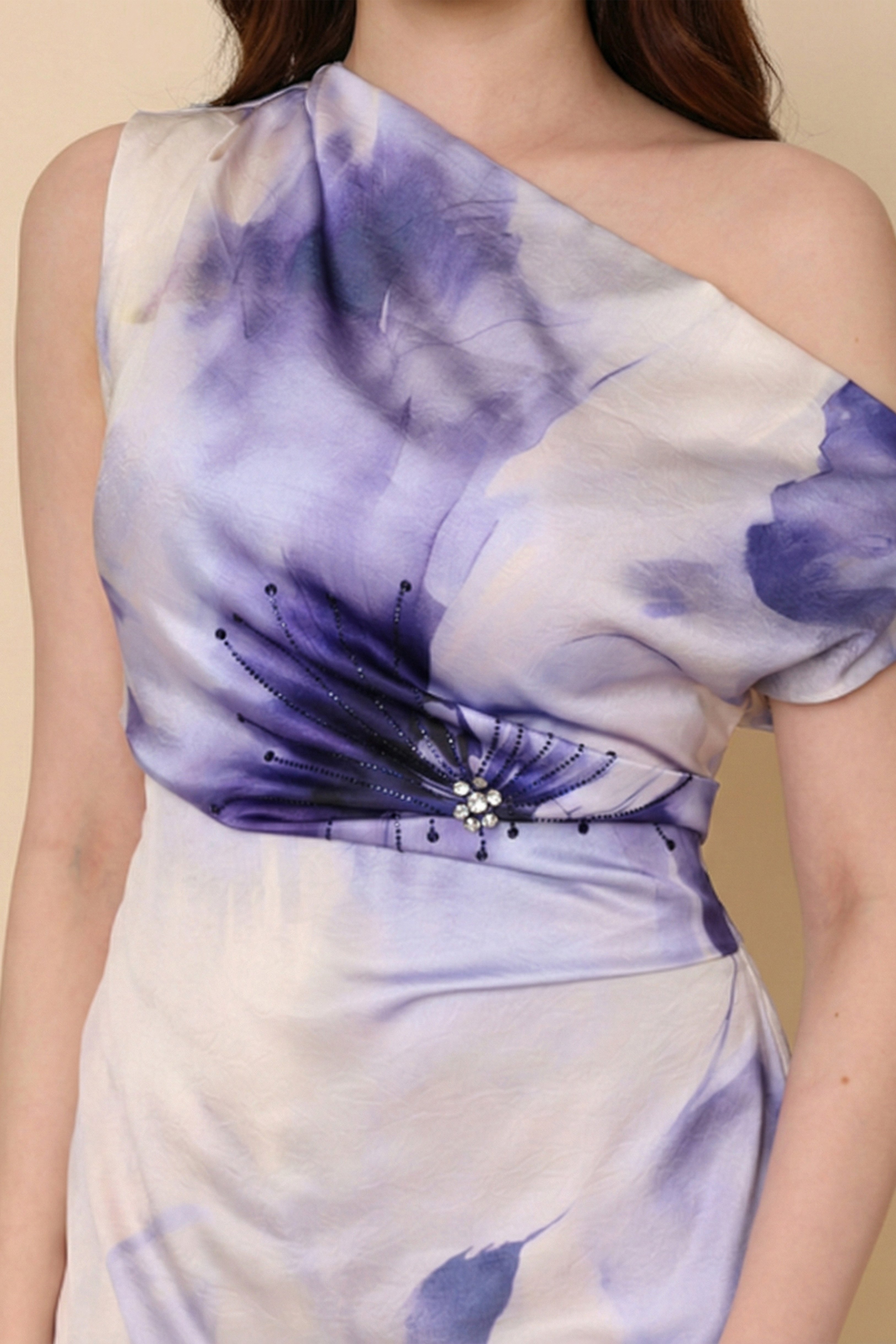 نوع القصة: فستان ضيق بطبعة أزهار درابية بفتحة من الجانب مزين بفصوص لامعة.