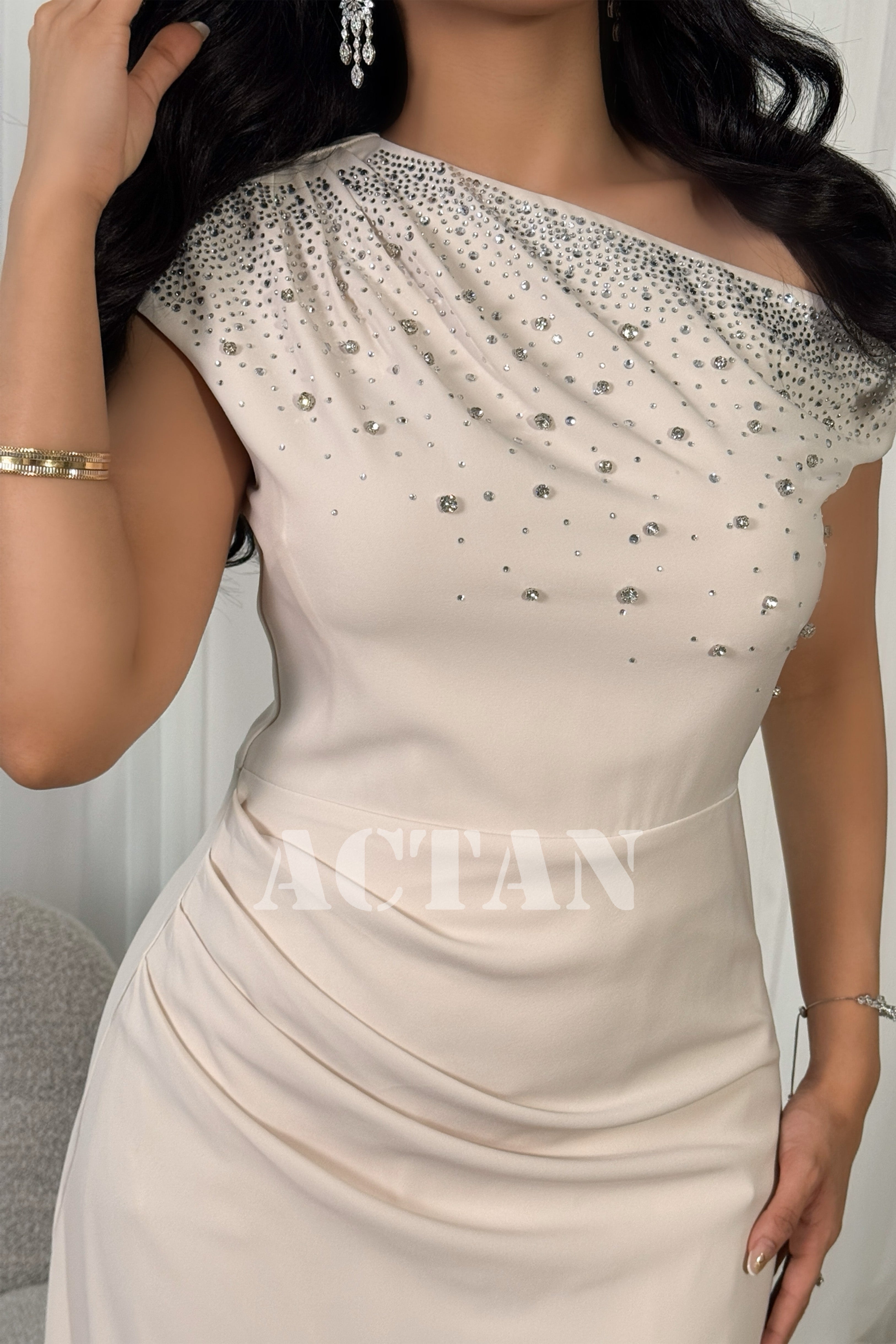 : فستان ضيق درابية بكتف واحد مزين بالفصوص