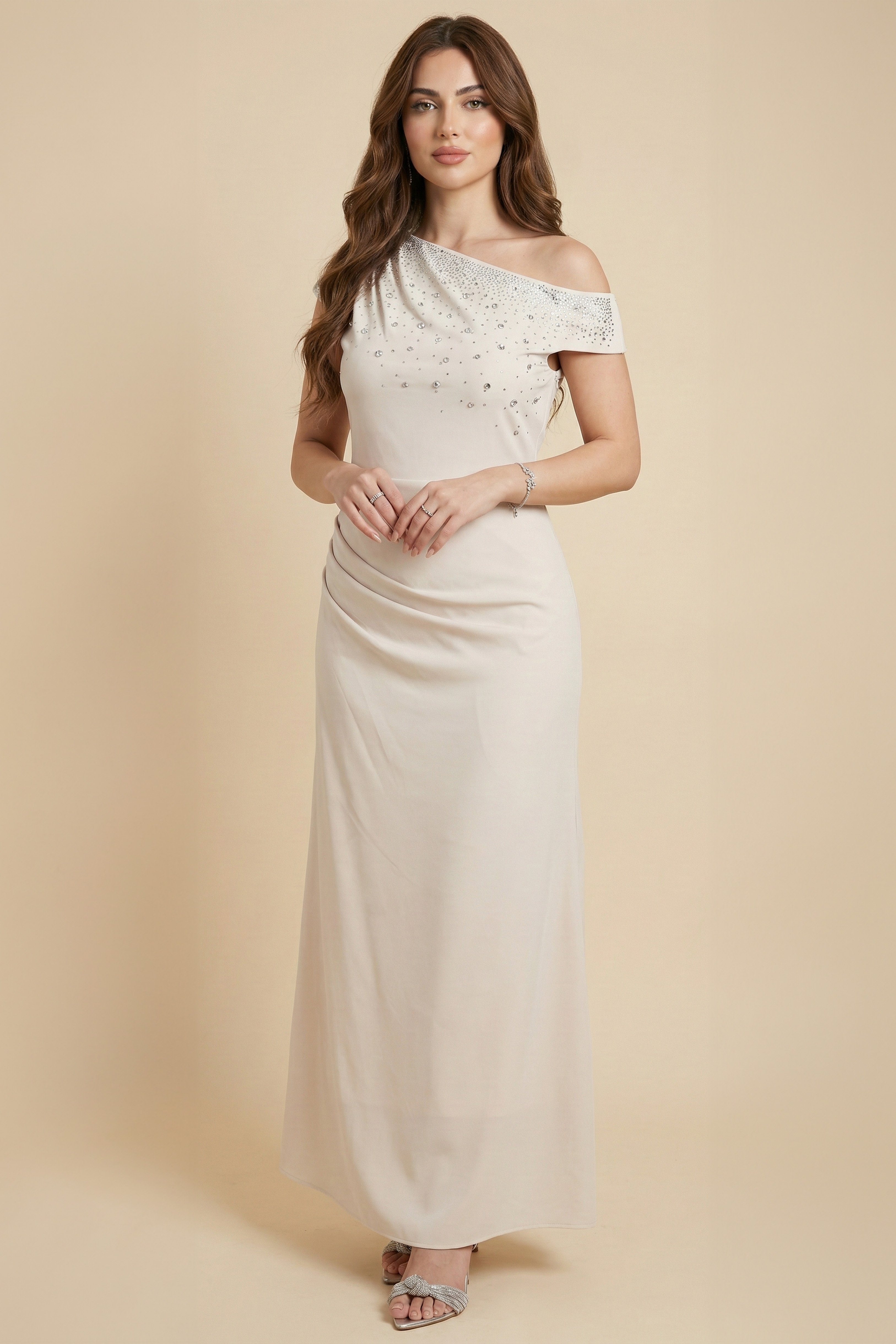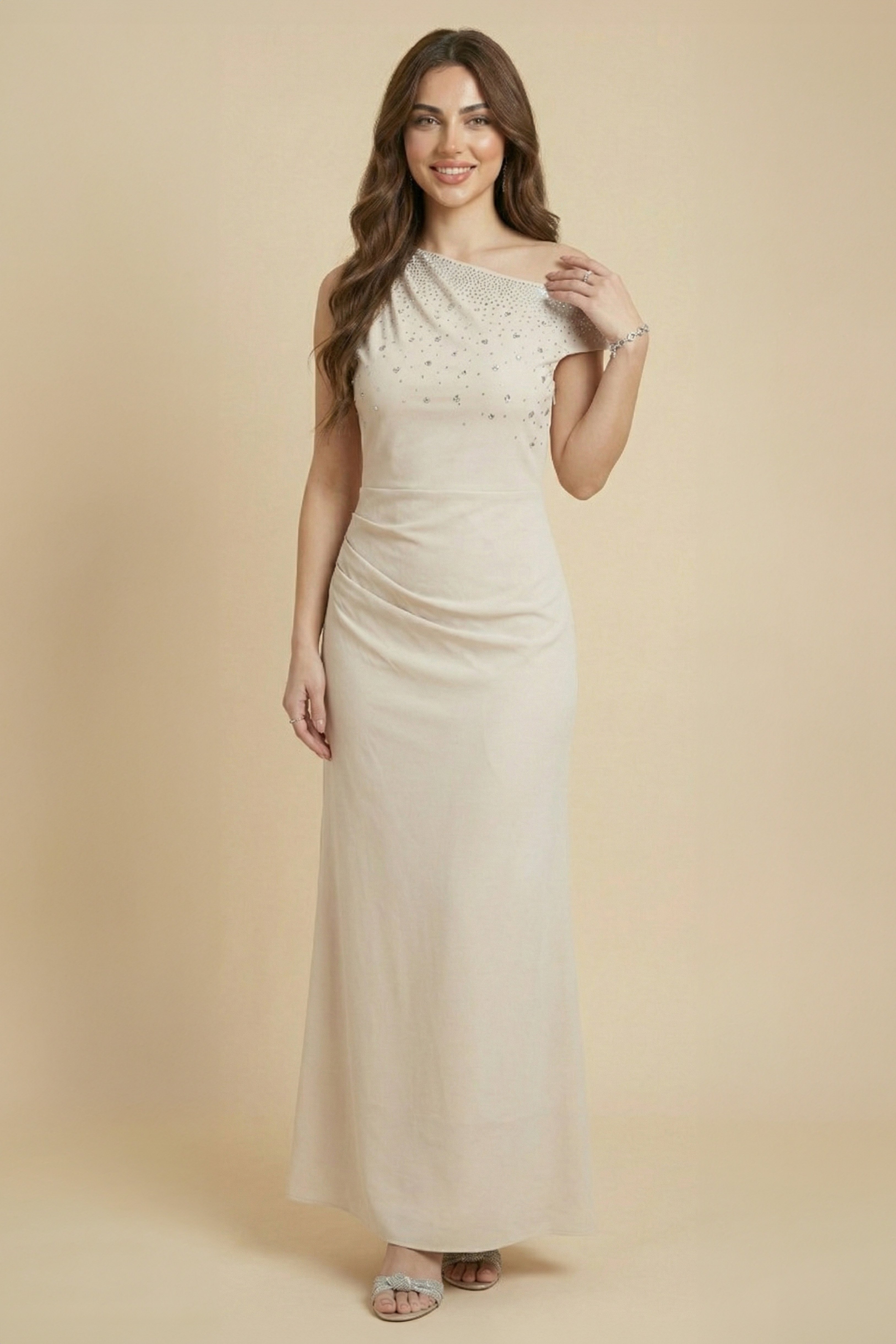 : فستان ضيق درابية بكتف واحد مزين بالفصوص
