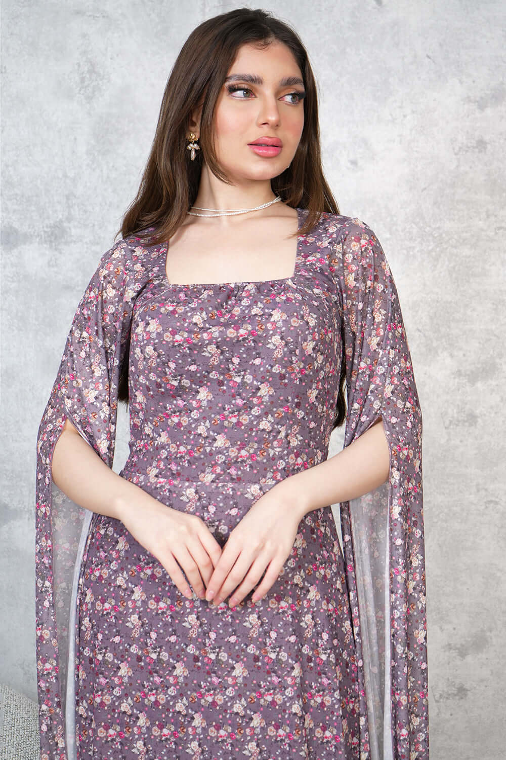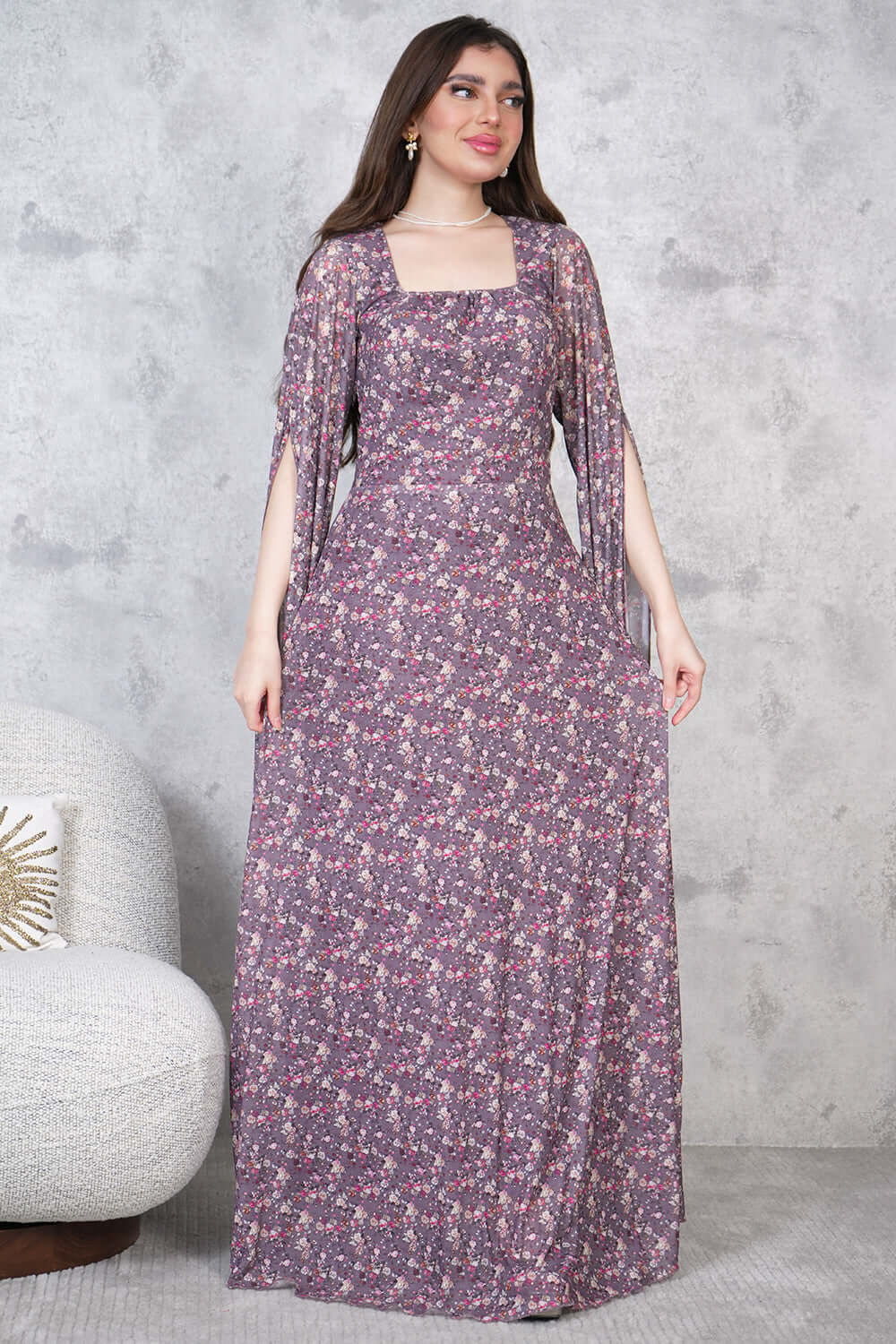 فستان طويل بطبعة ورود بكم كيب لون موف