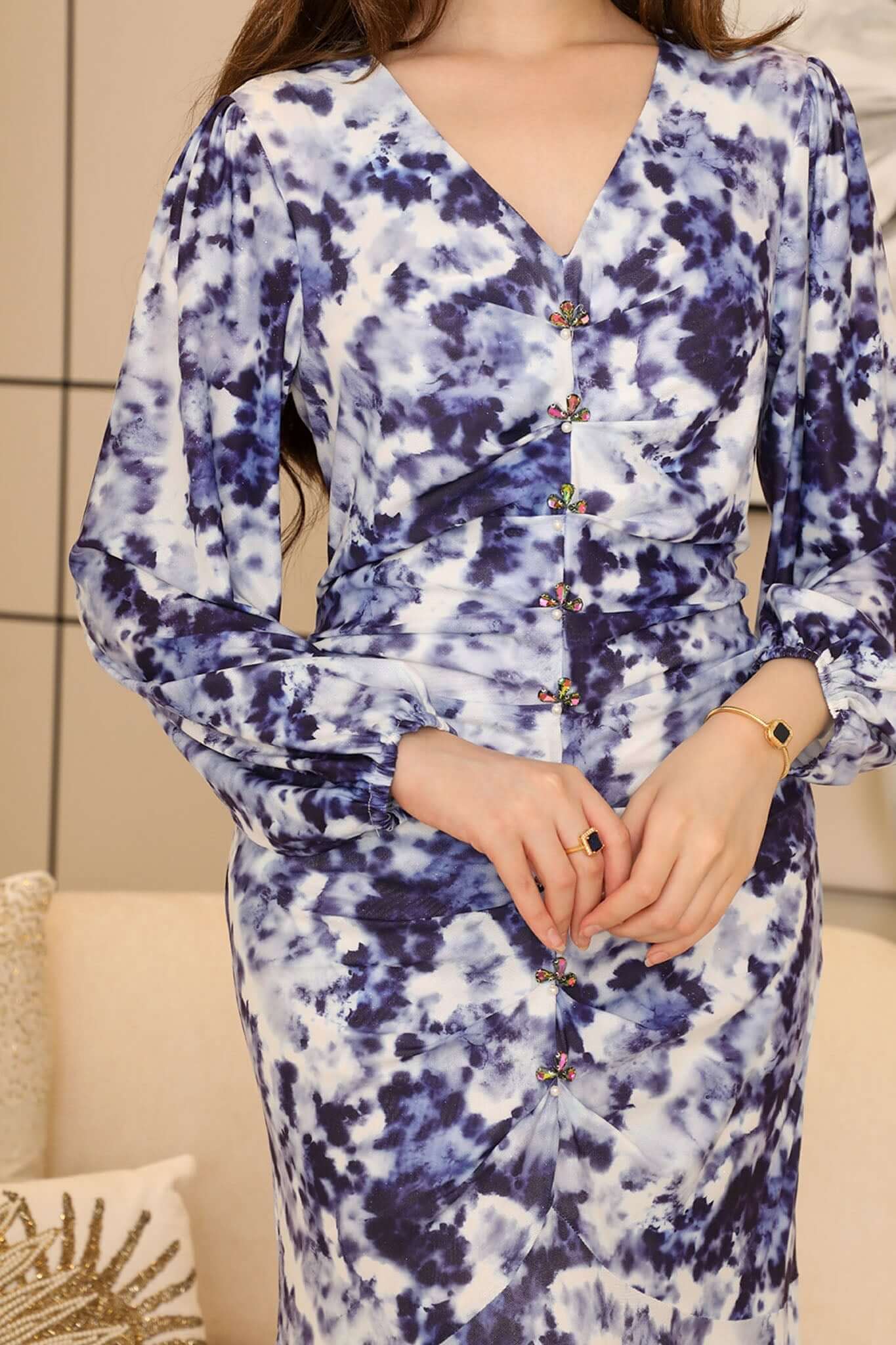 نوع القصة: فستان طويل درابيه مزين بكريستال بأكمام طويلة وياقة V