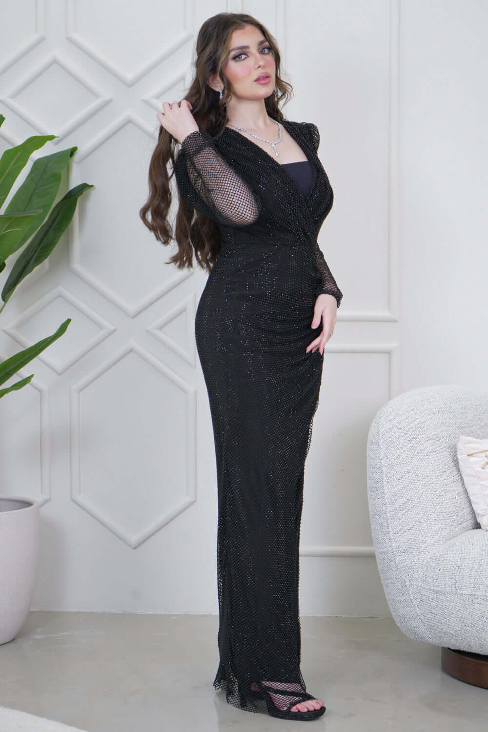 نوع التصميم فستان طويل شبك مزين بالفصوص نوع القصة فستان طويل شبك مزين بالفصوص بفتحة من الأسفل بأكمام طويلة و ياقة v المناسبه خروج عام او مناسابات خاصة الخصر ضيق الياقه v الاكمام طويلة