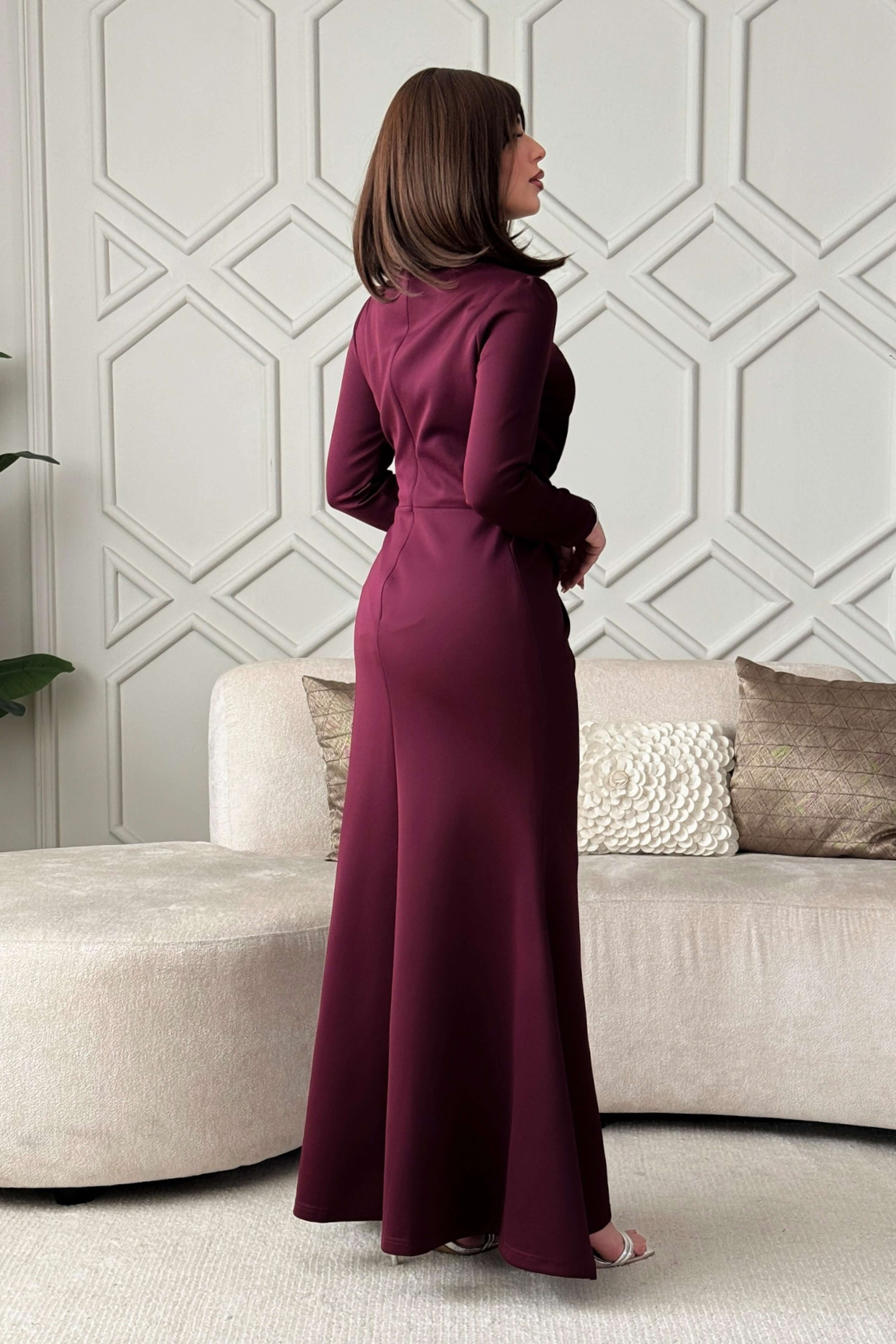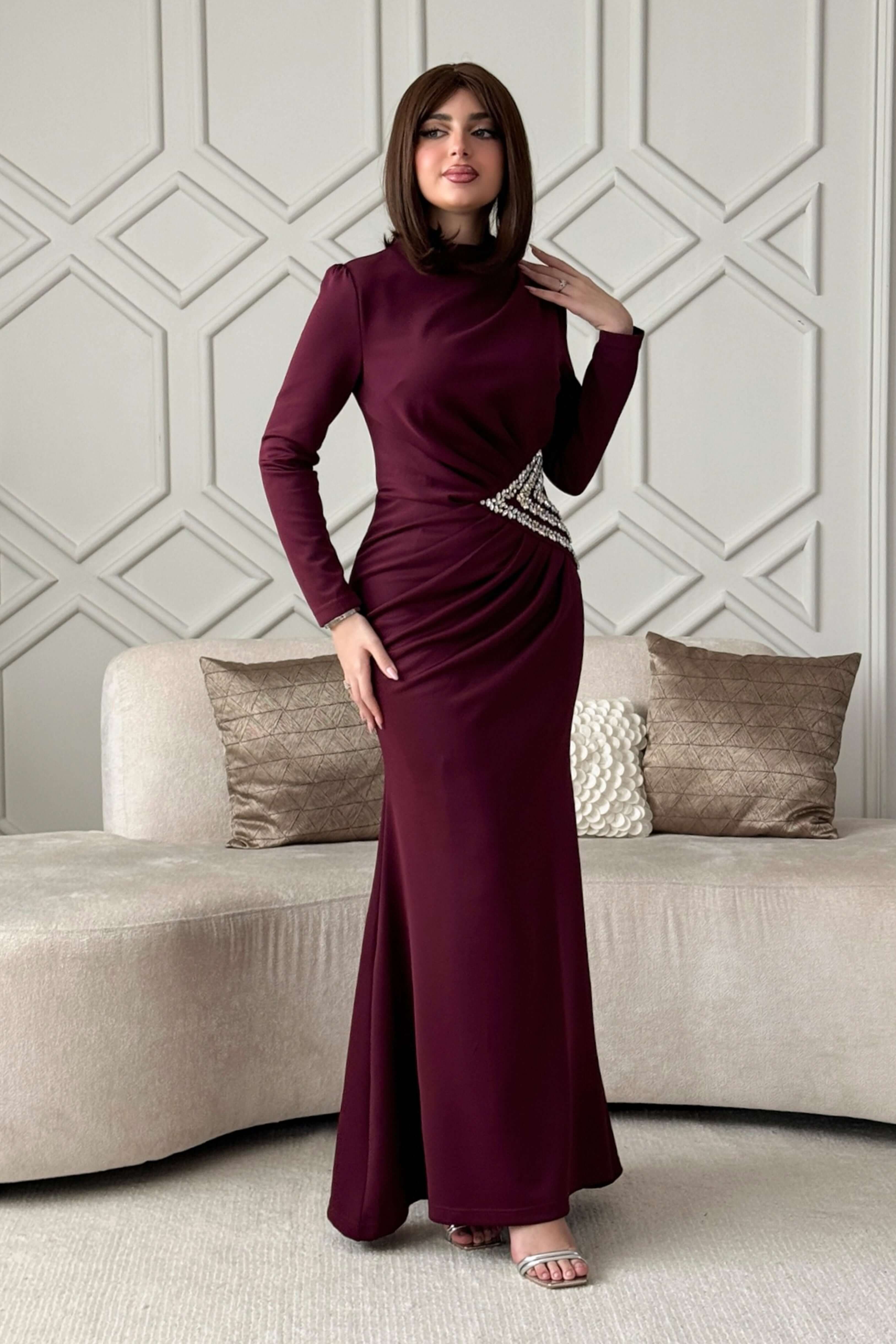 فستان طويل بقصة درابيه مزين بالكريستال، بأكمام طويلة وياقة دائرية ضيقة