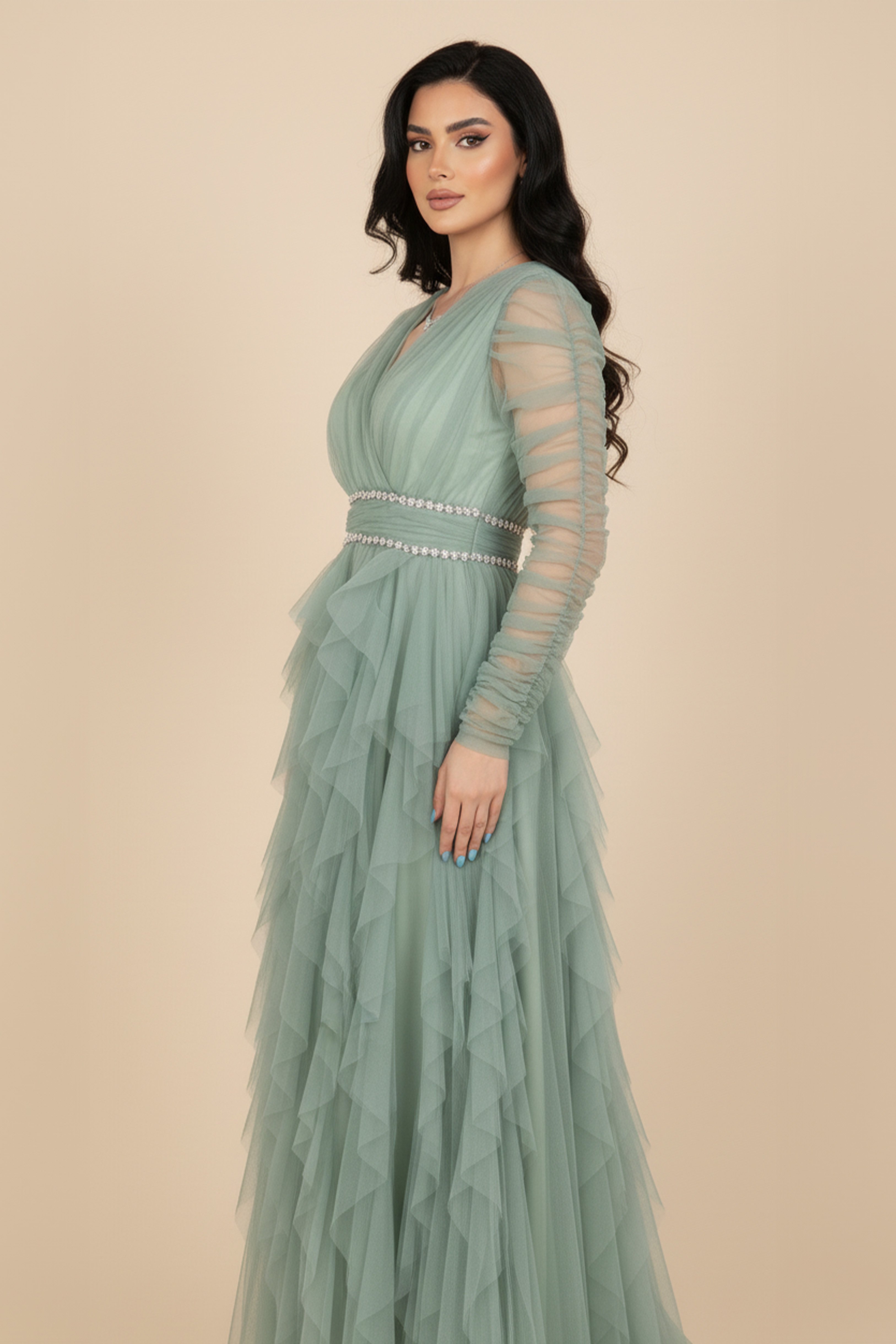 نوع التصميم: فستان سهرة بطبقات كشكش وتطريز على الخصر