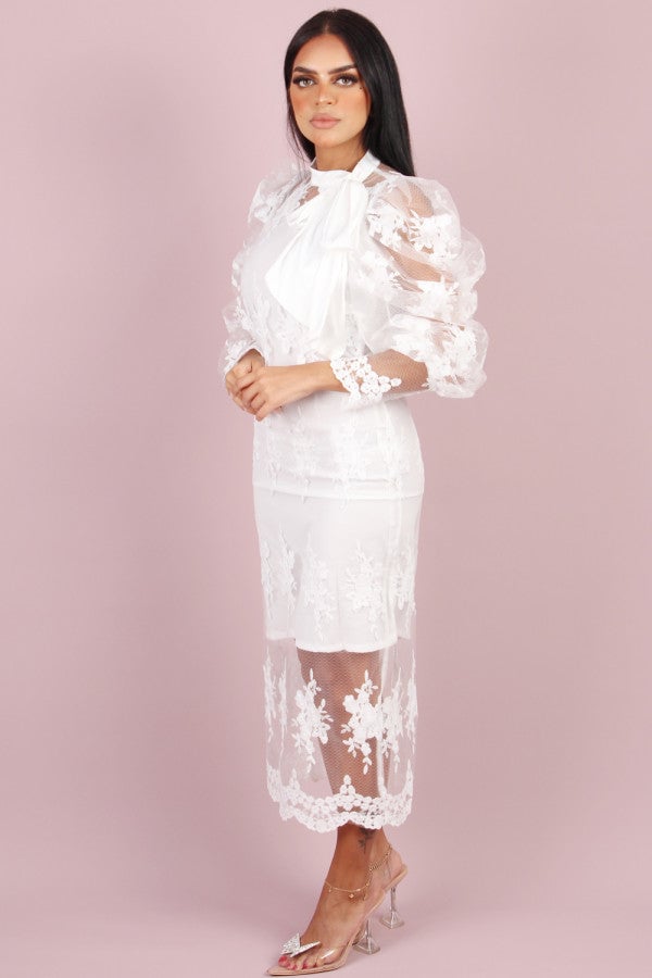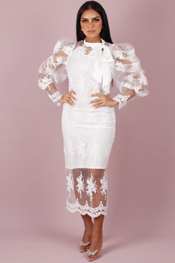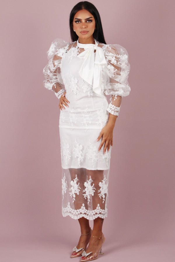 • نوع القصة: ميدي ضيق مع بلوزة بأكمام تيشوب وياقة عالية بفيونكة