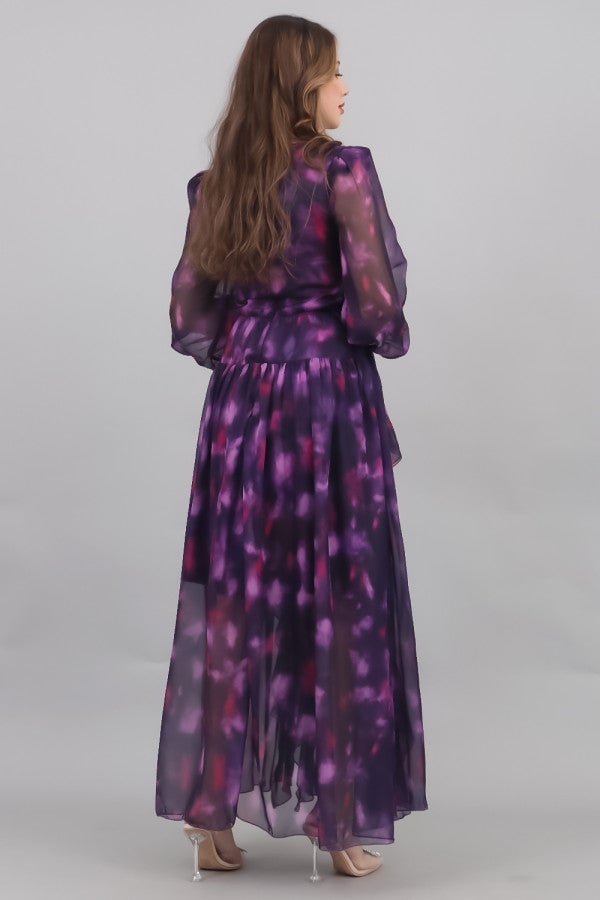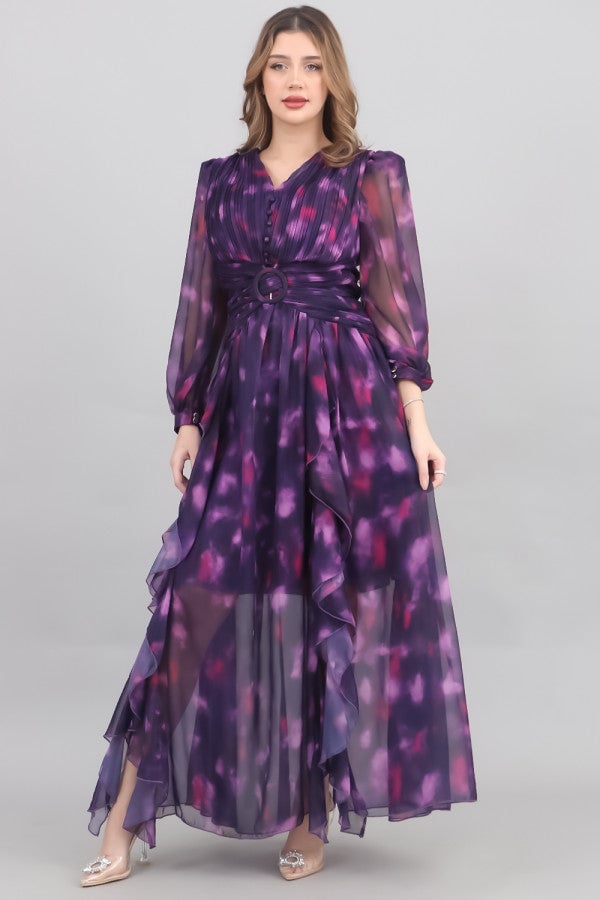 فستان كلوش طويل بتصميم مقسم ومزين بكشكش