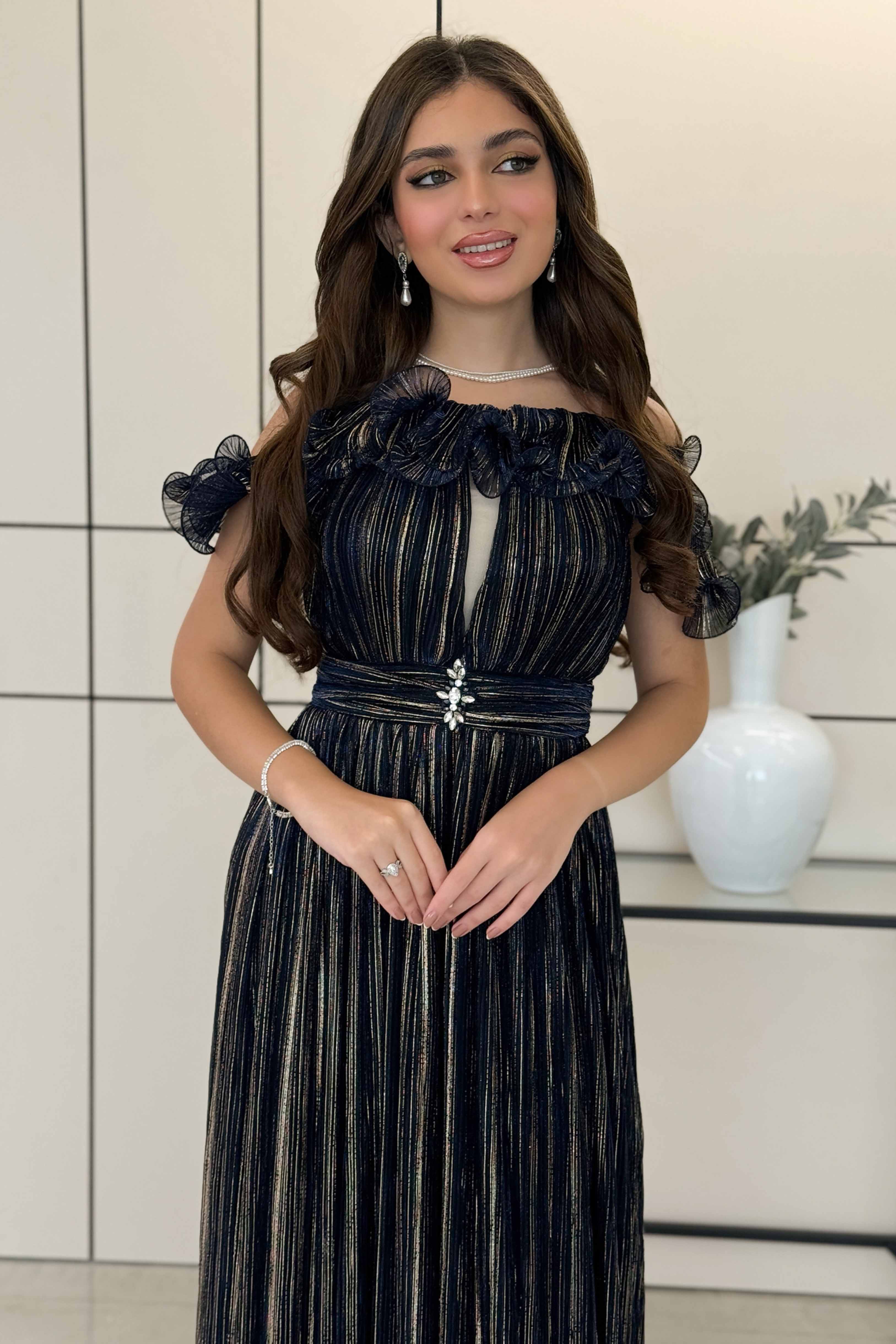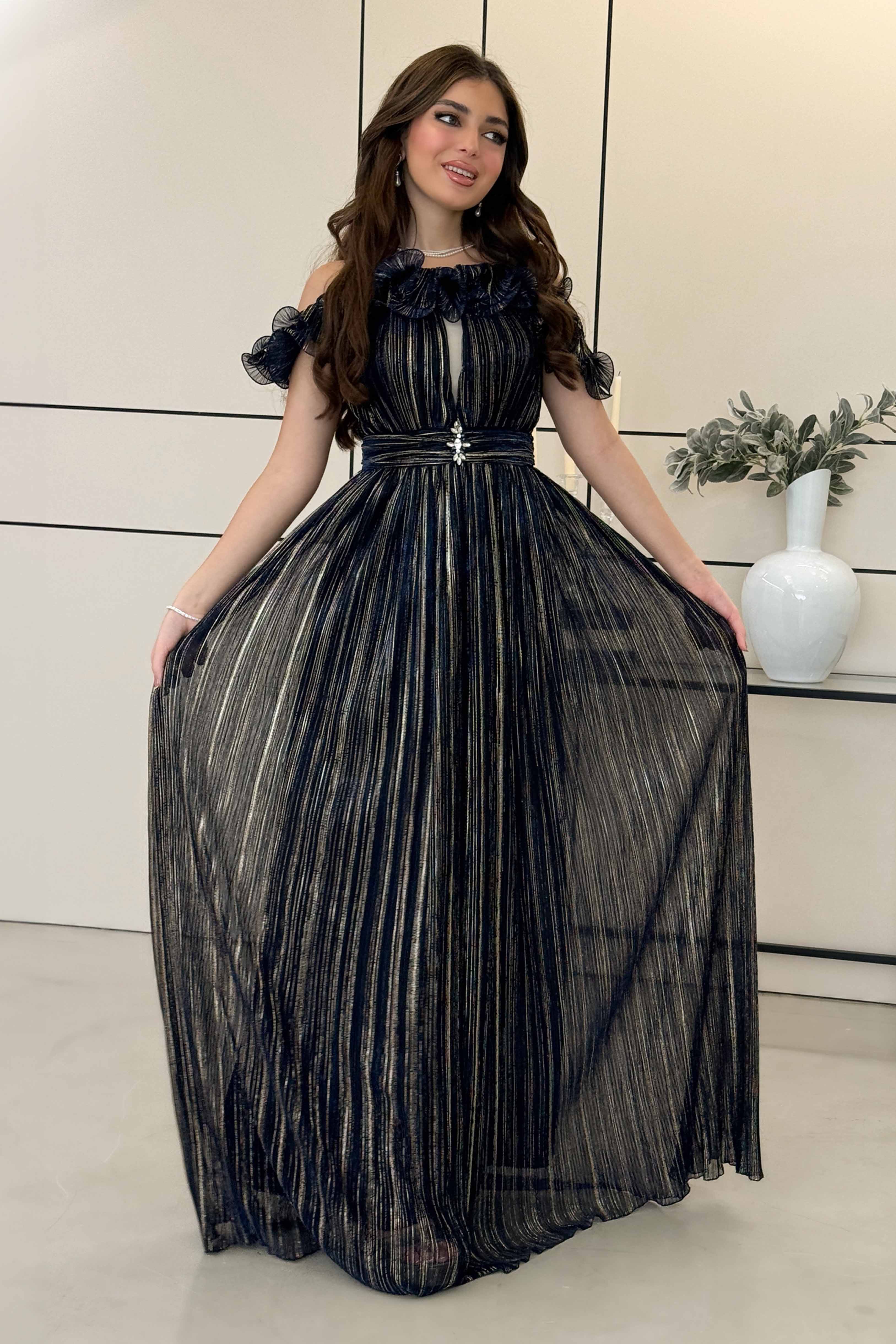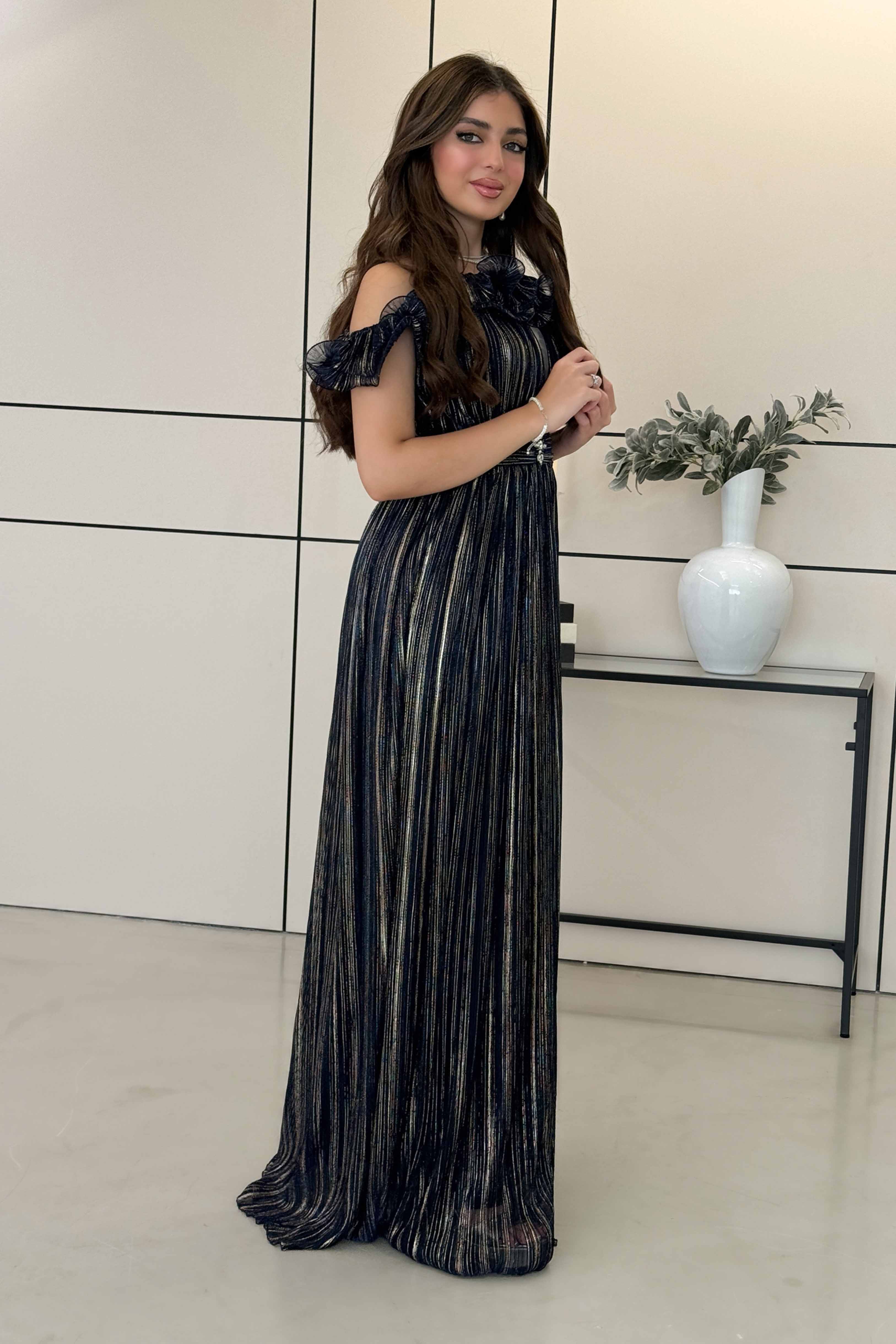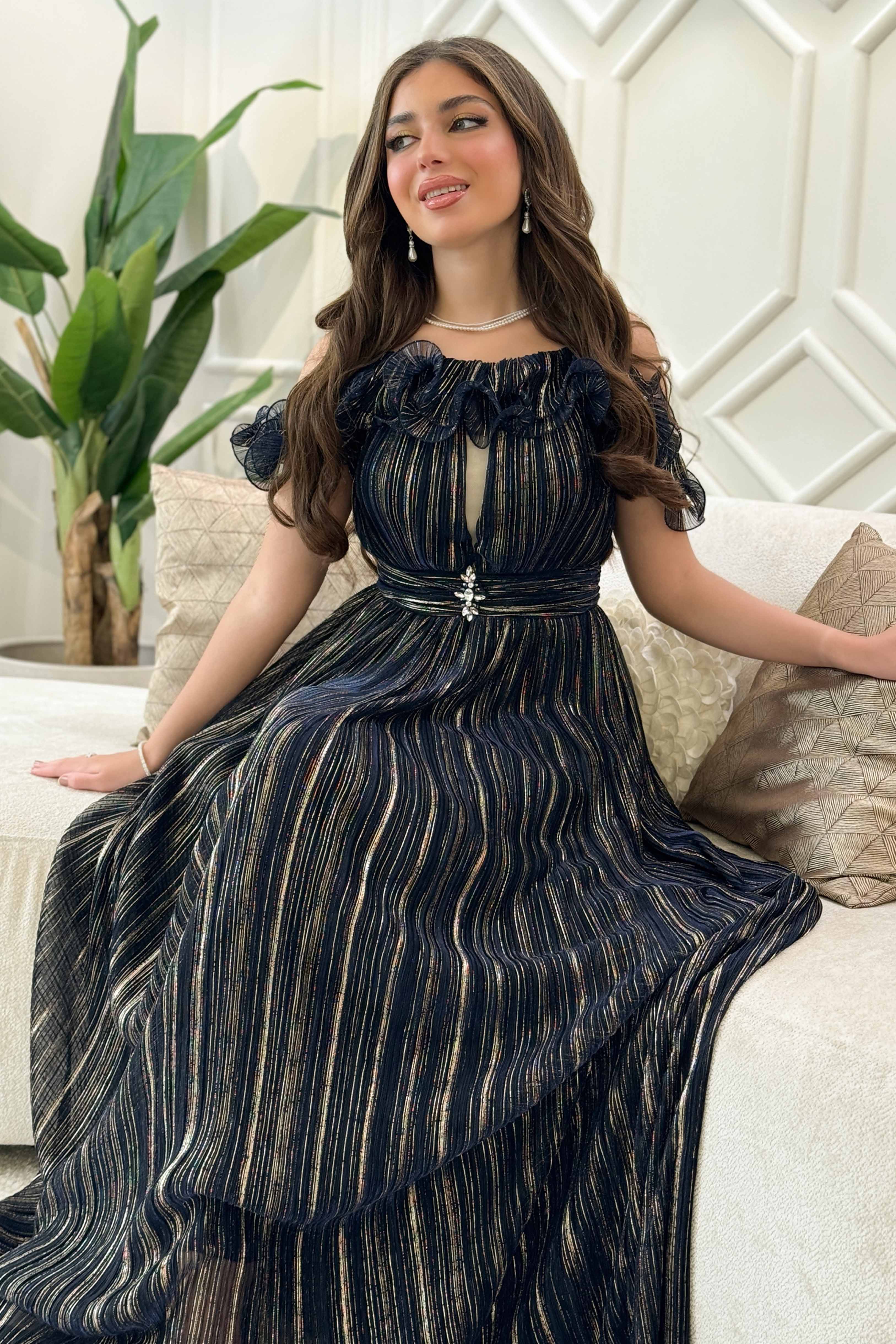 فستان أوف شولدر طويل بخطوط ذهبية ومزين بكريستال