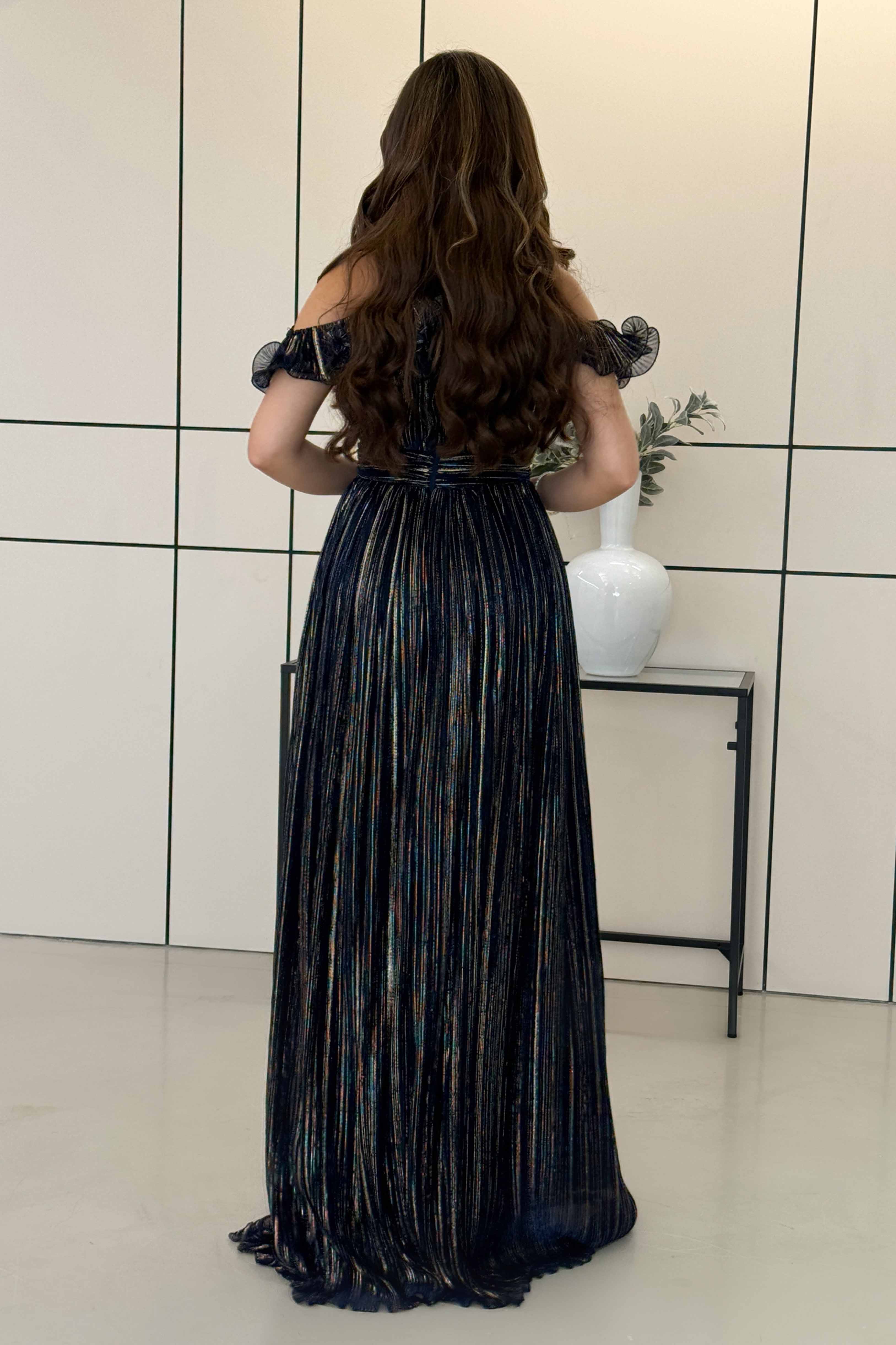 فستان لامع اوف شولدر طويل لون كحلي