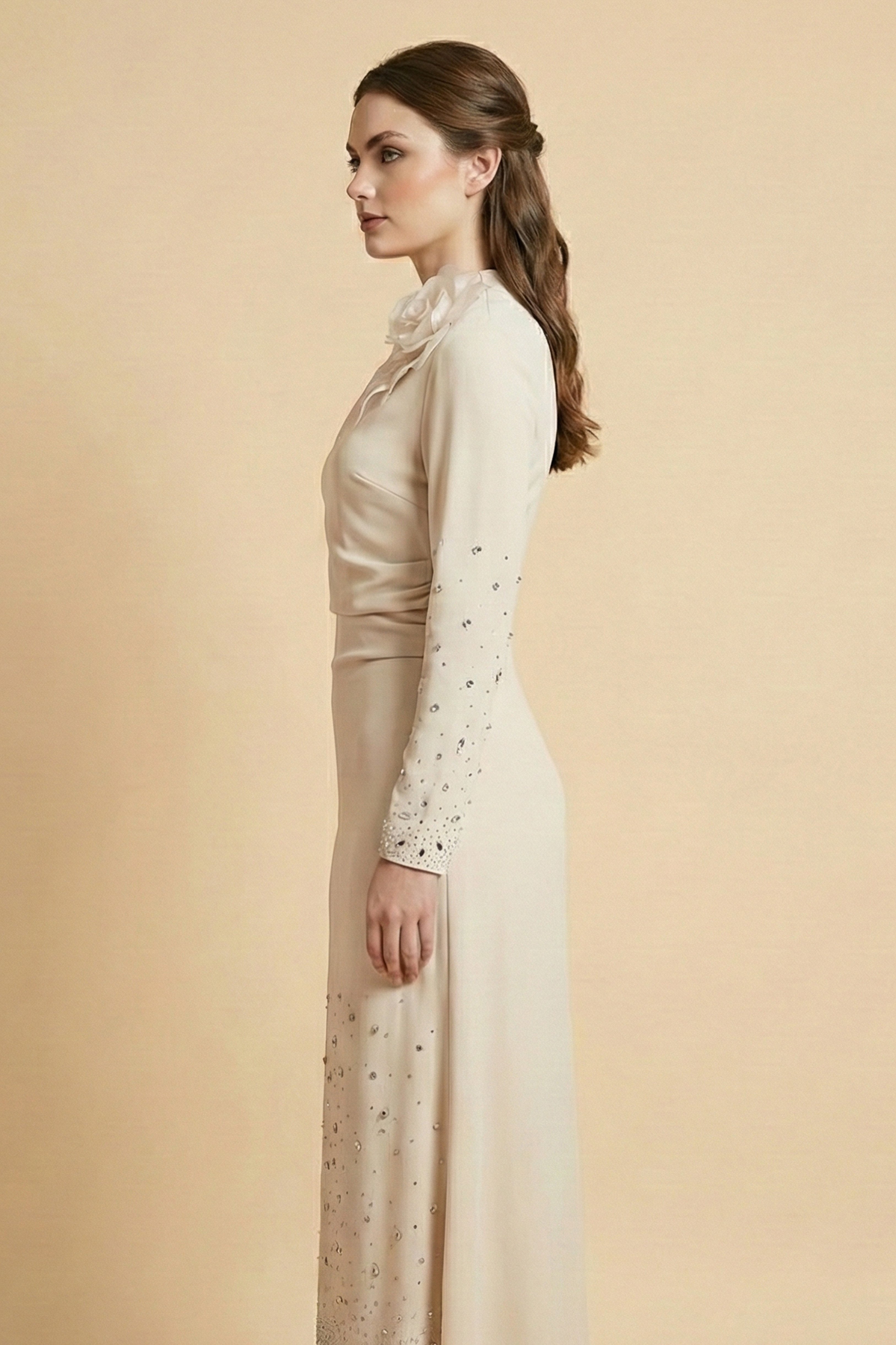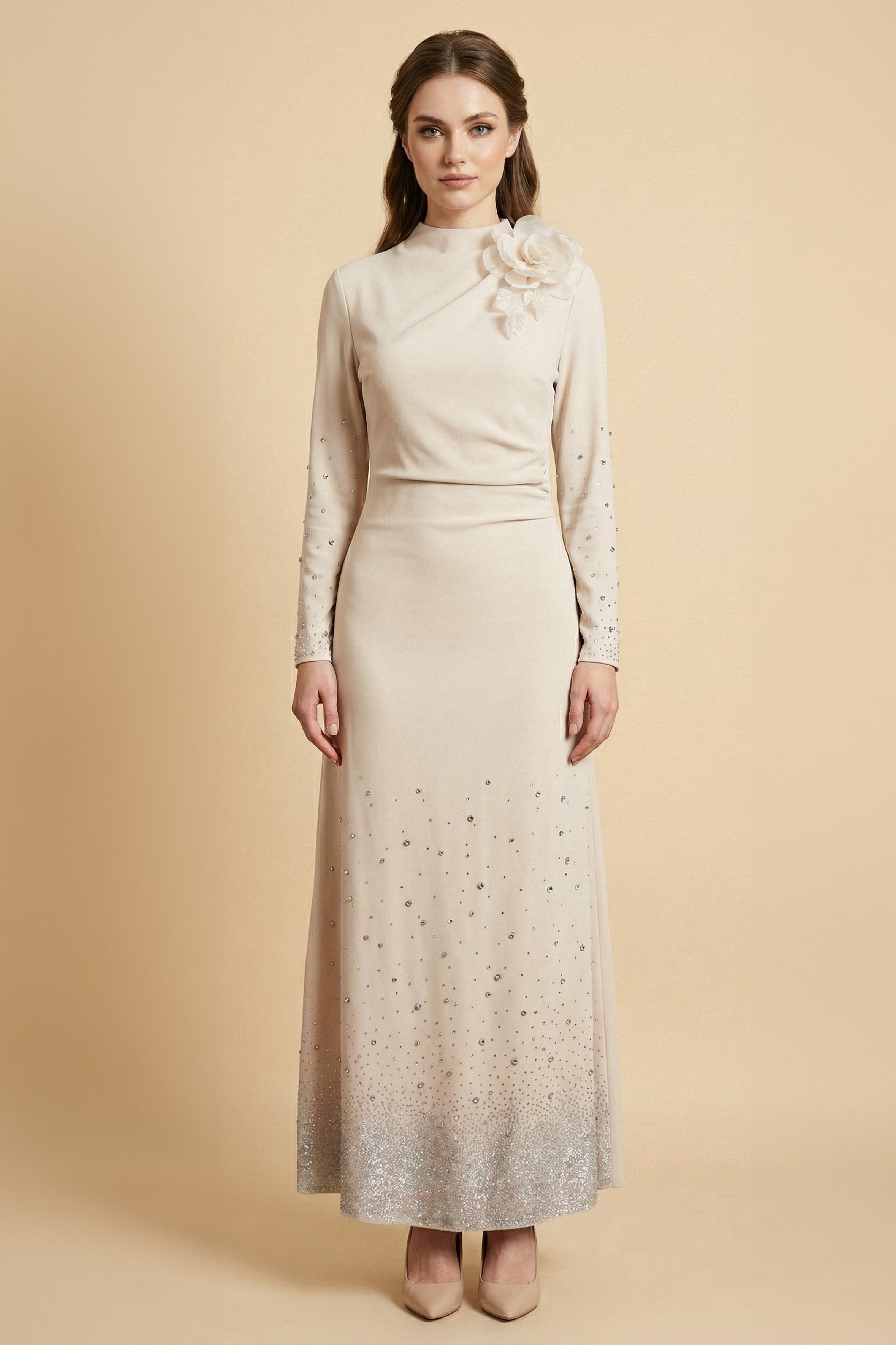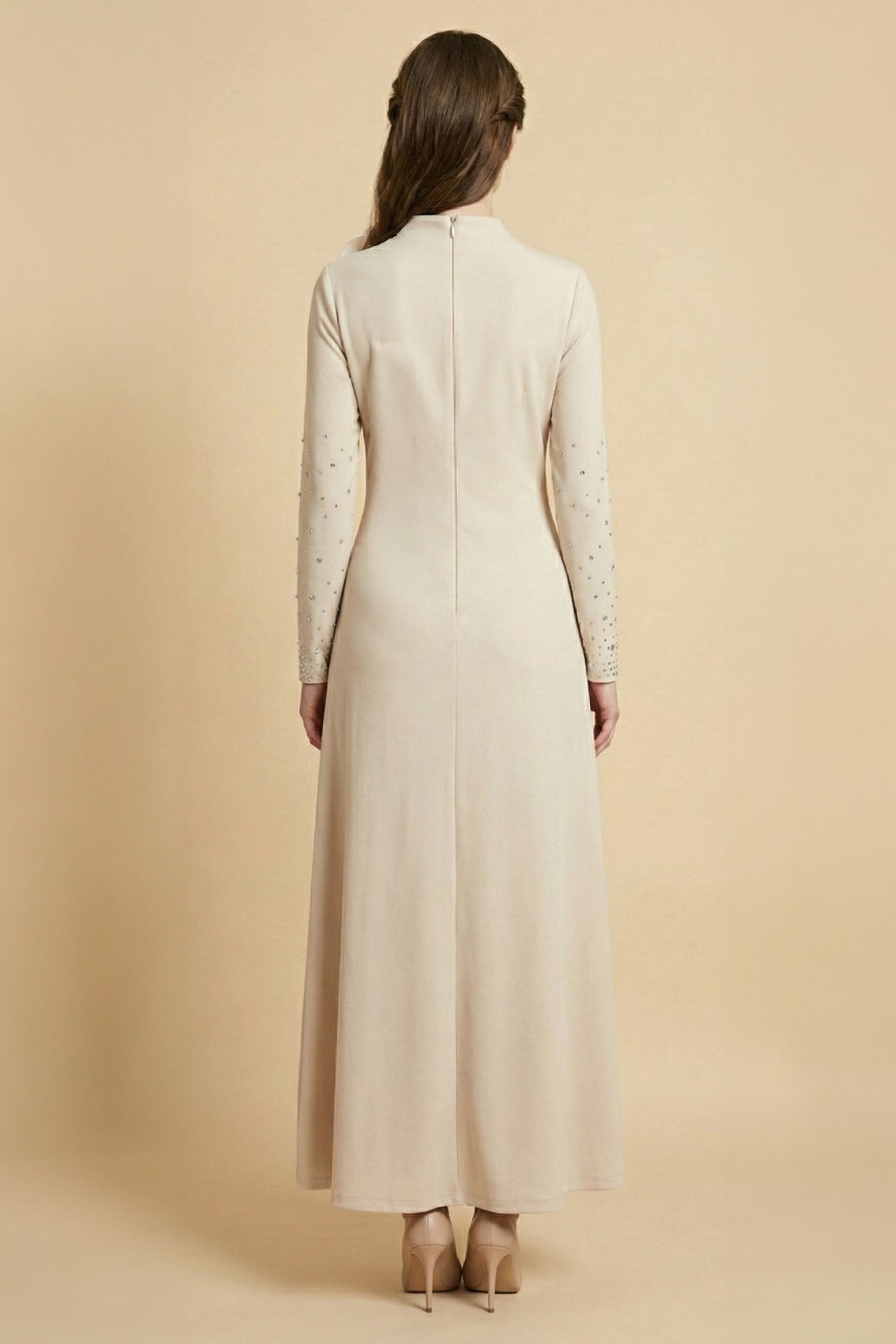 نوع القصة: فستان ماكسي بأطراف مزينة بفصوص بأكمام طويلة وياقة دائرية ضيقة