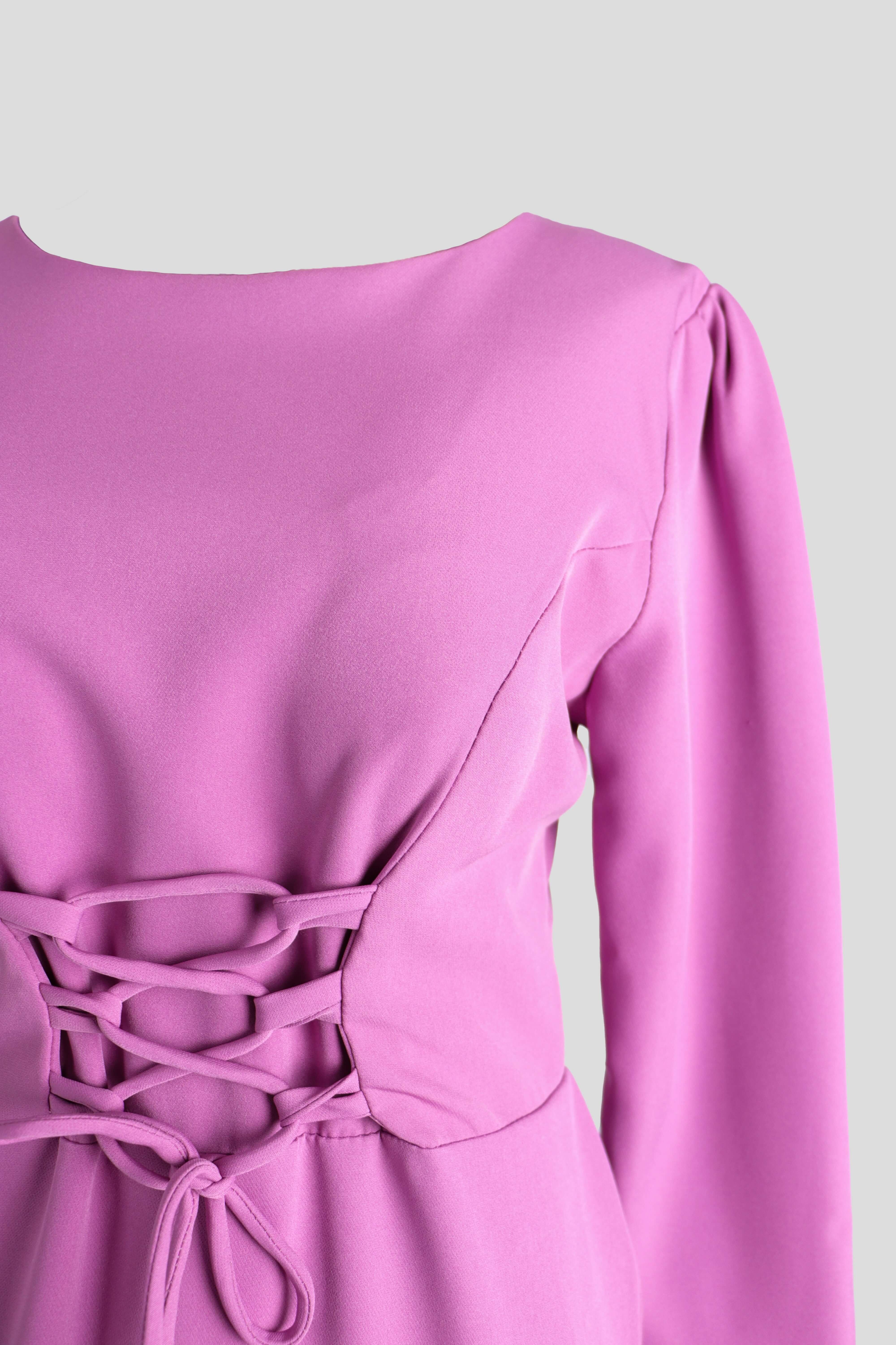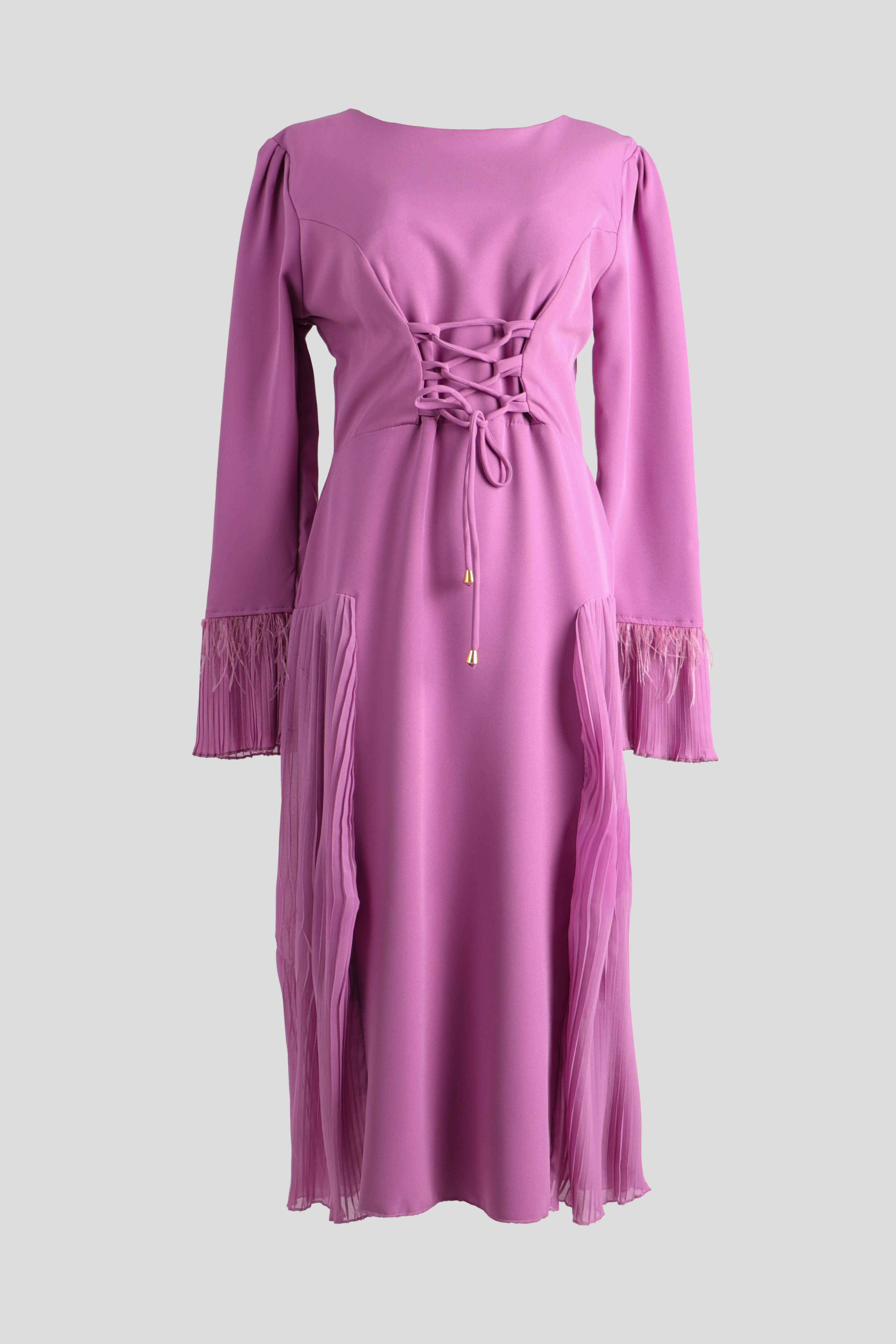 فستان ميدي بتصميم بليسيه من الجوانب، برباط على الخصر، بكم طويل وياقة دائرية